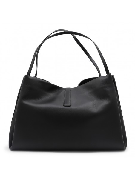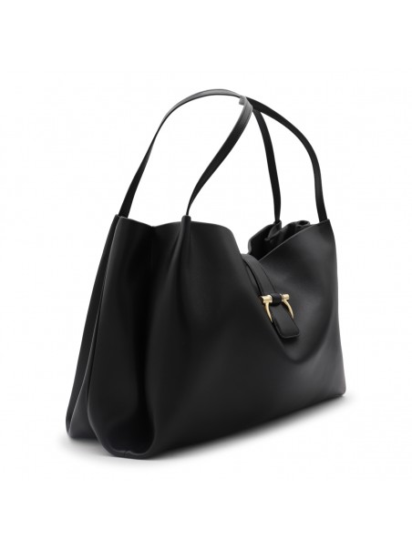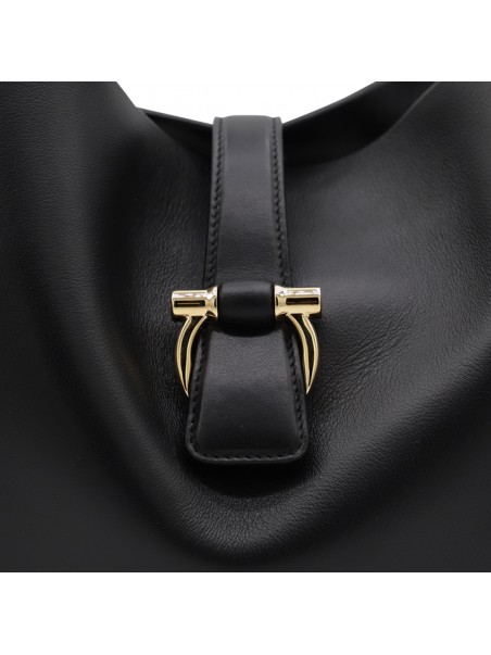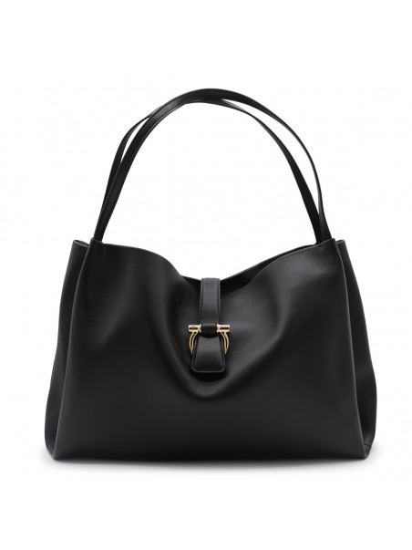 Black leather shoulder bag from Ferragamo featuring handles, frontal fastening, gold tone hardware and inside pocket.