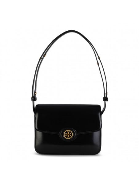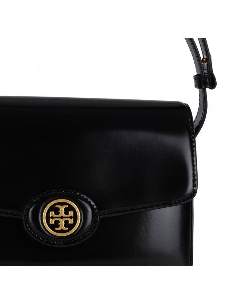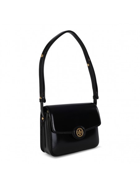 Black leather Robinson shoulder bag from Tory Burch featuring patent finish, gold tone logo, adjustable shoulder strap, main compartment and internal pocket.