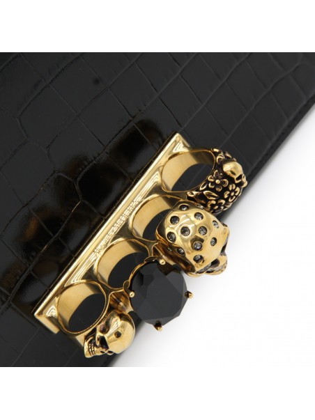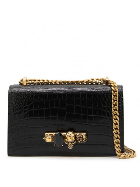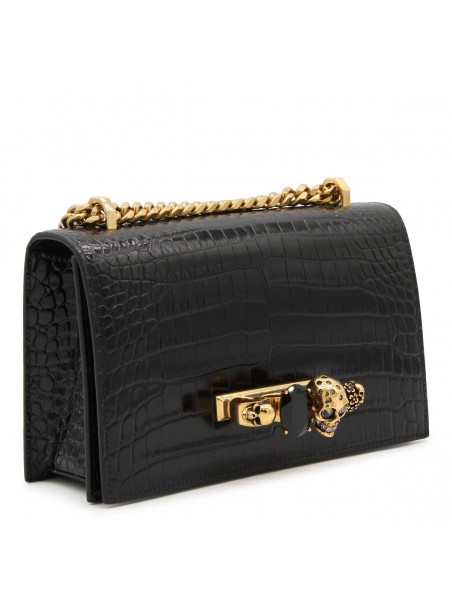 Black leather shoulder bag from McQueen featuring crocodile effect, chain shoulder strap, gold-tone metal hardware, foldover top with magnetic fastening, main compartment, internal zip pocket and card slot.