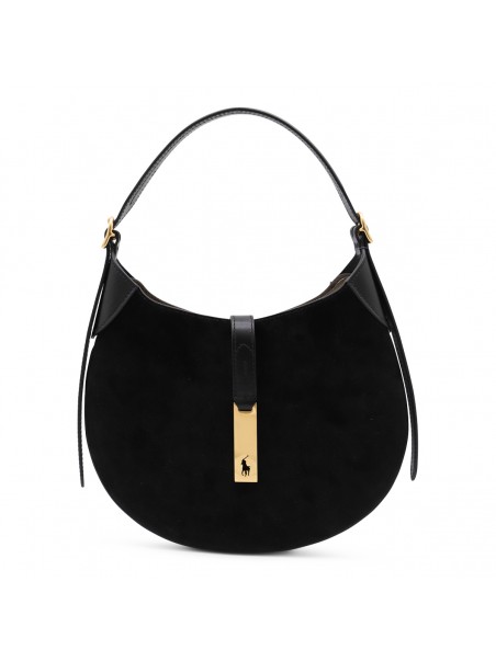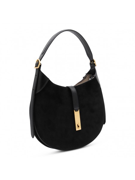 Black leather shoulder bag from Polo Ralph Lauren featuring adjustable top handle, gold tone hardware, magnetic closure, compartments and internal pocket.