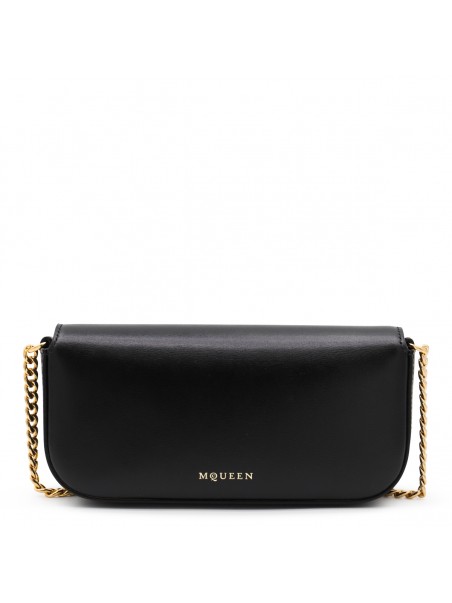 Black leather Skull Flower small shoulder bag from McQueen featuring round shape, gold tone metal hardware, chain-link strap, gold skull details, magnetic closure and main compartment.
