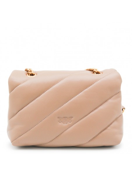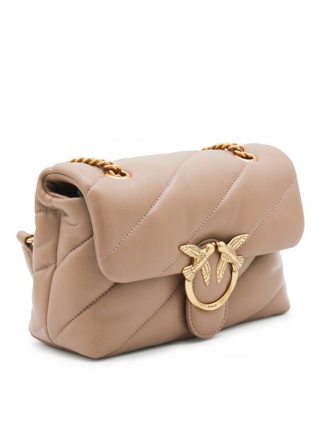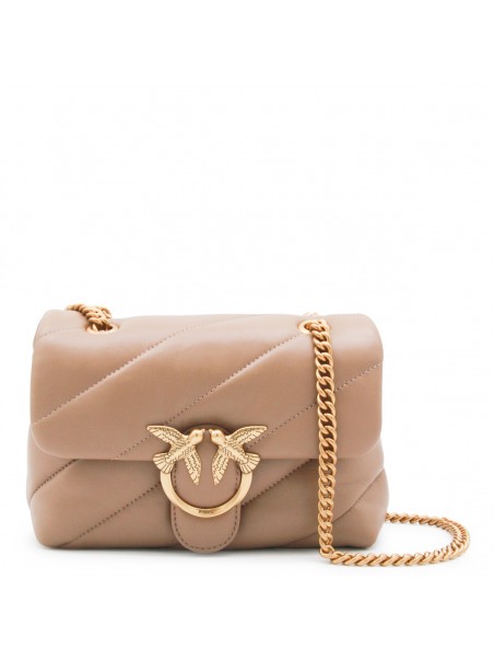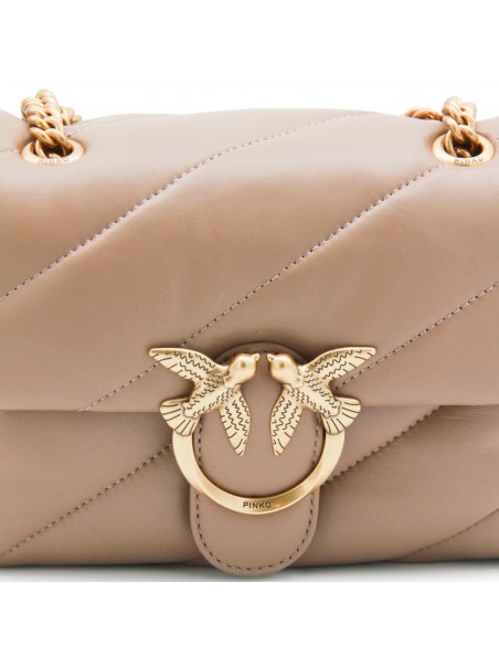 Beige leather shoulder bag from Pinko featuring top handle, frontal logo fastening, chain and pocket.