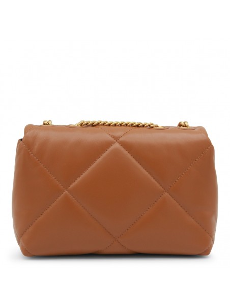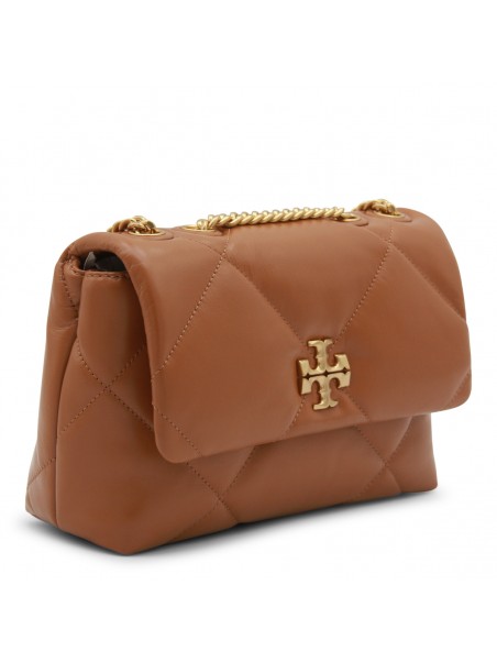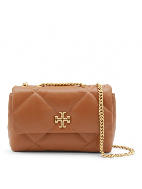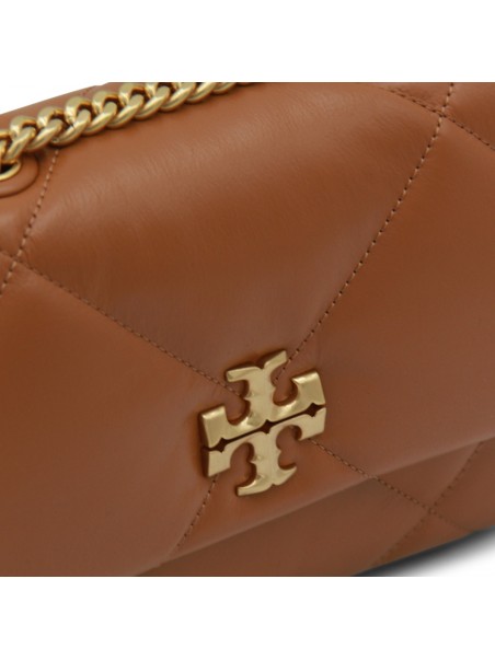 Brown leather shoulder bag from Tory Burch featuring frontal magneti fastening, gold tone logo and hardware, chain and inside pocket.