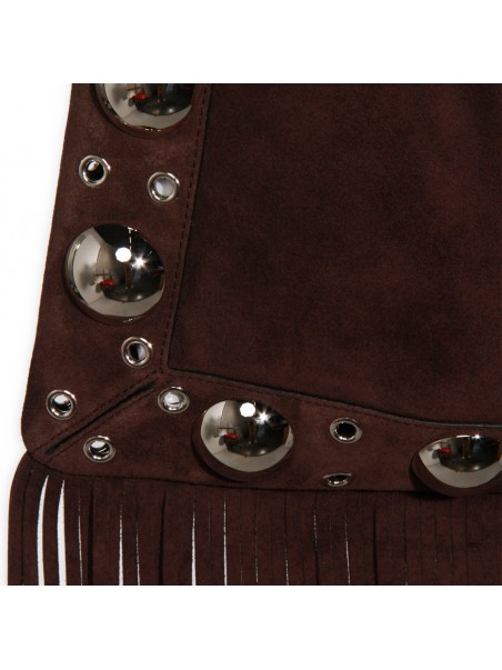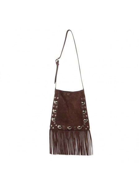 Brown Nellcote suede crossbody bag from Valentino Garavani featuring adjustable strap, silver tone hardware, fringed hem and logo detail.