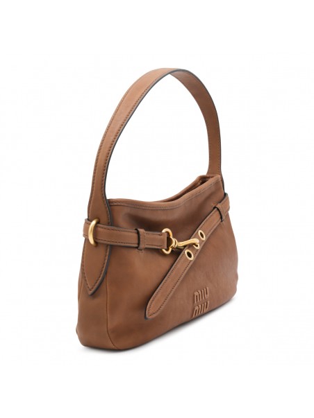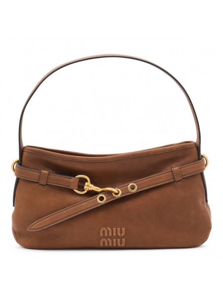 Brown leather Aventure shoulder bag from Miu Miu featuring top handle, zip fastening, upper zip fastening, gold tone hardware and logo.