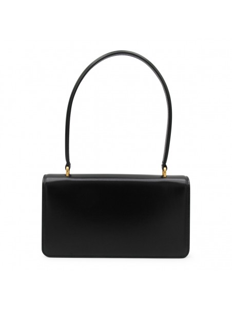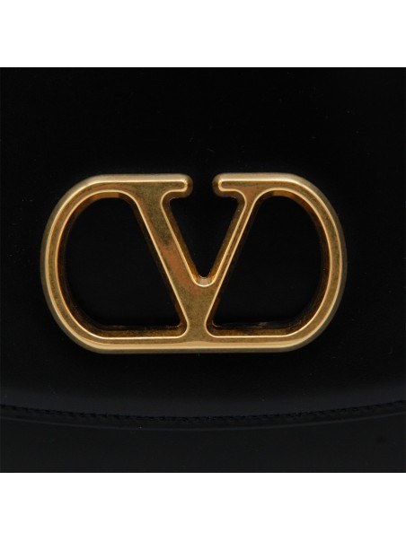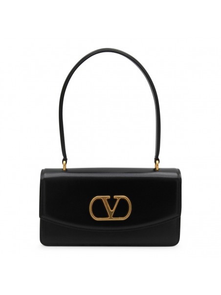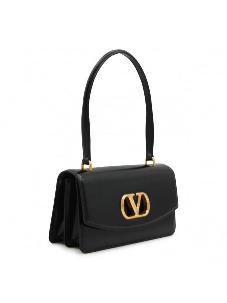 Black leather shoulder bag from Valentino Garavani featuring top handle, frontal fastening, gold tone hardware and inside pockets.
