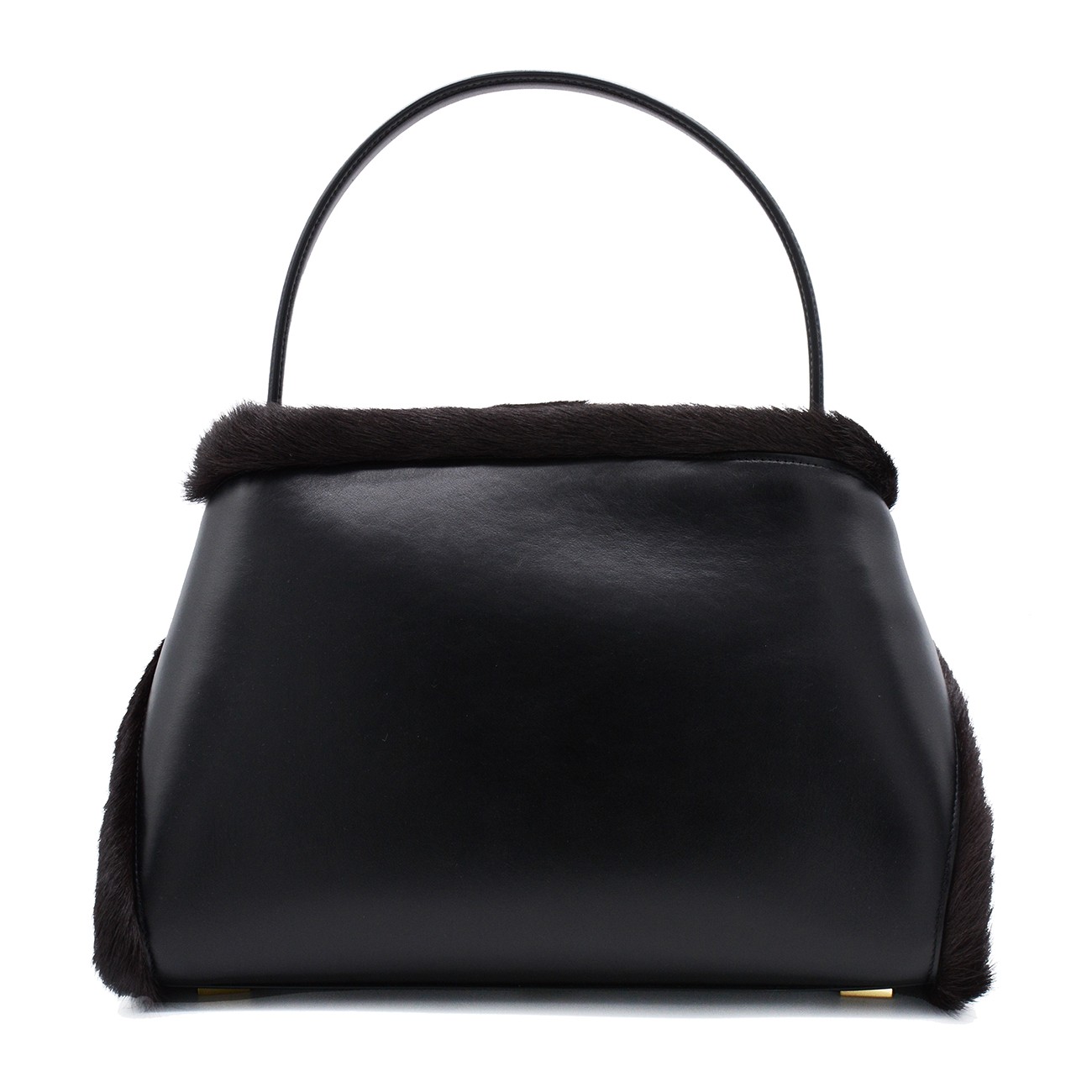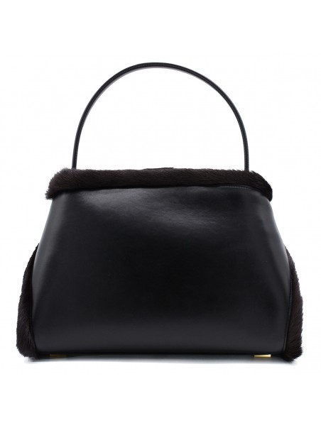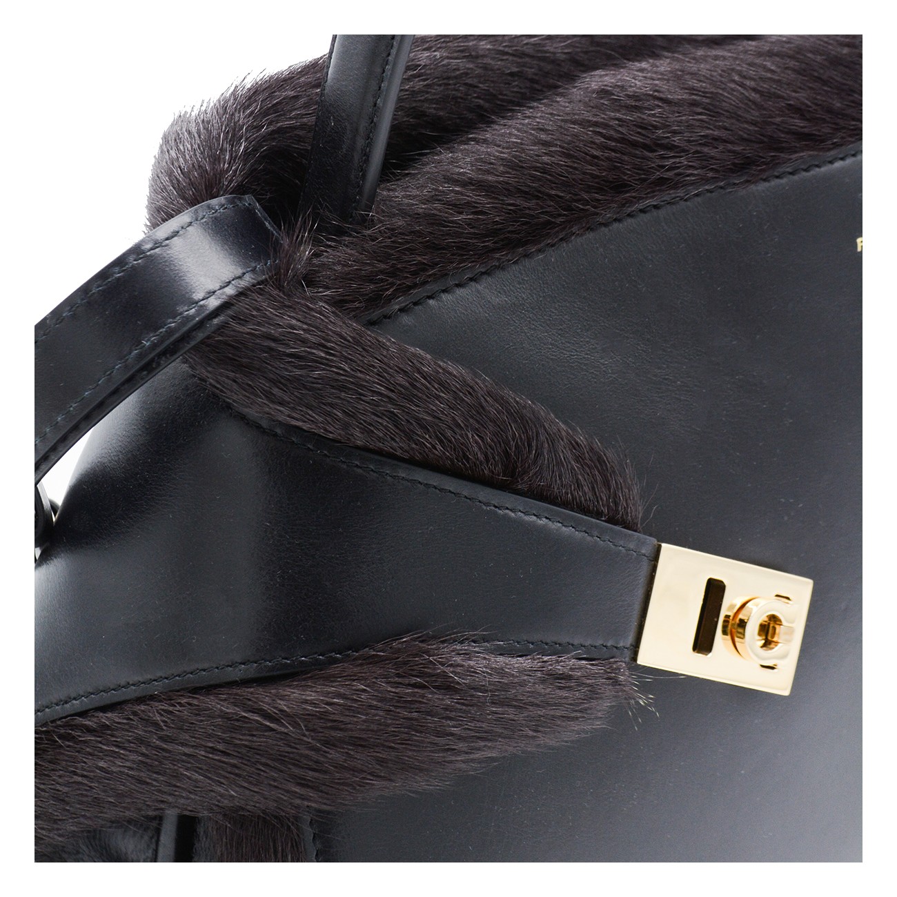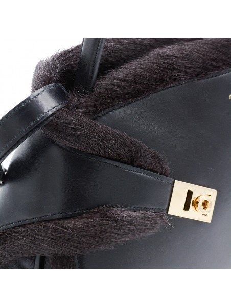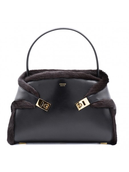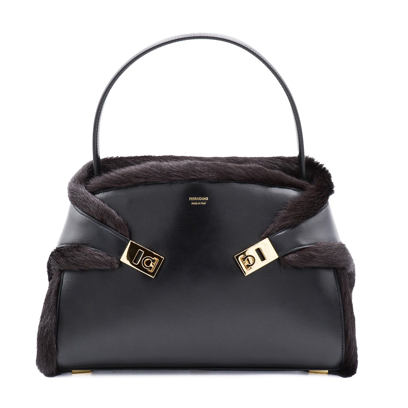 Black leather Hug S shoulder bag from Ferragamo featuring top handle, gold tone hardware, frontal logo, inside pocket ans hair details.