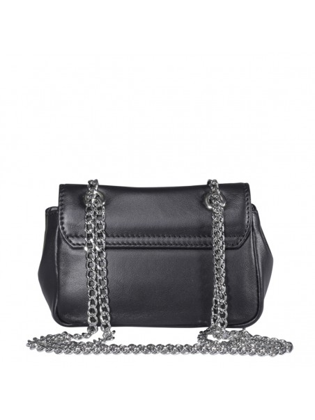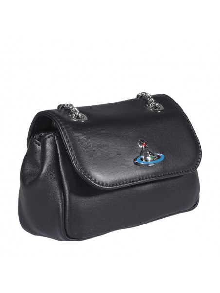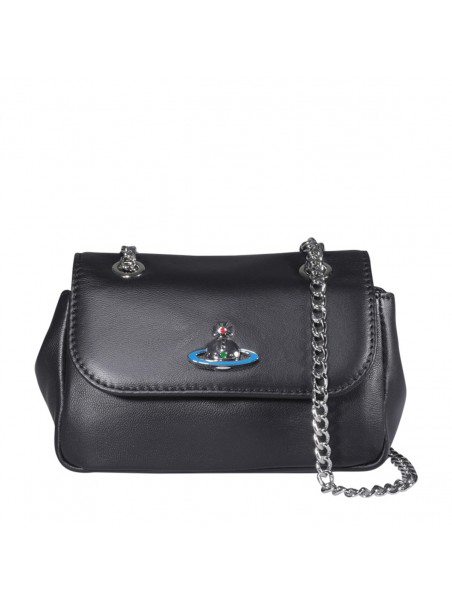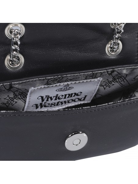 Black leather shoulder bag from Vivienne Westwood featuring frontal fastening, silver tone hardware, frontal logo, inside pocket and strap.