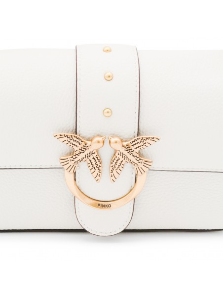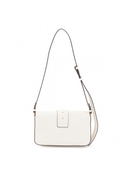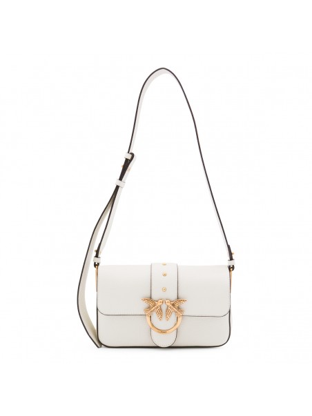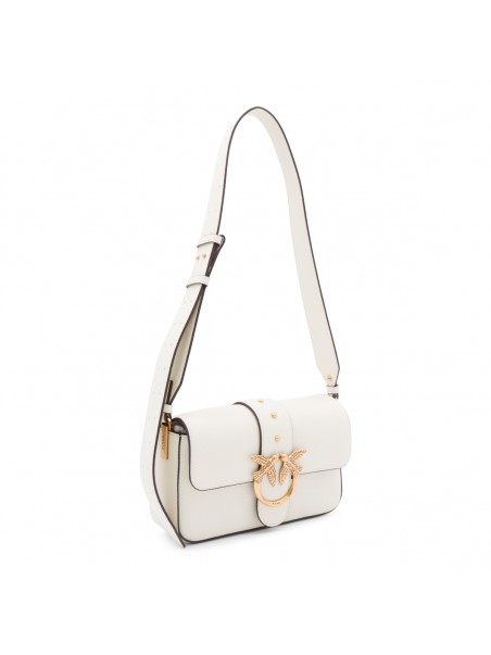 White leather shoulder bag from Pinko featuring frontal fastening, gold tone hardware, double strap and pocket.