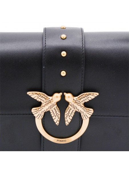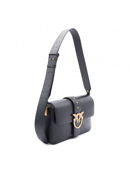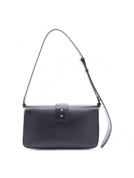 Black leather shoulder bag from Pinko featuring adjustable single handle, gold tone hardware, logo, magnetic closure and main compartment.