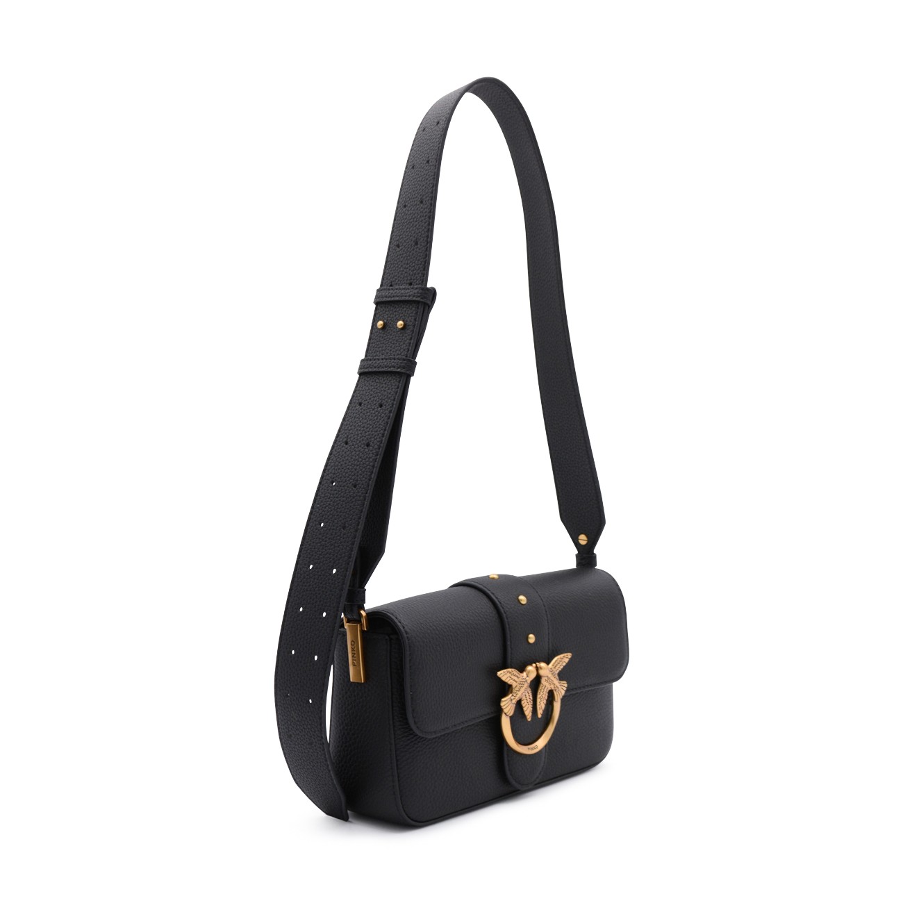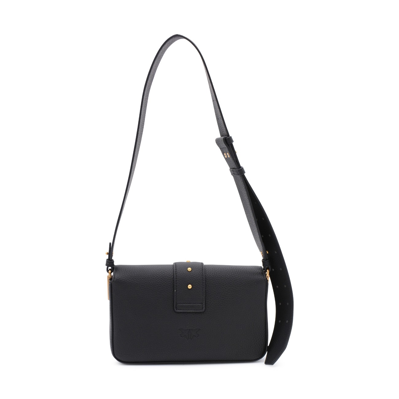 Black leather shoulder bag from Pinko featuring frontal fastening, gold tone hardware, double strap and pocket.