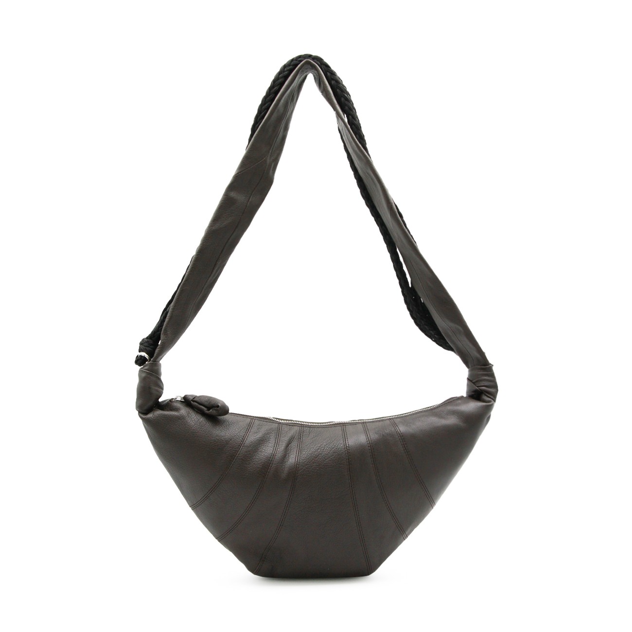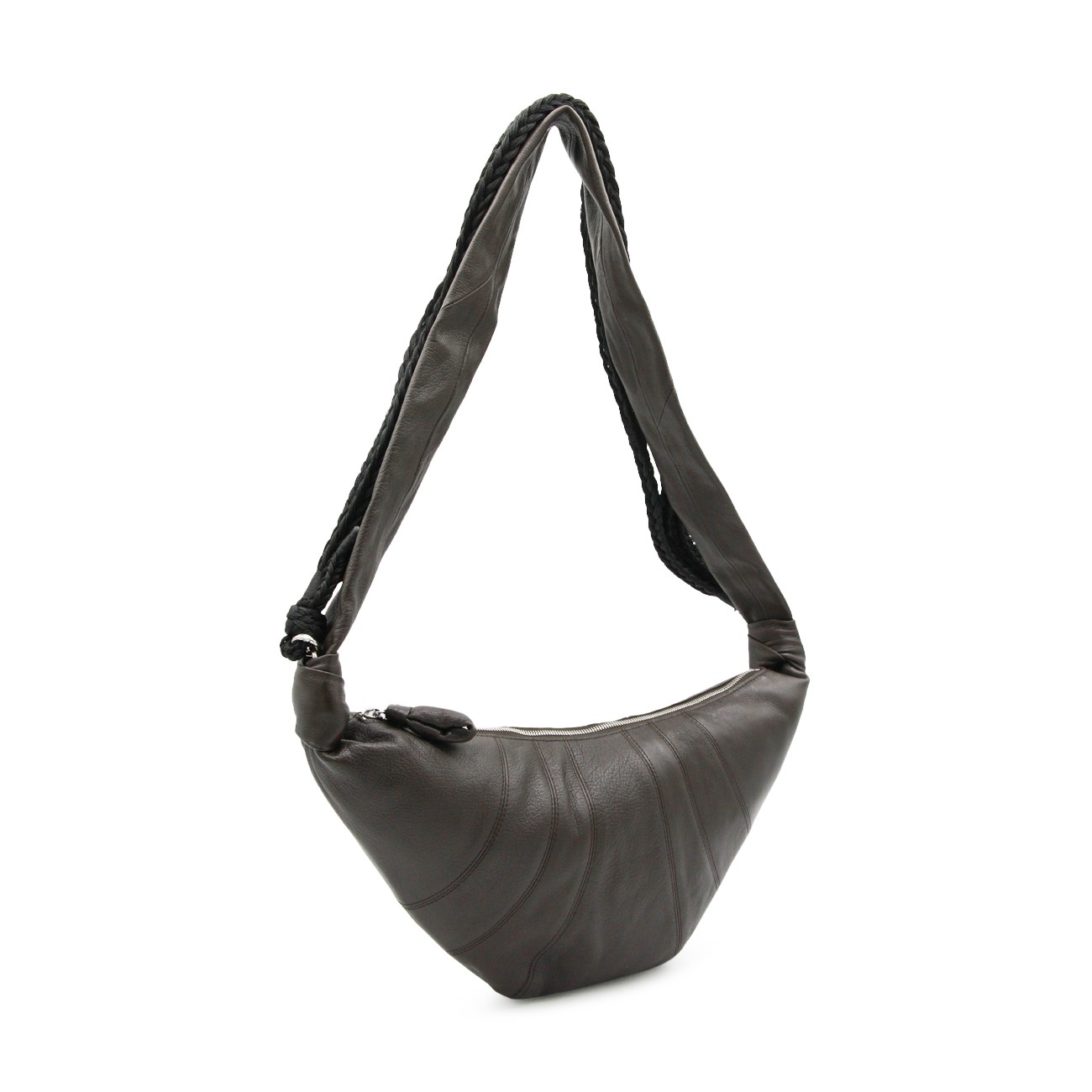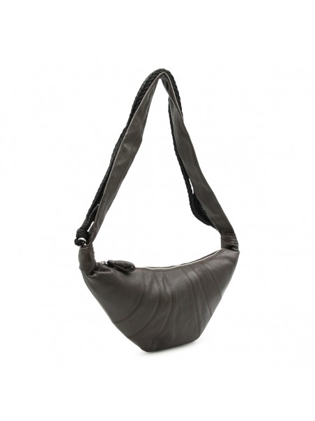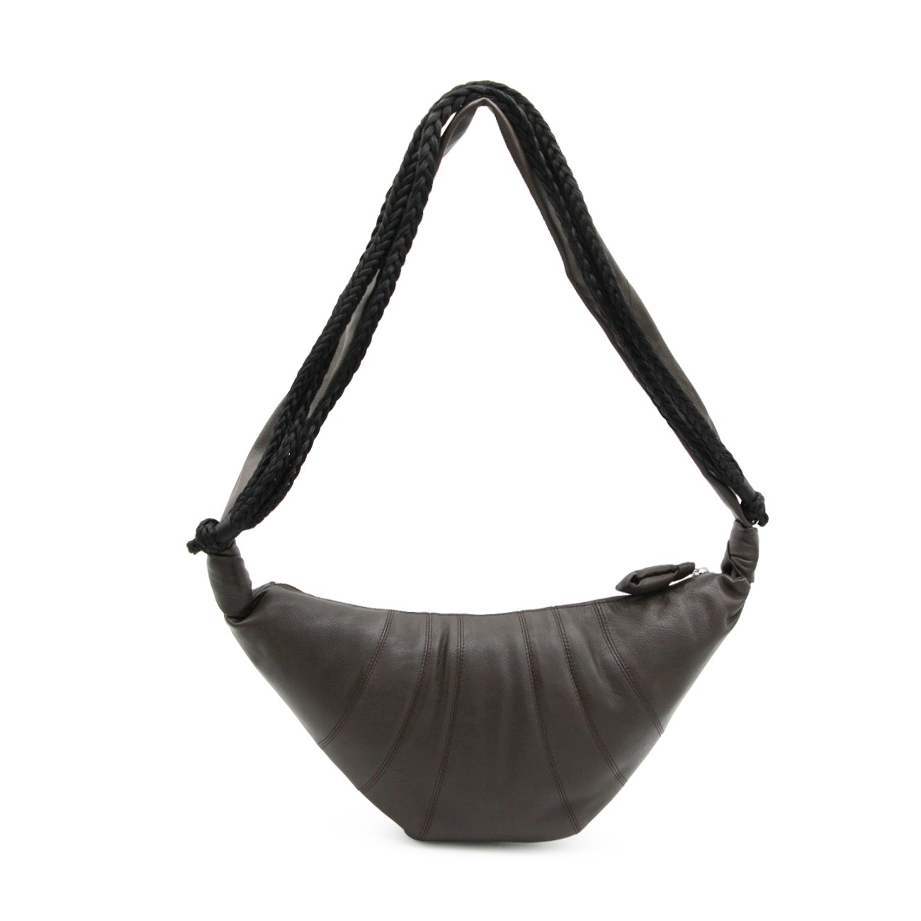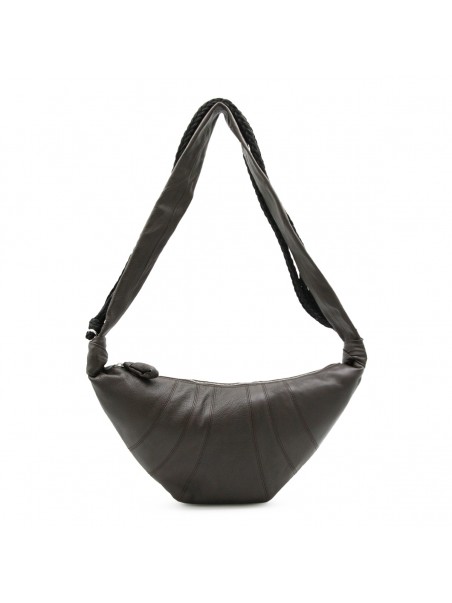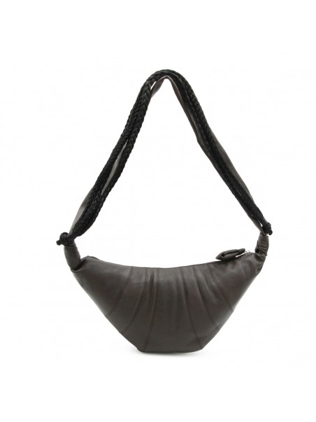 Dark brown leather Braid Medium Croissant shoulder bag from Lemaire featuring handles, croissant shape, zip fastening and main compartment.