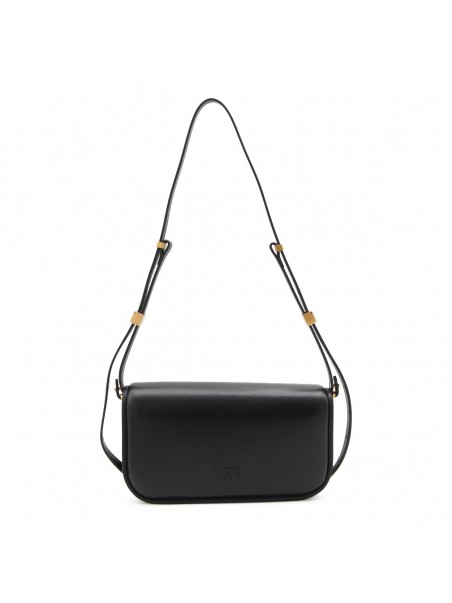 Black leather crossbody bag from Pinko featuring adjustable handle, rectangular shape, gold tone hardware, frontal logo, magnetic closure and main comparment.