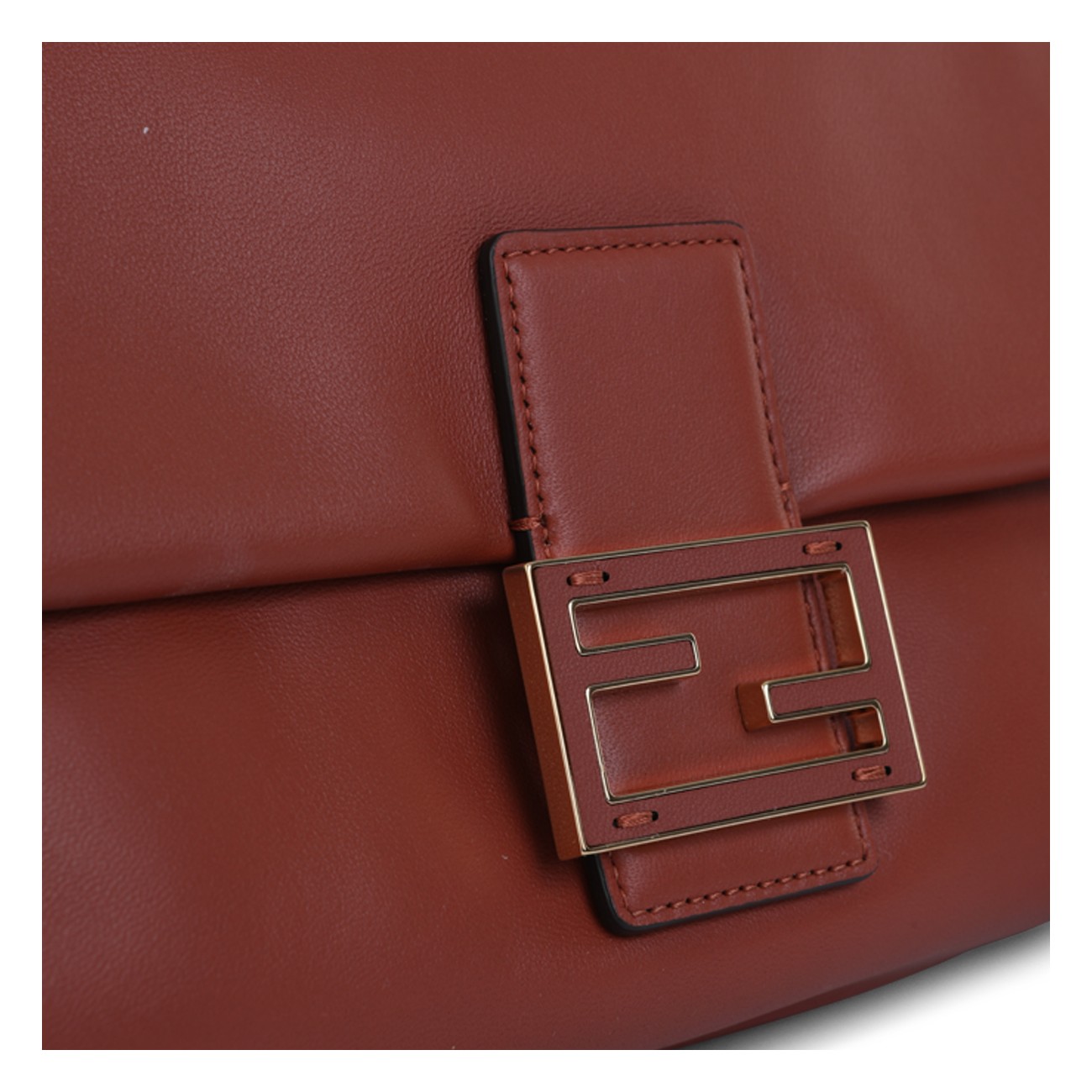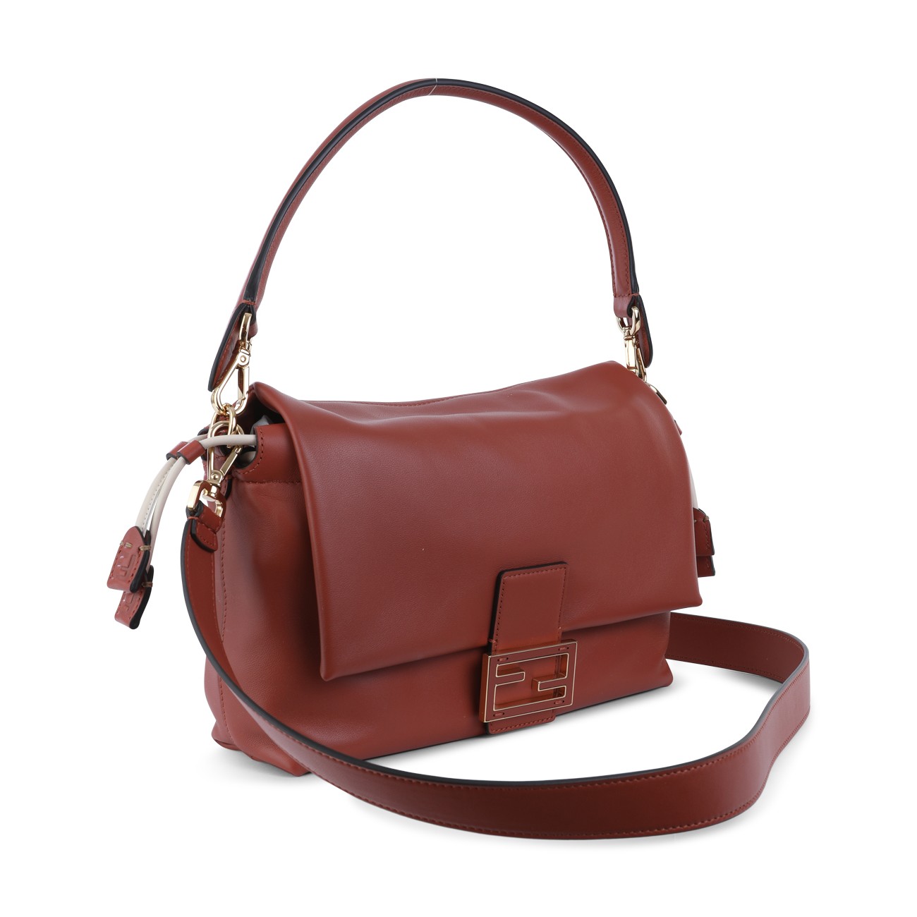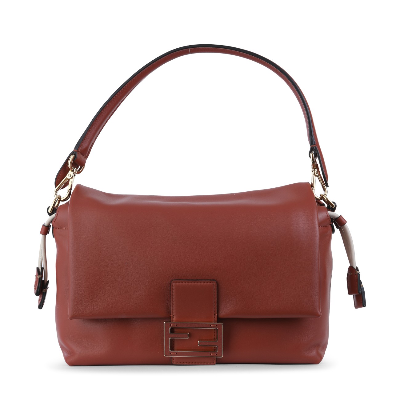 Red leather Mamma Baguette shoulder bag from Fendi featuring single top handle, flap closure with magnetic button, removable and adjustable shoulder strap, suede lining and main compartment.