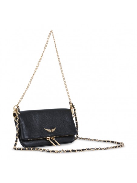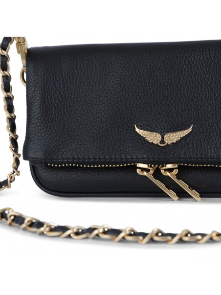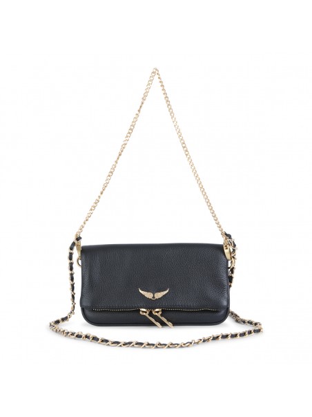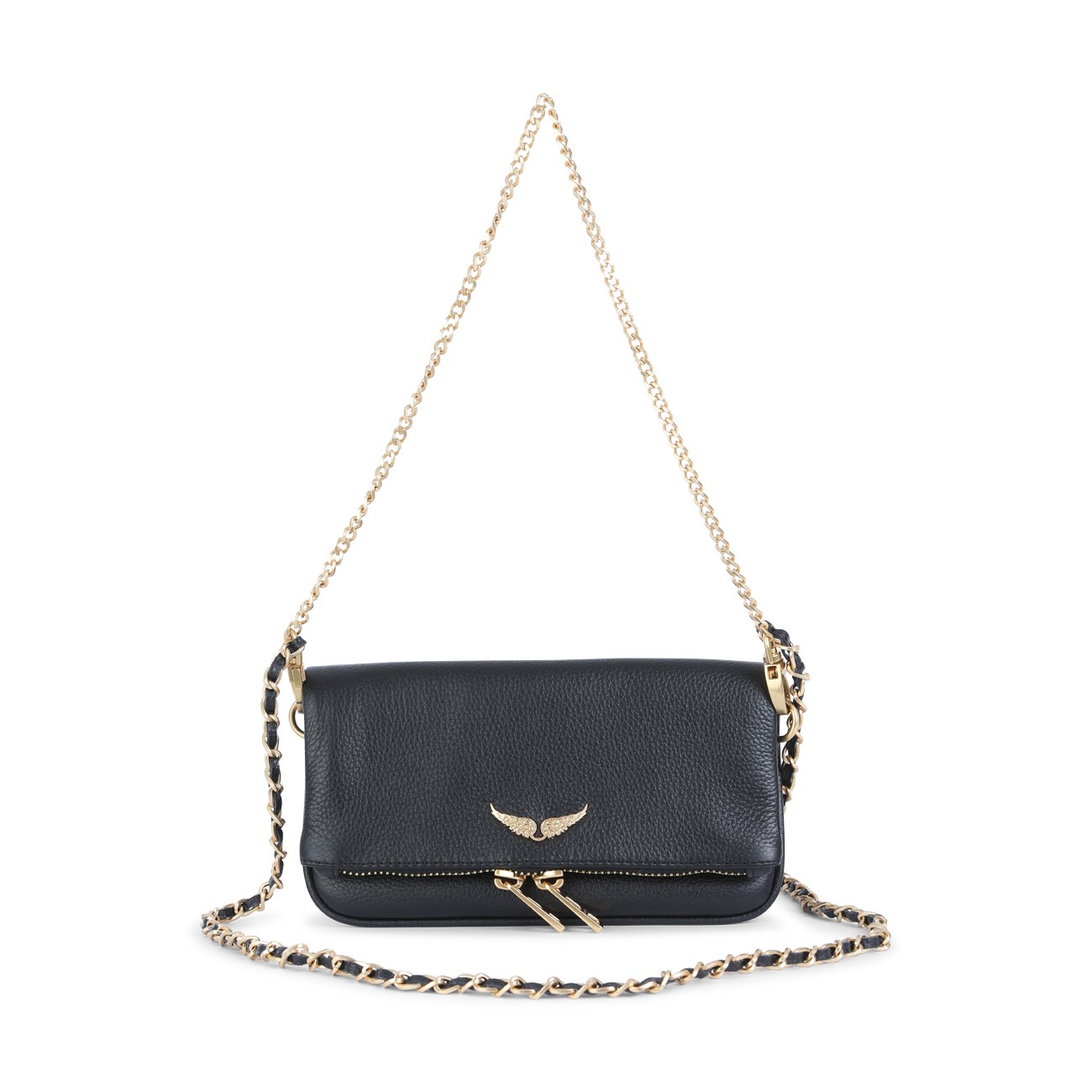 Black Rock Nano grained leather shoulder bag from Zadig & Voltaire featuring chain-link strap, gold tone hardware, frontal logo plaque, zip fastening and main compartment.