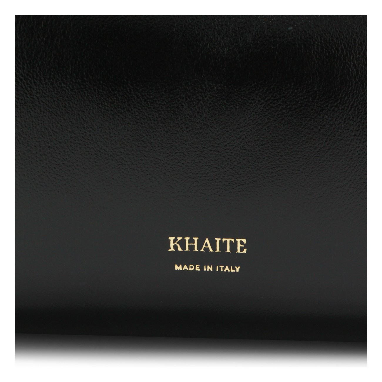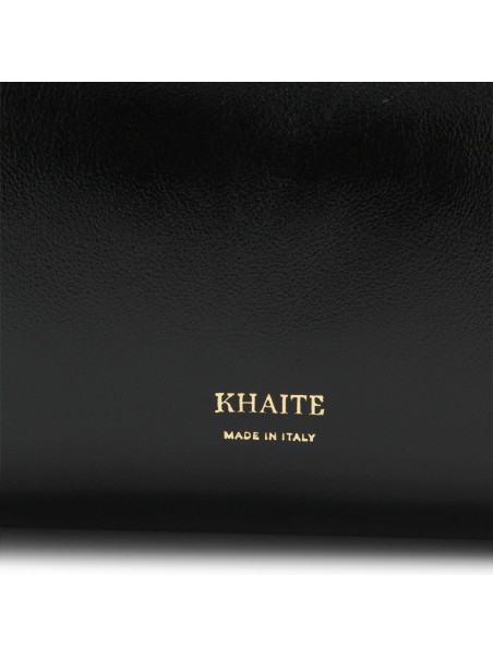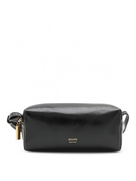 Black leather crossbody bag from Khaite featuring adjustable strap, zip fastening, frontal logo and gold tone hardware.