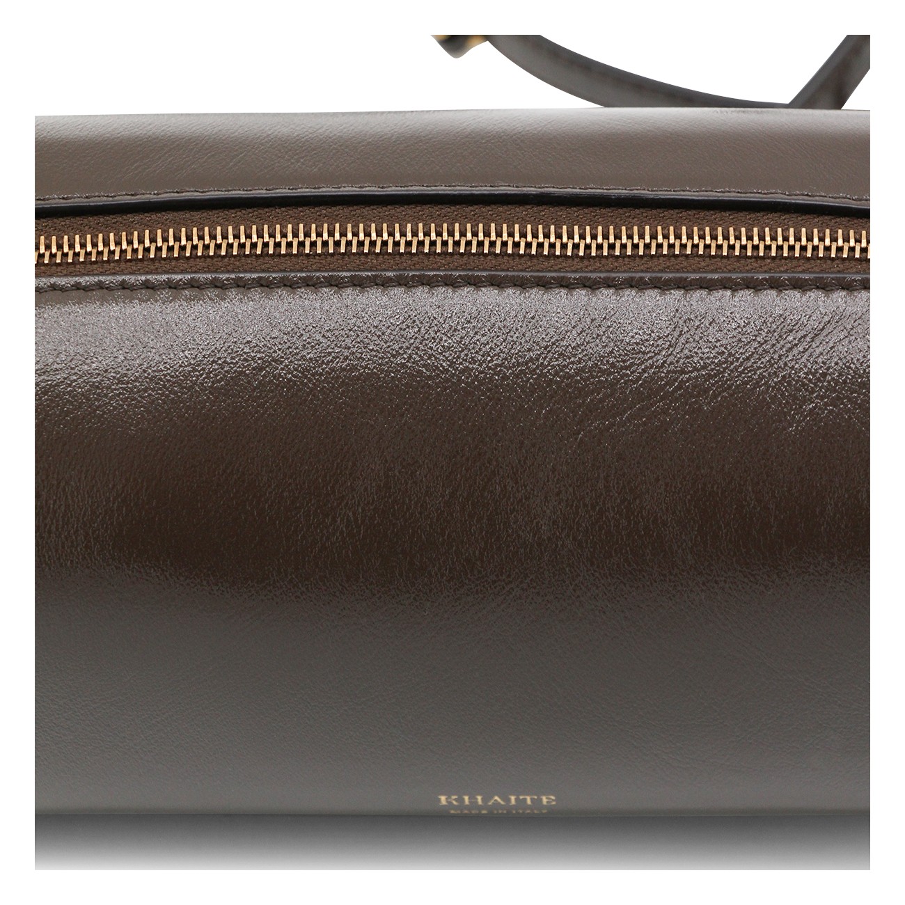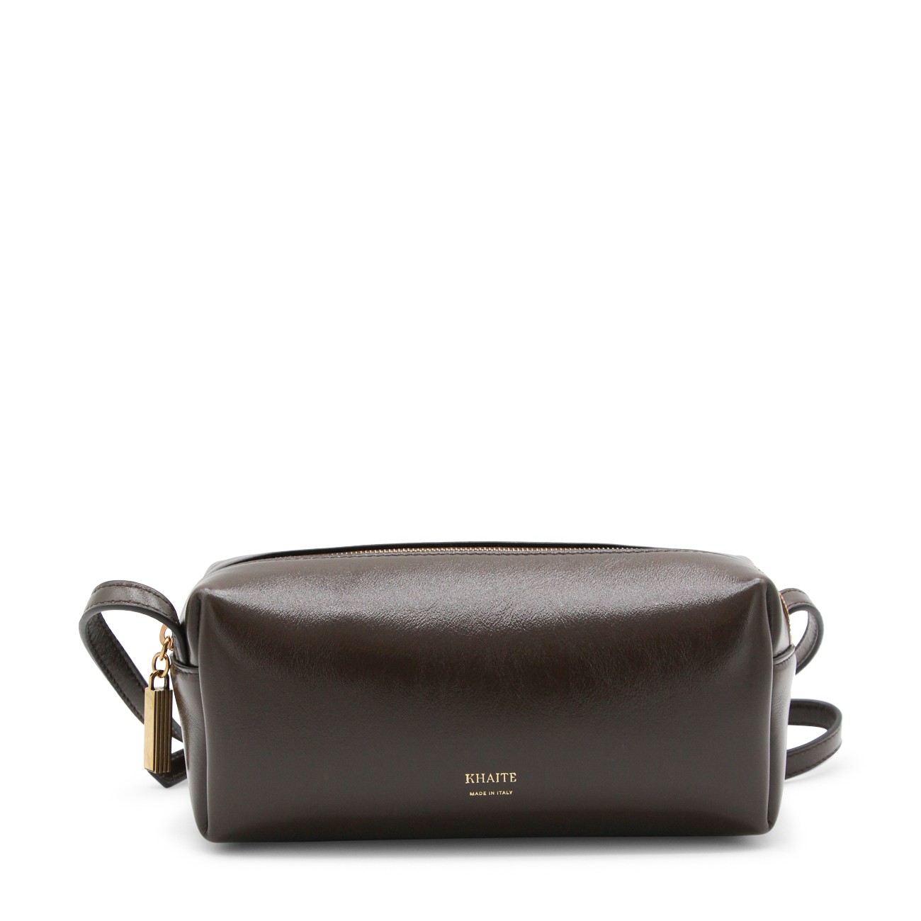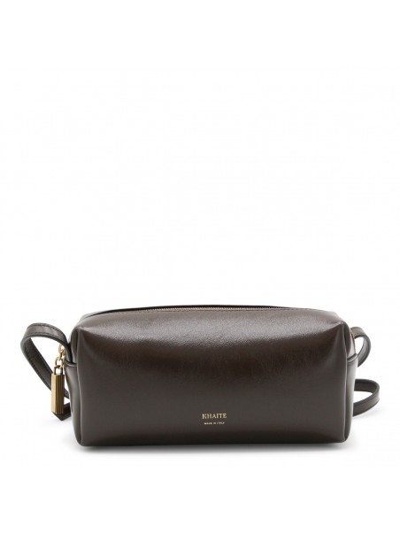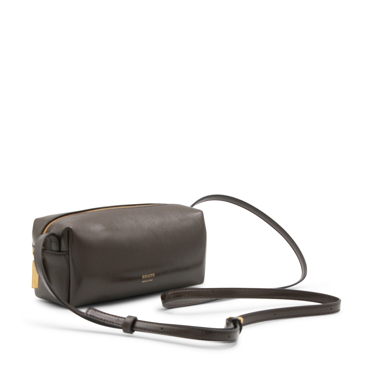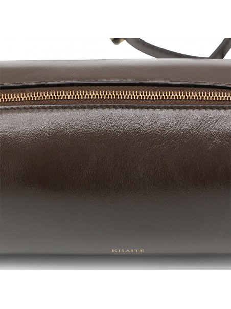 Dark brown leather crossbody bag from Khaite featuring strap, main compartment, zip fastening and frontal logo.