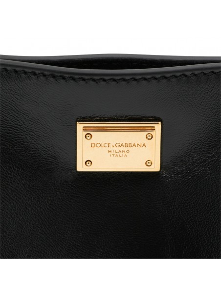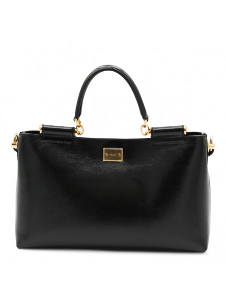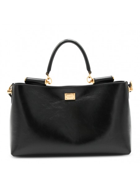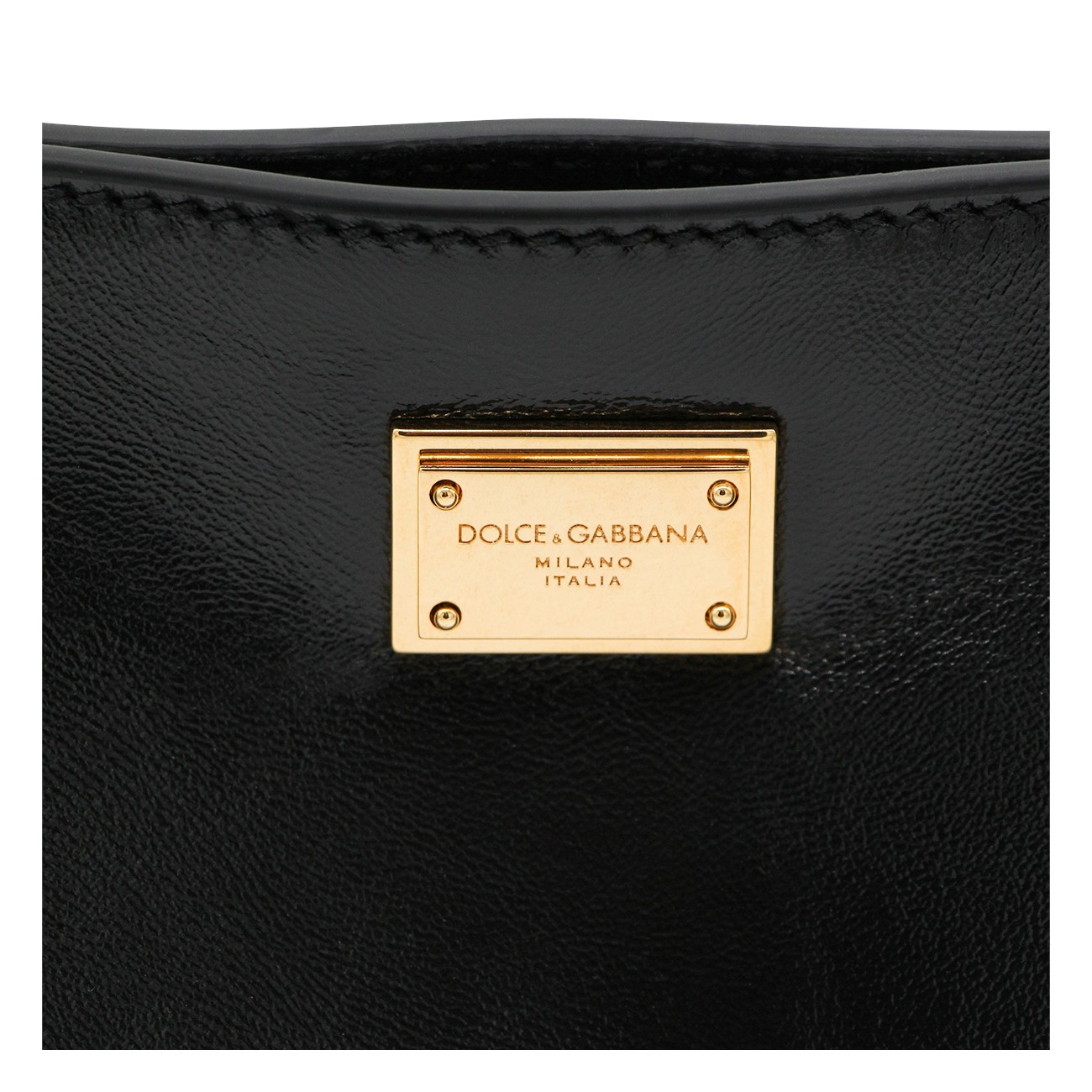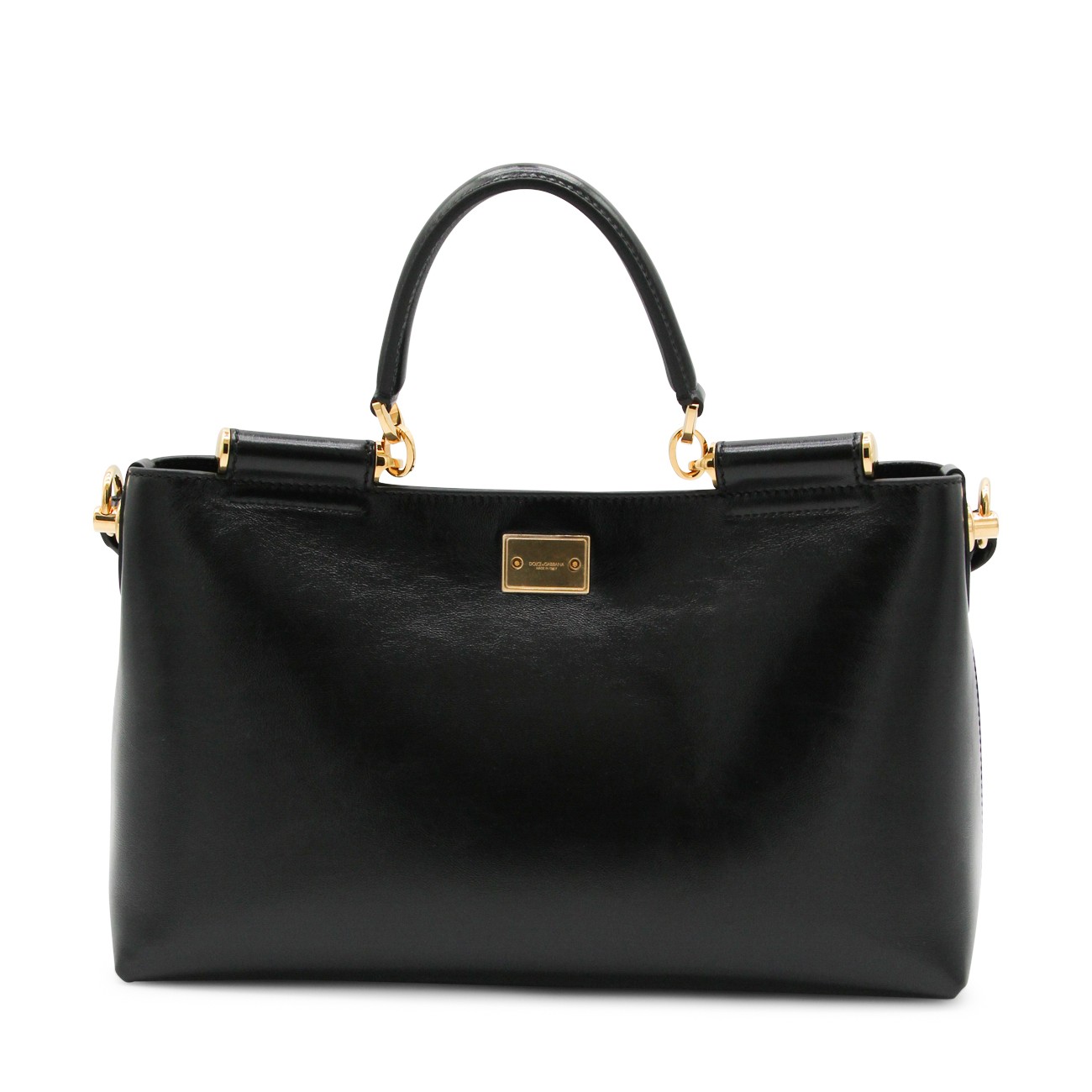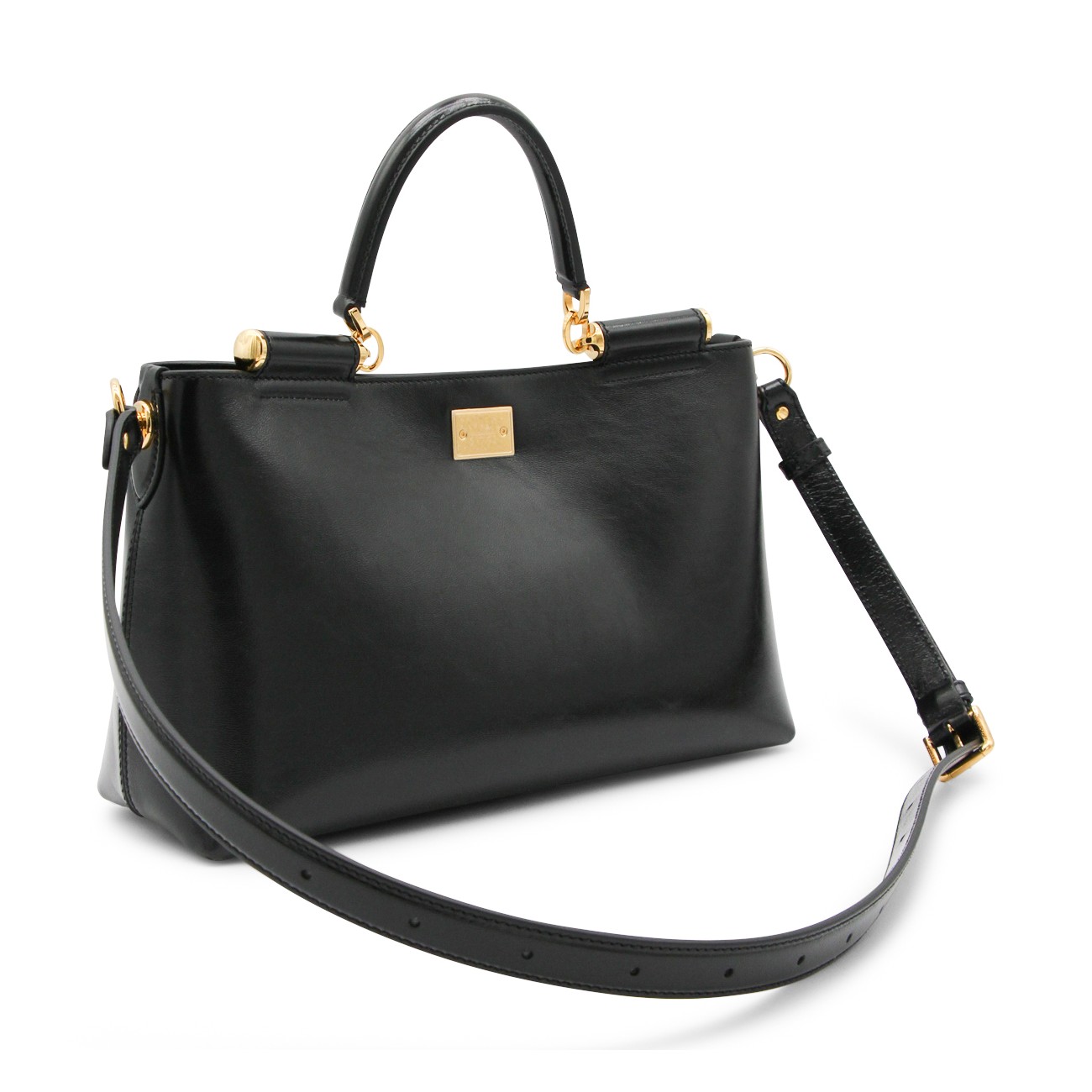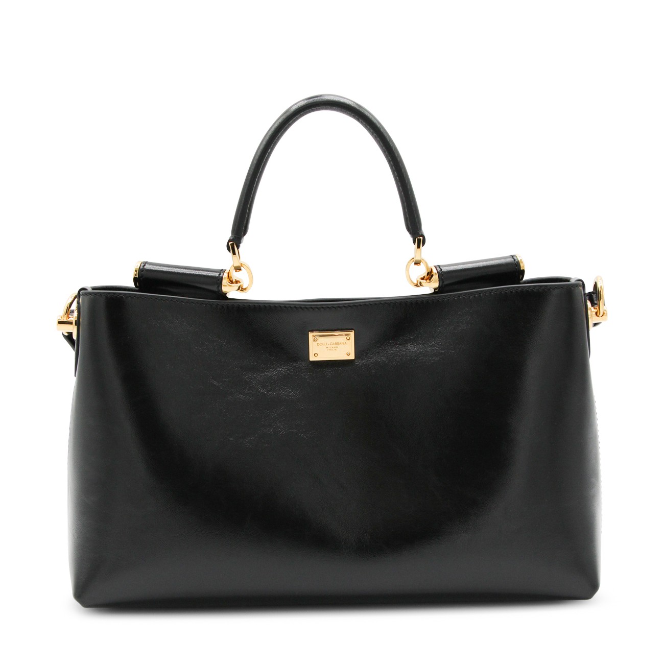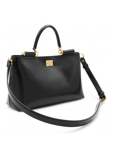 Black leather My Sicily shoulder bag from Dolce & Gabbana featuring top handle, gold tone metal hardware, adjustable and removable shoulder strap, tuck-in closure, main compartment and internal zip pocket.