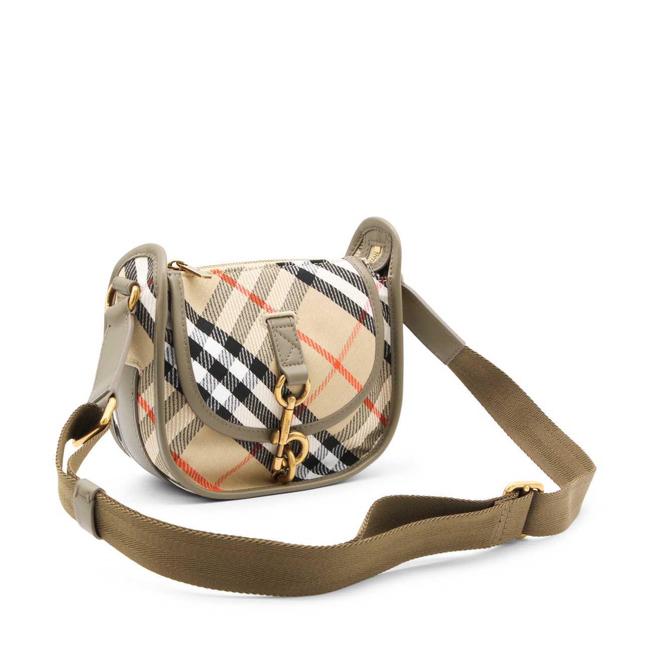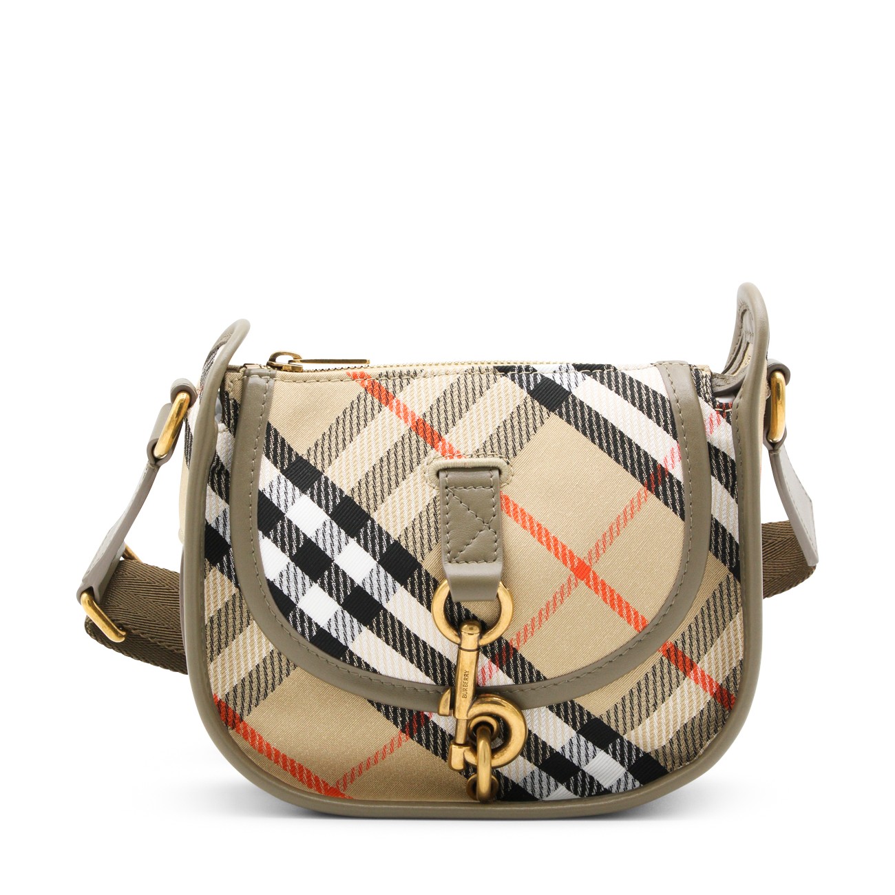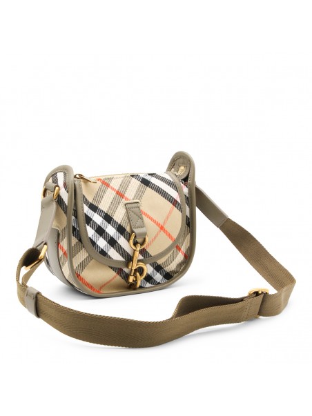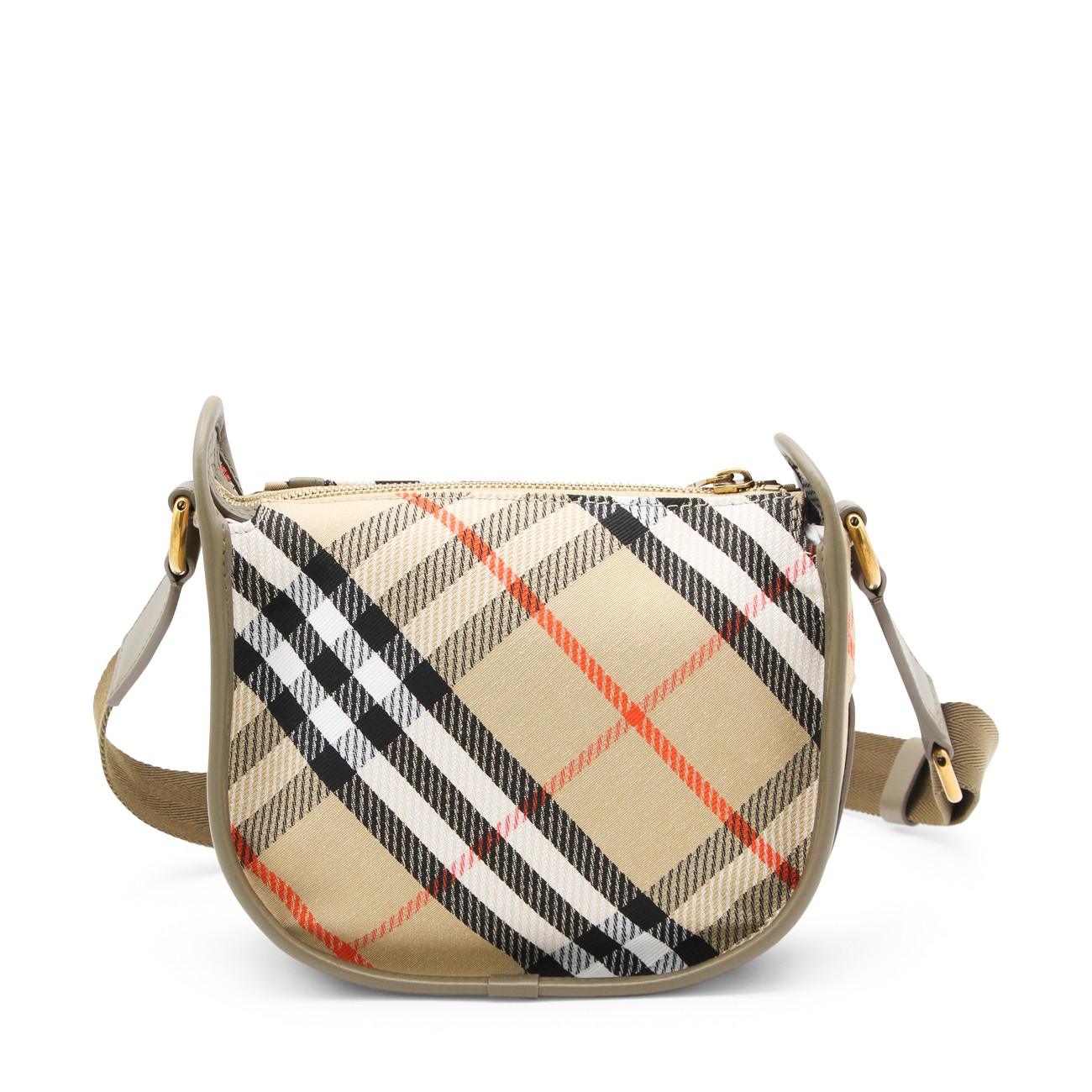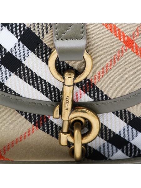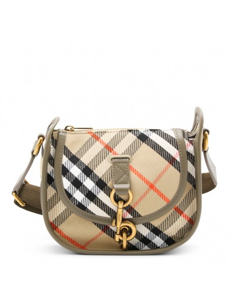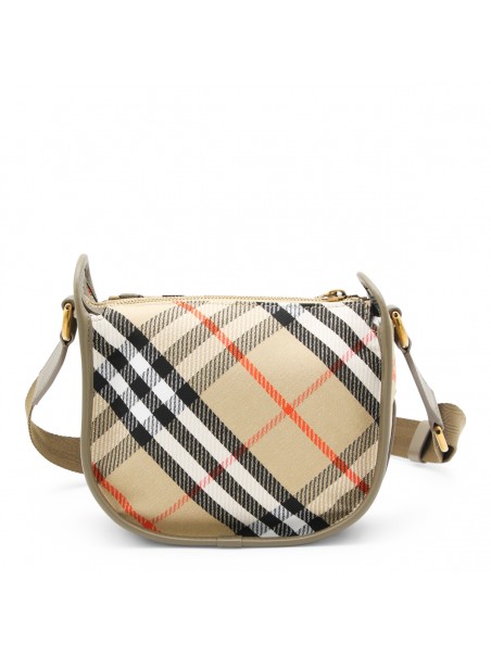 Beige crossbody bag from Burberry featuring top handle, main compartment, zip fastening, gold tone hardware and all over iconic print.