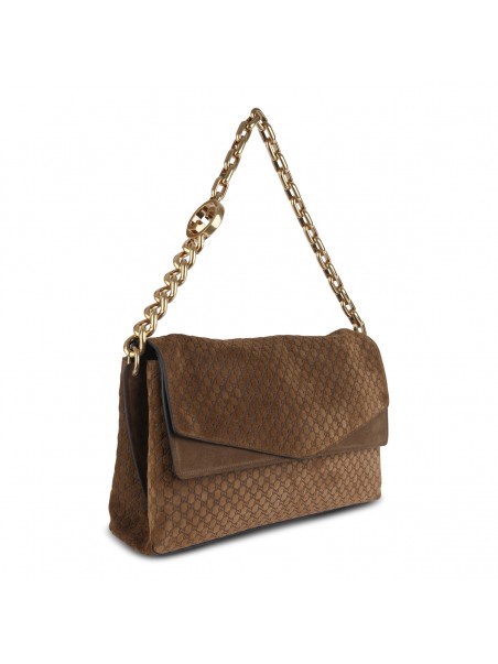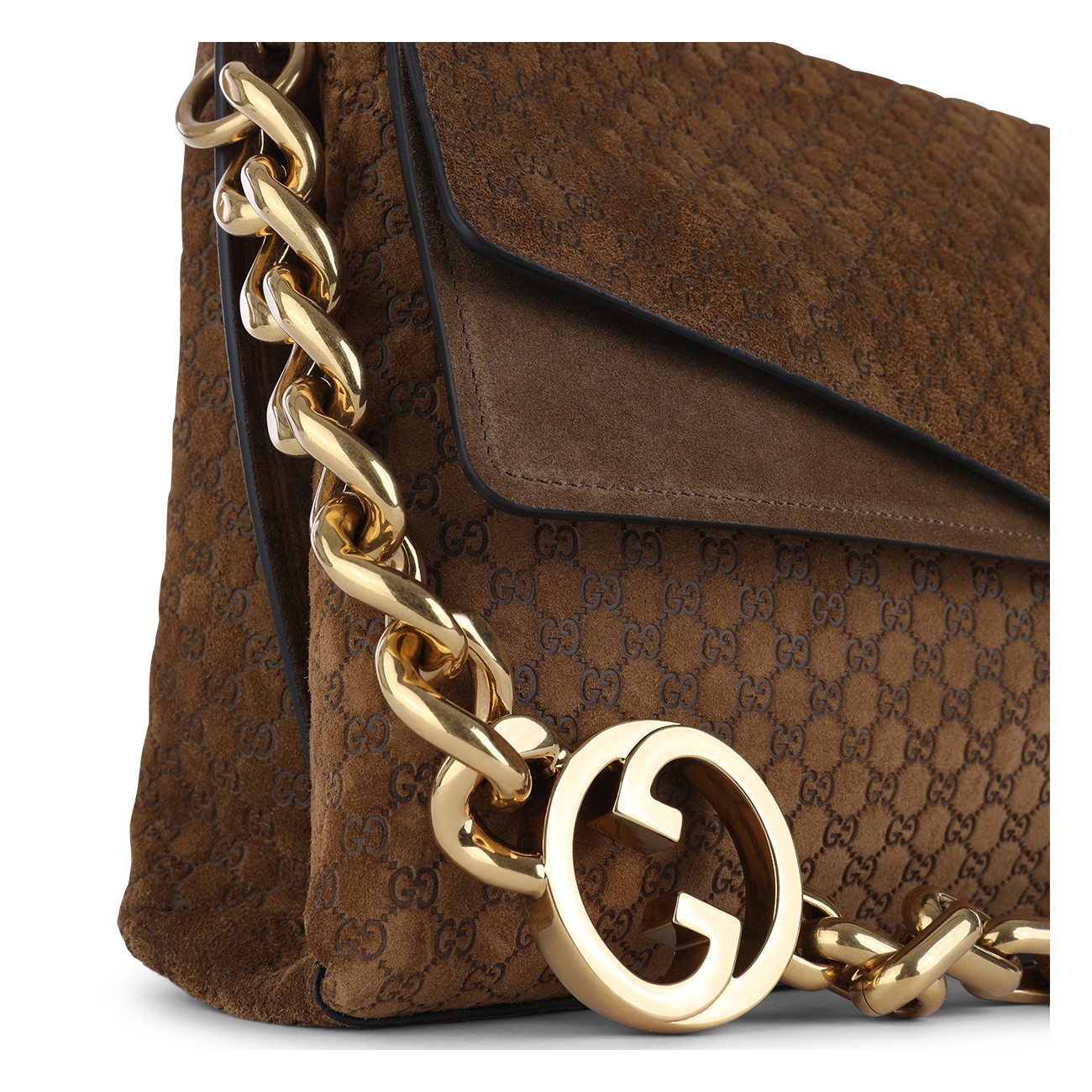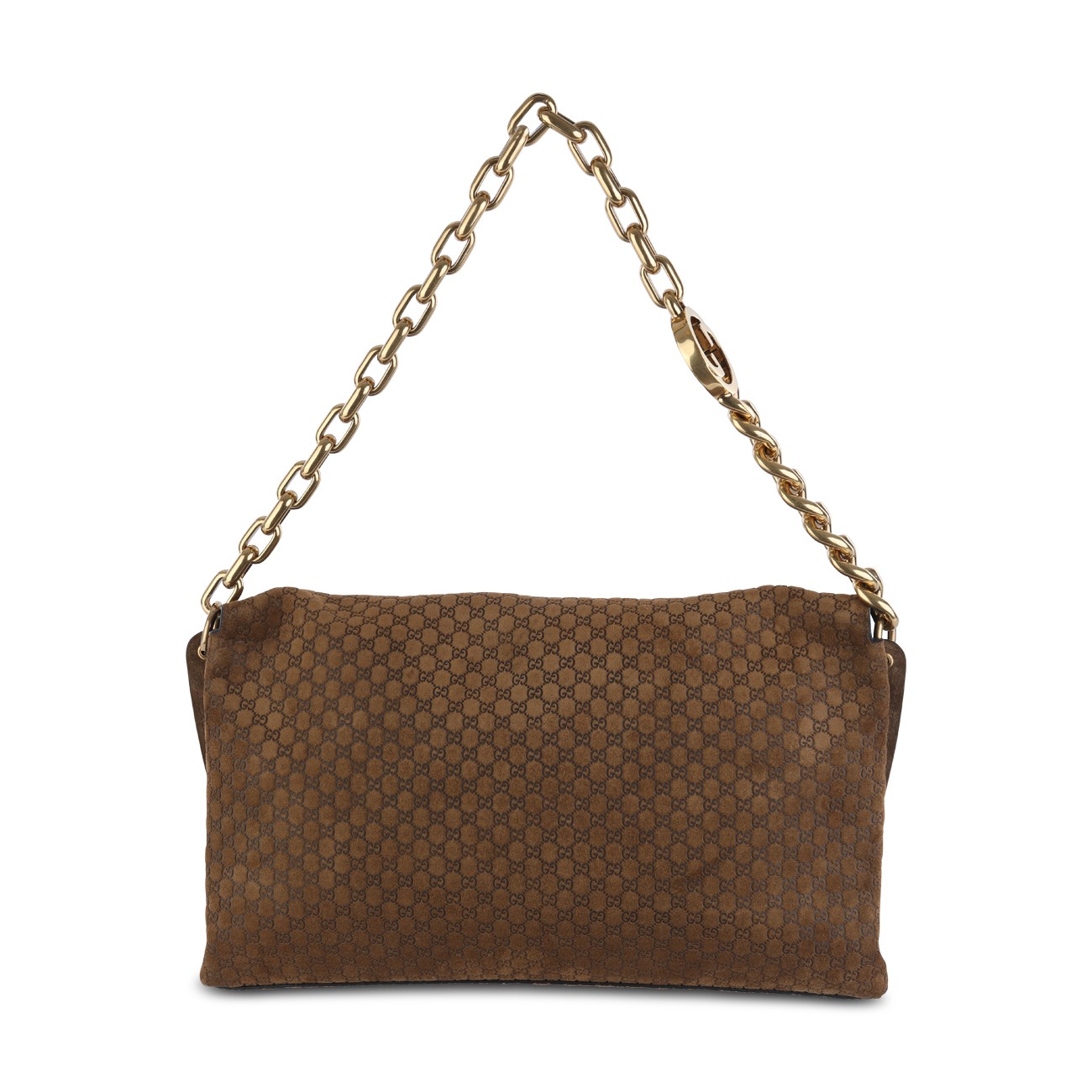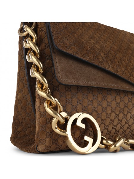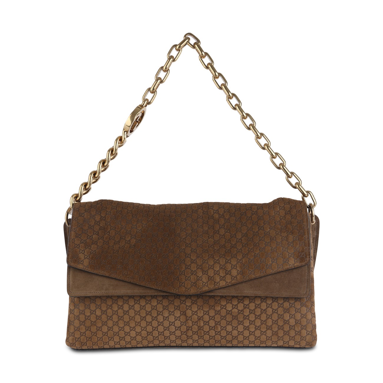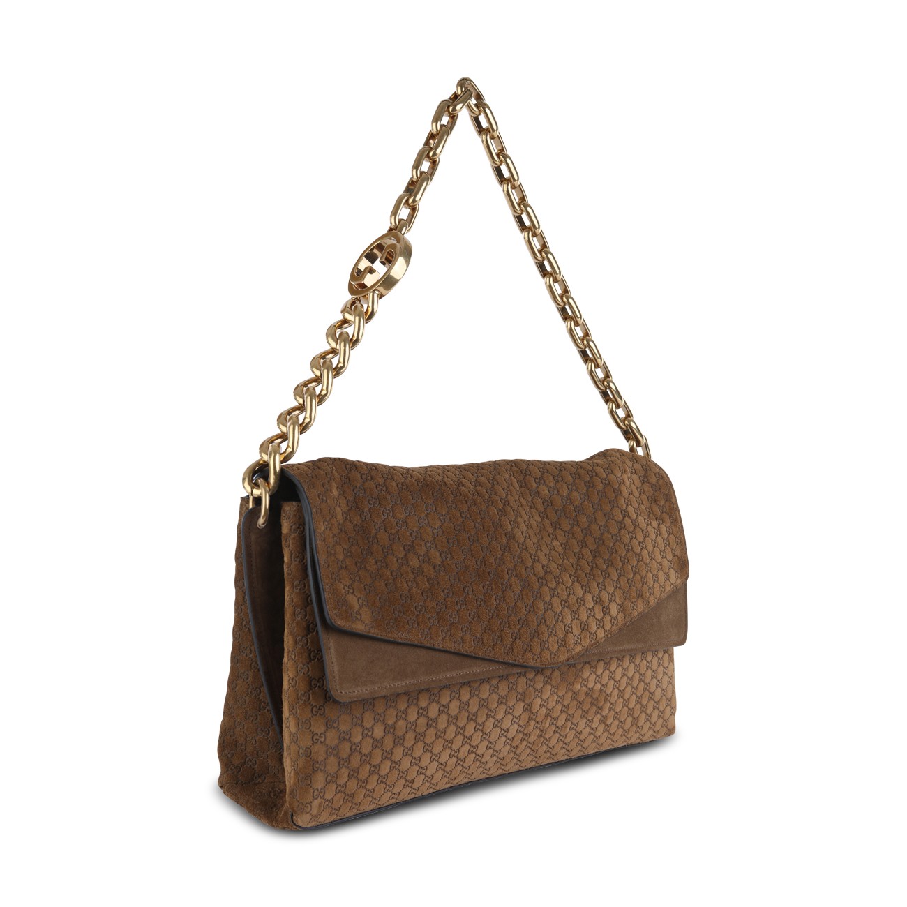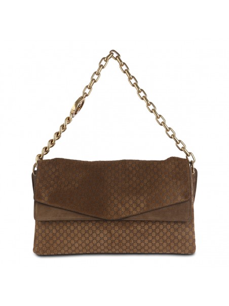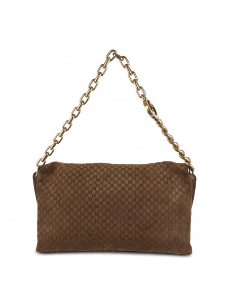 Brown leather shoulder bag from Gucci featuring top handle, main compartment, button fastenign, logo and gold tone hardware.