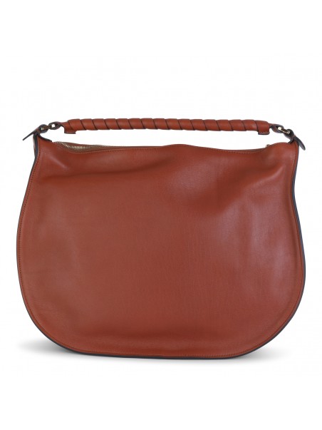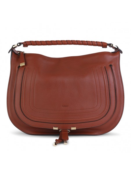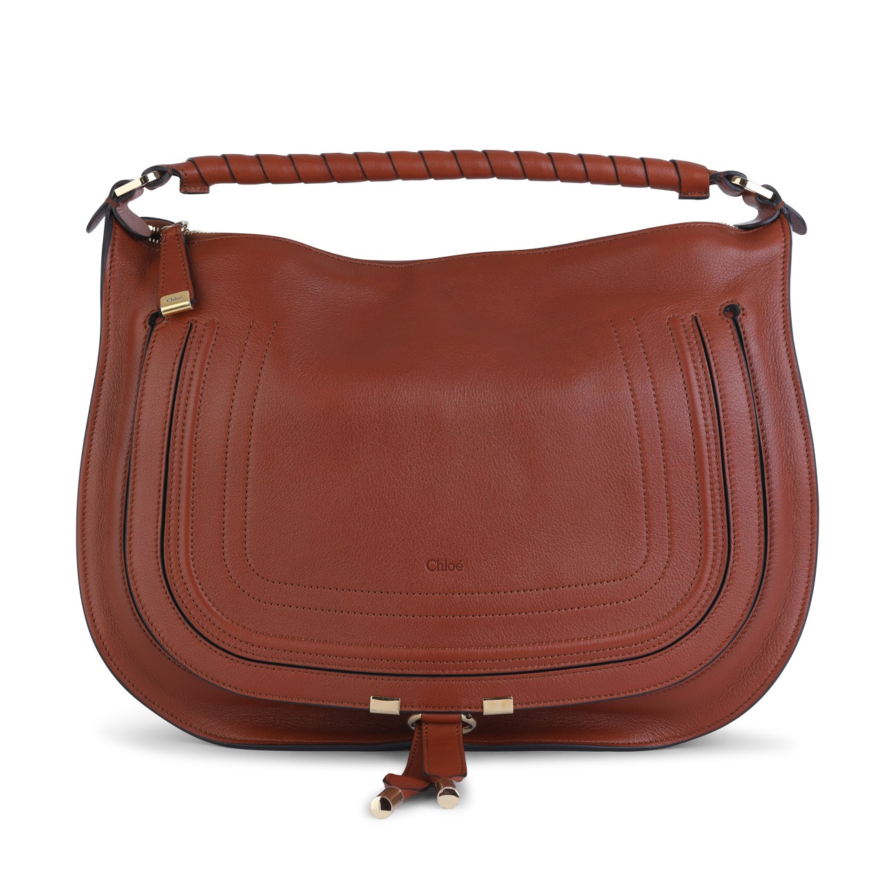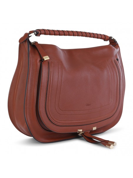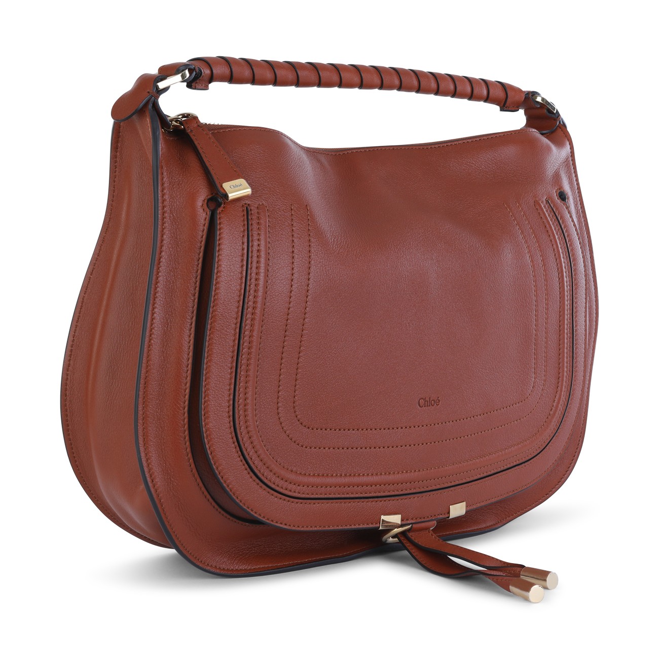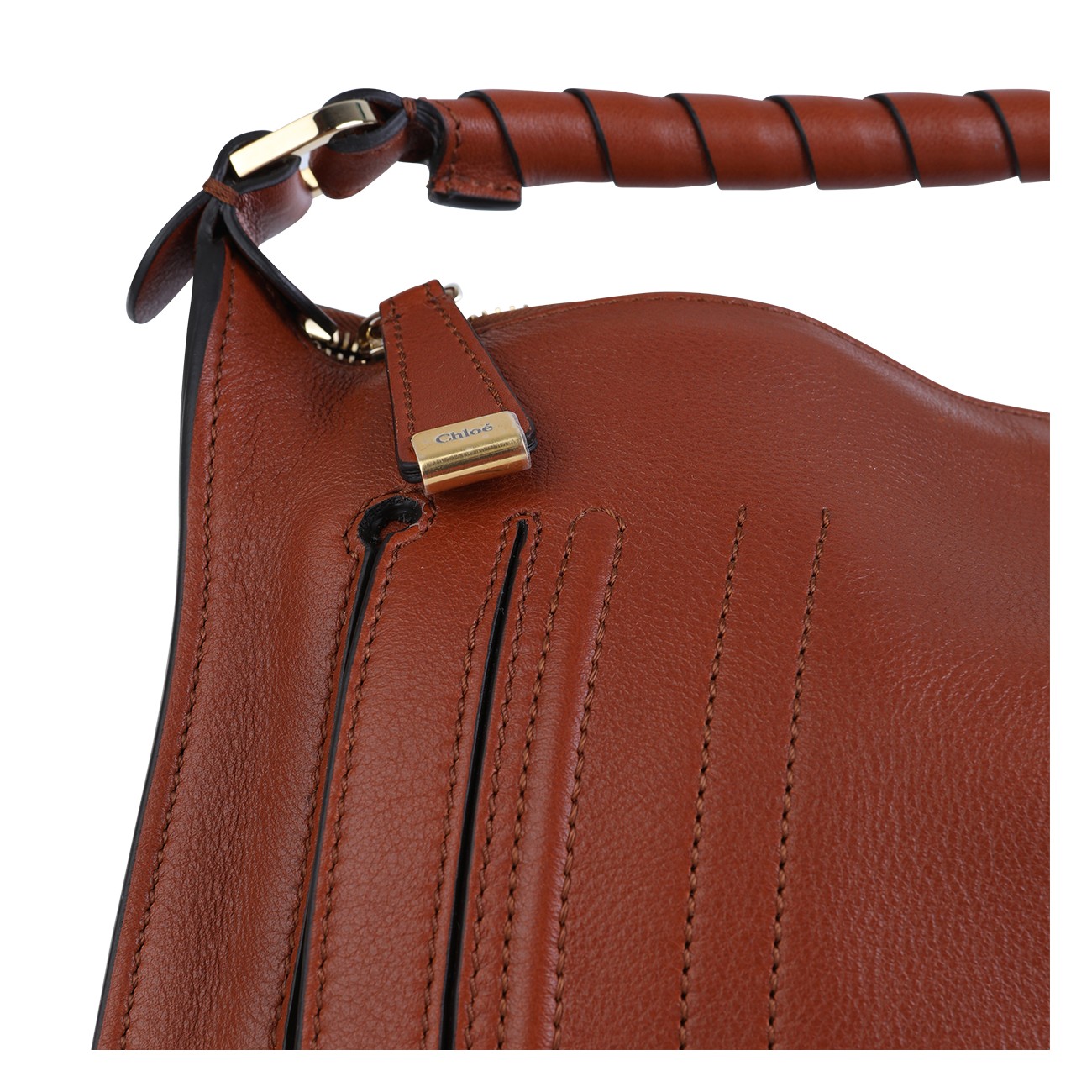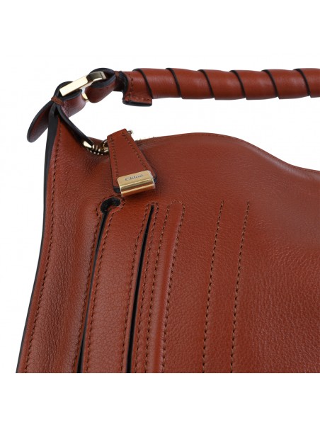 Brown leather Marcie shoulder bag from Chloé featuring top handle, main compartment, button fastening, engraved logo and gold tone hardware.