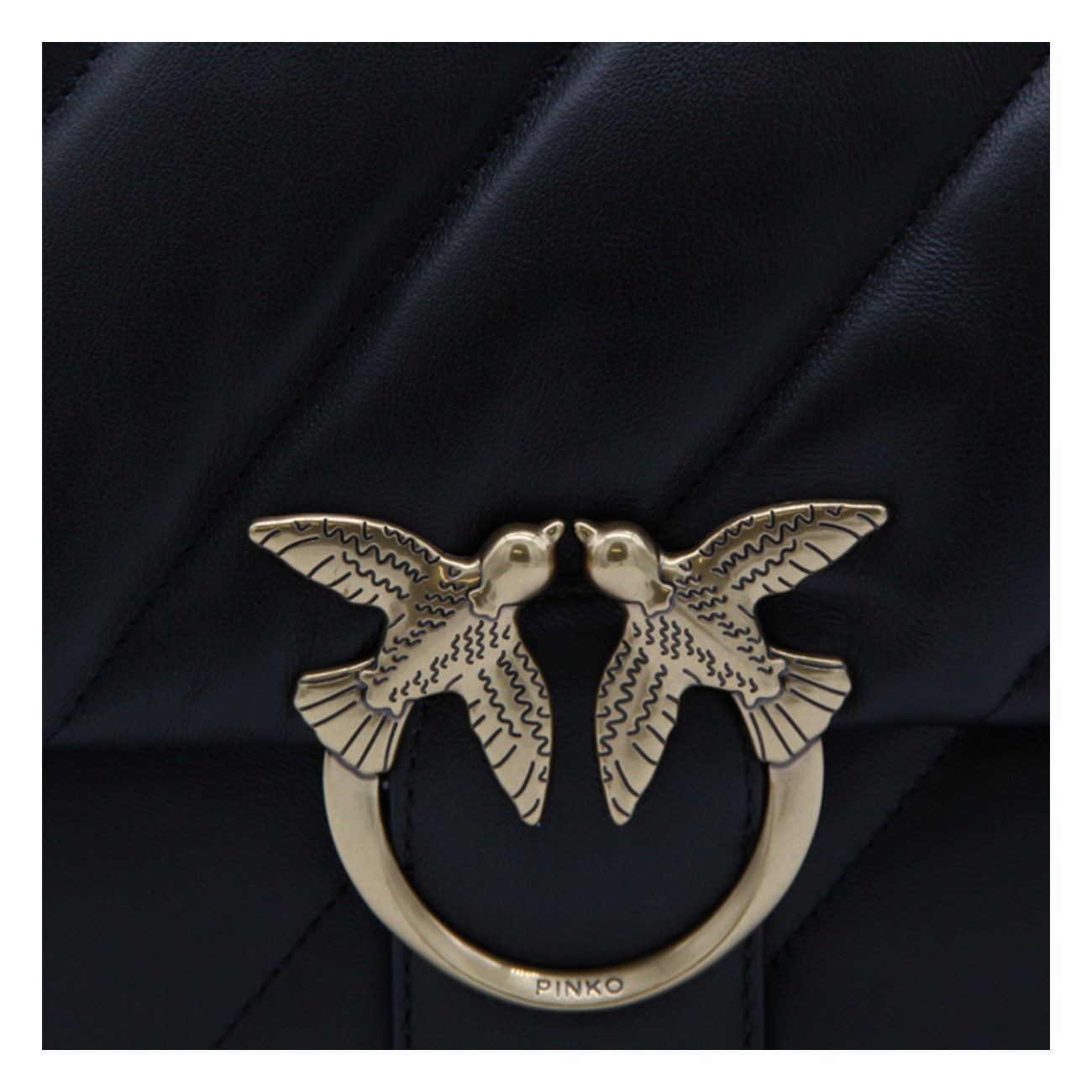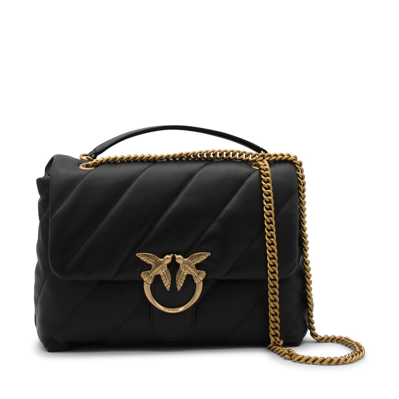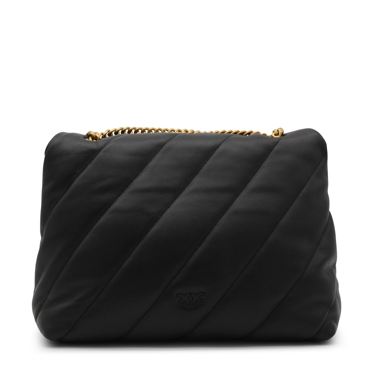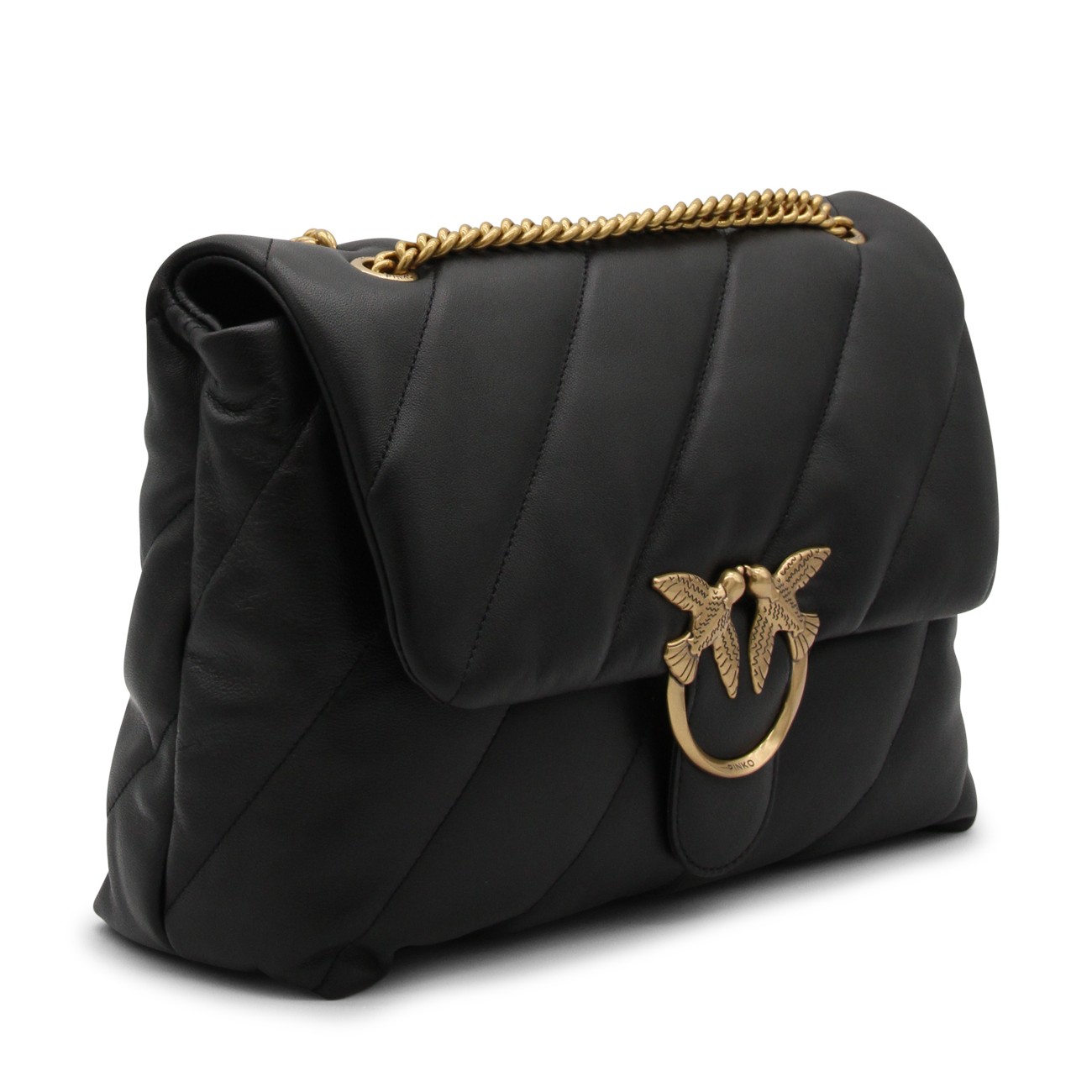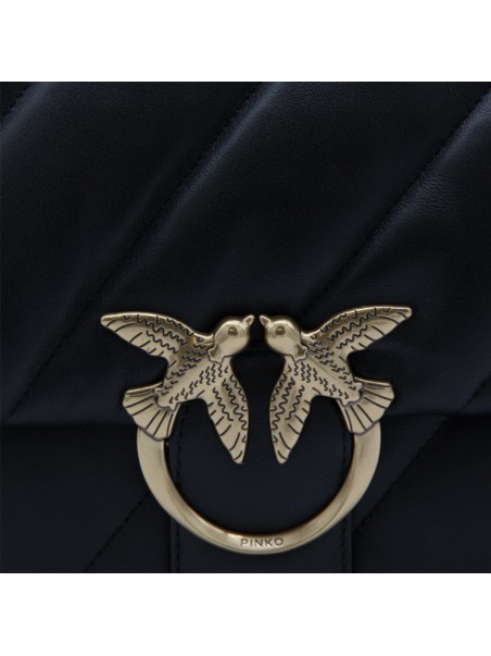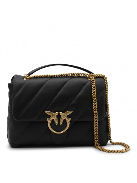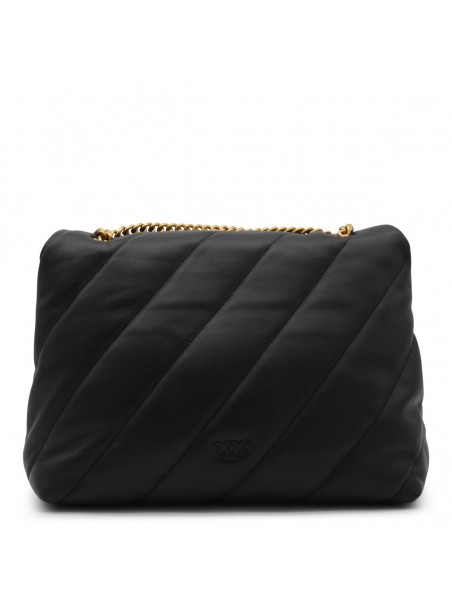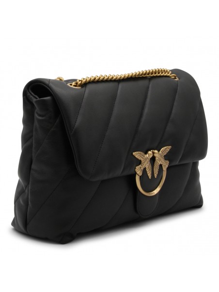 Black leather Love Big Puff crossbody bag from Pinko featuring signature Love Birds buckle, front flap closure and chain-link shoulder strap.