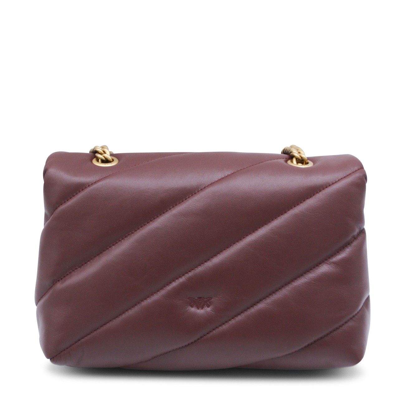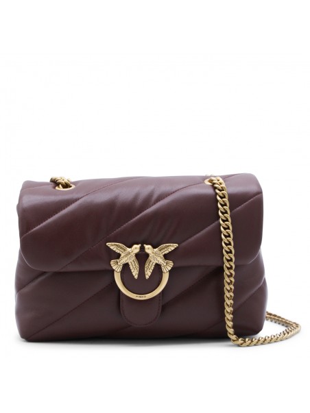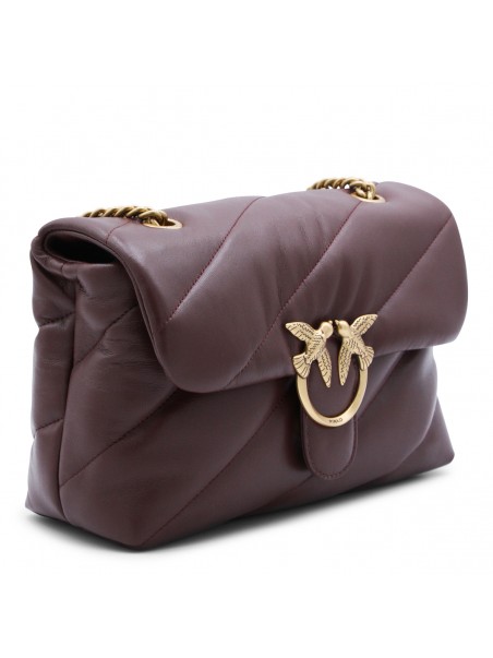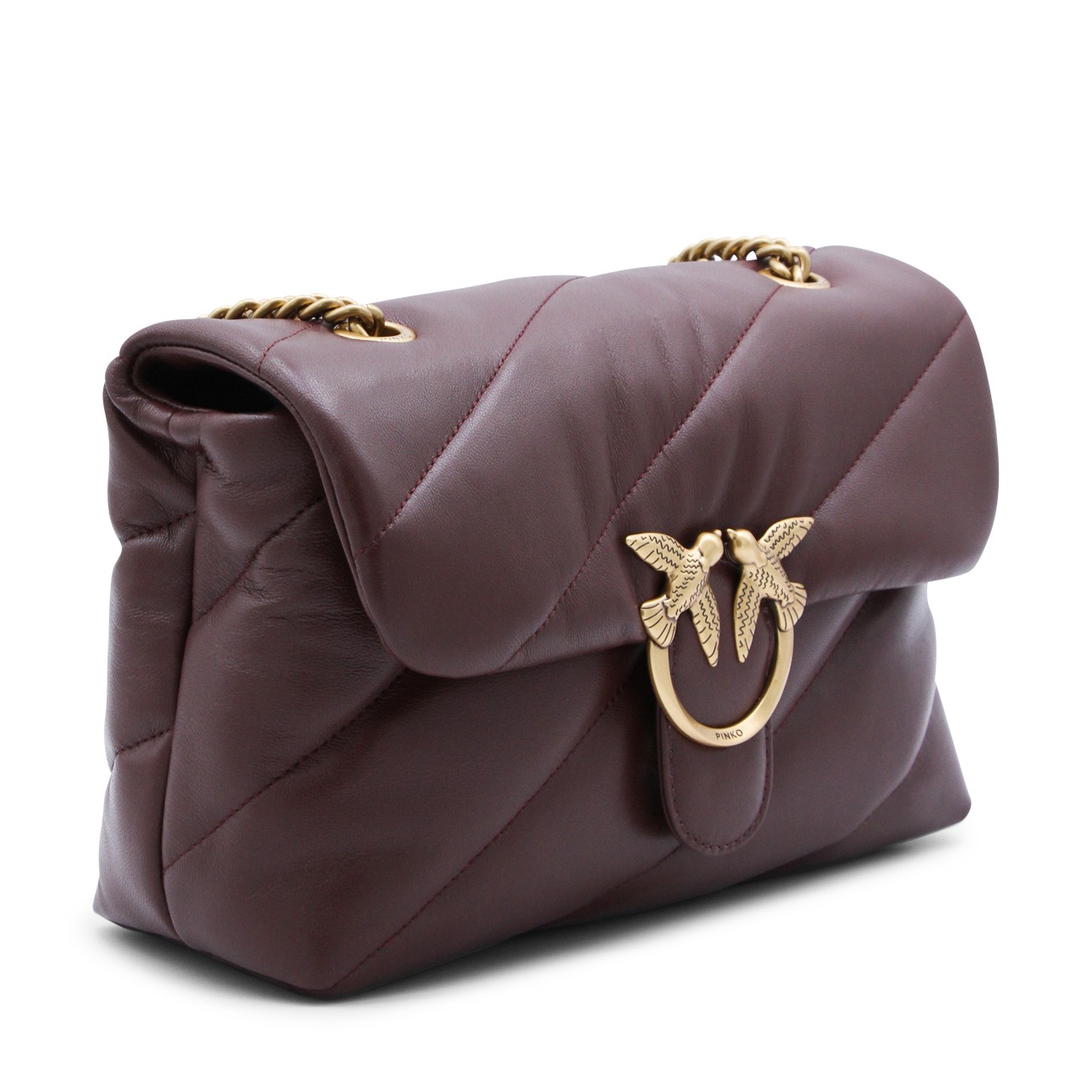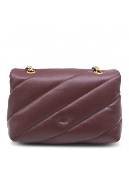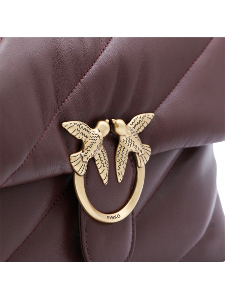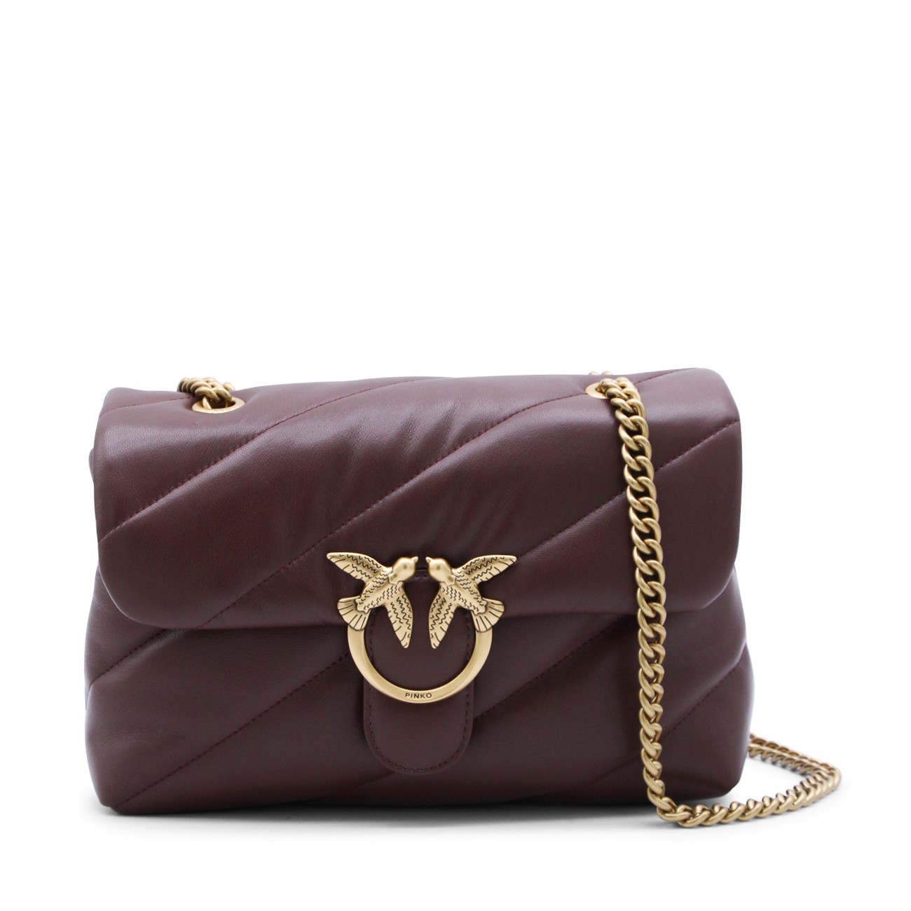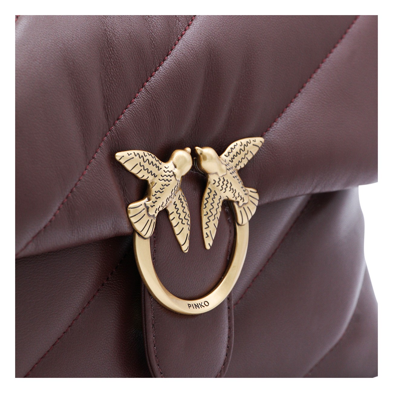 Burgundy leather Small Love Puff crossbody bag from Pinko featuring chain shoulder strap, frontal logo embellishment, frontal button closure, zip fastening, main compartment and gold tone hardware.