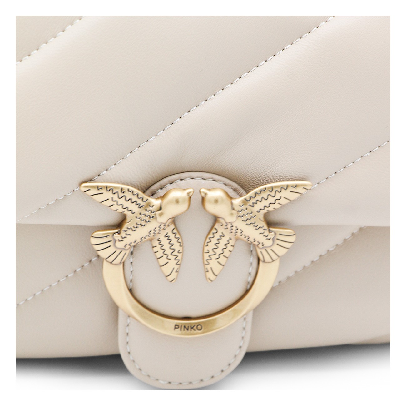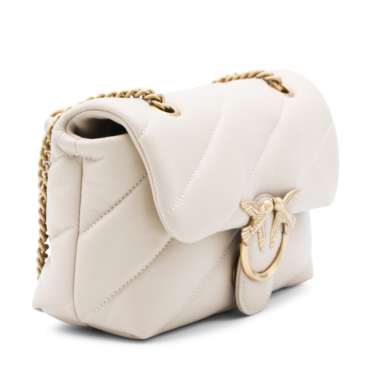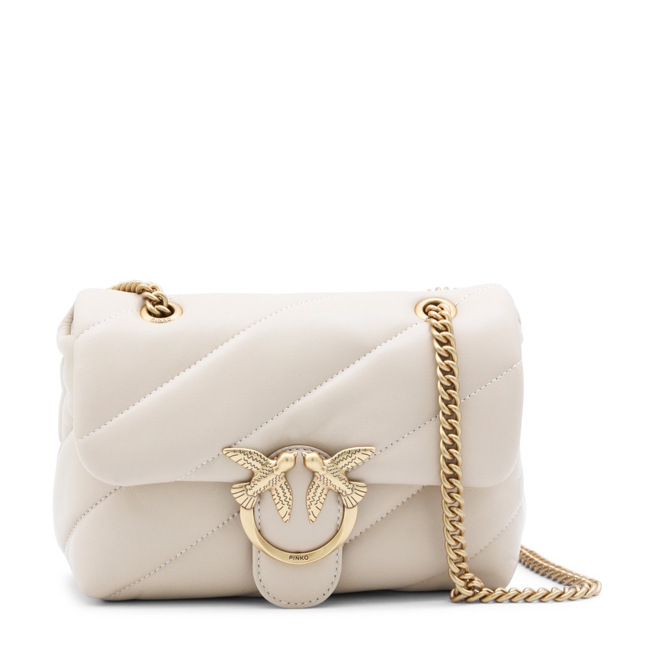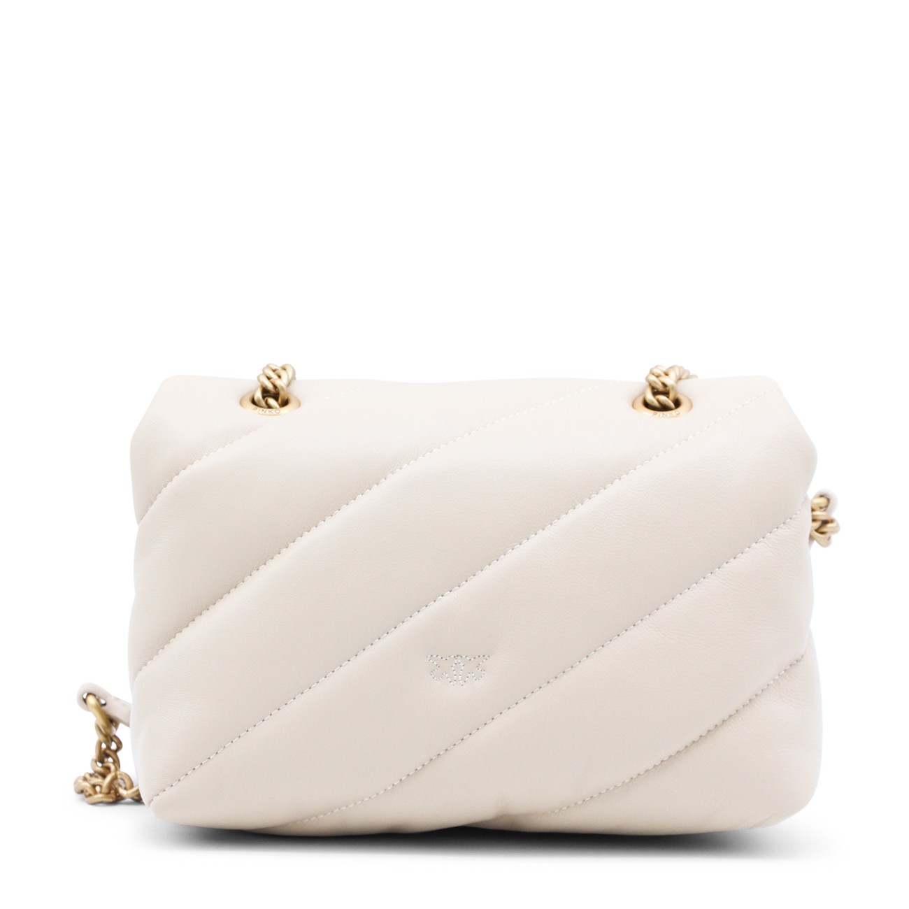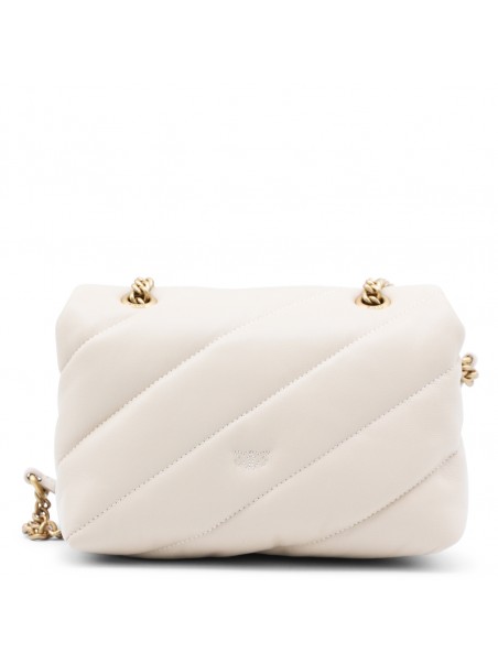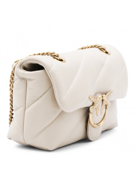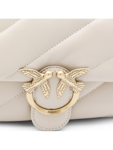 Beige leather Small Love Puff crossbody bag from Pinko featuring chain shoulder strap, frontal logo embellishment, frontal button closure, zip fastening, main compartment and gold tone hardware.