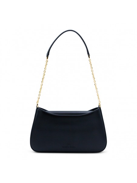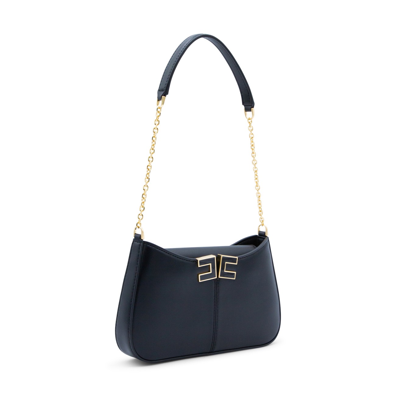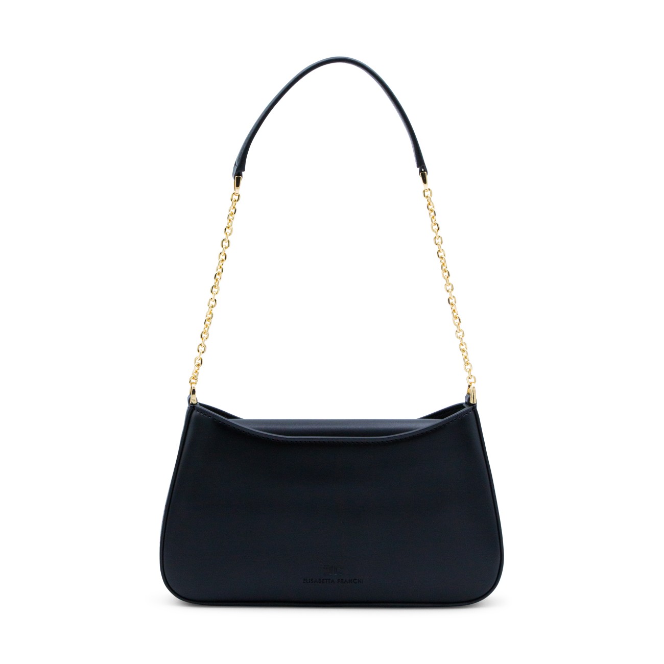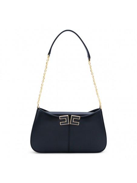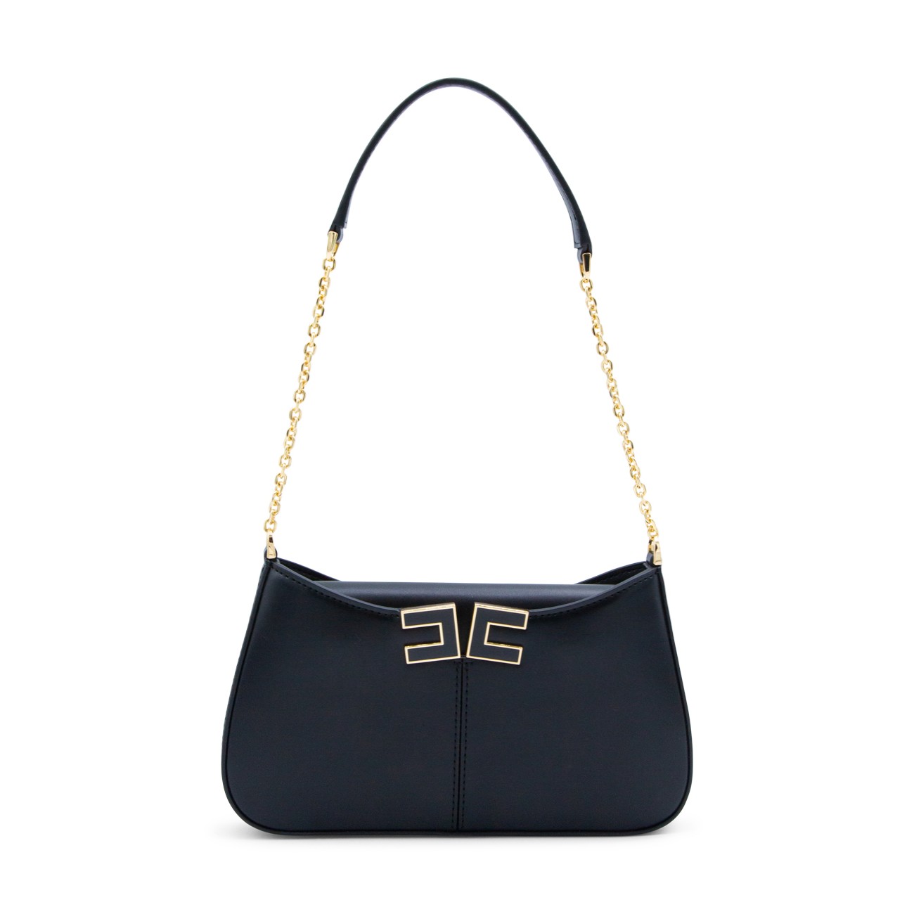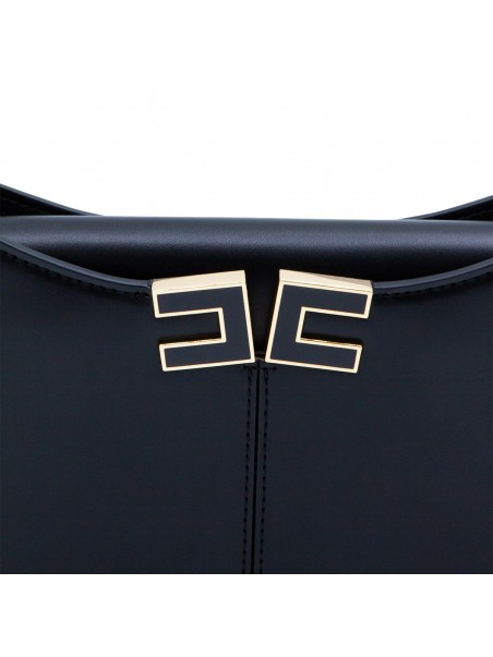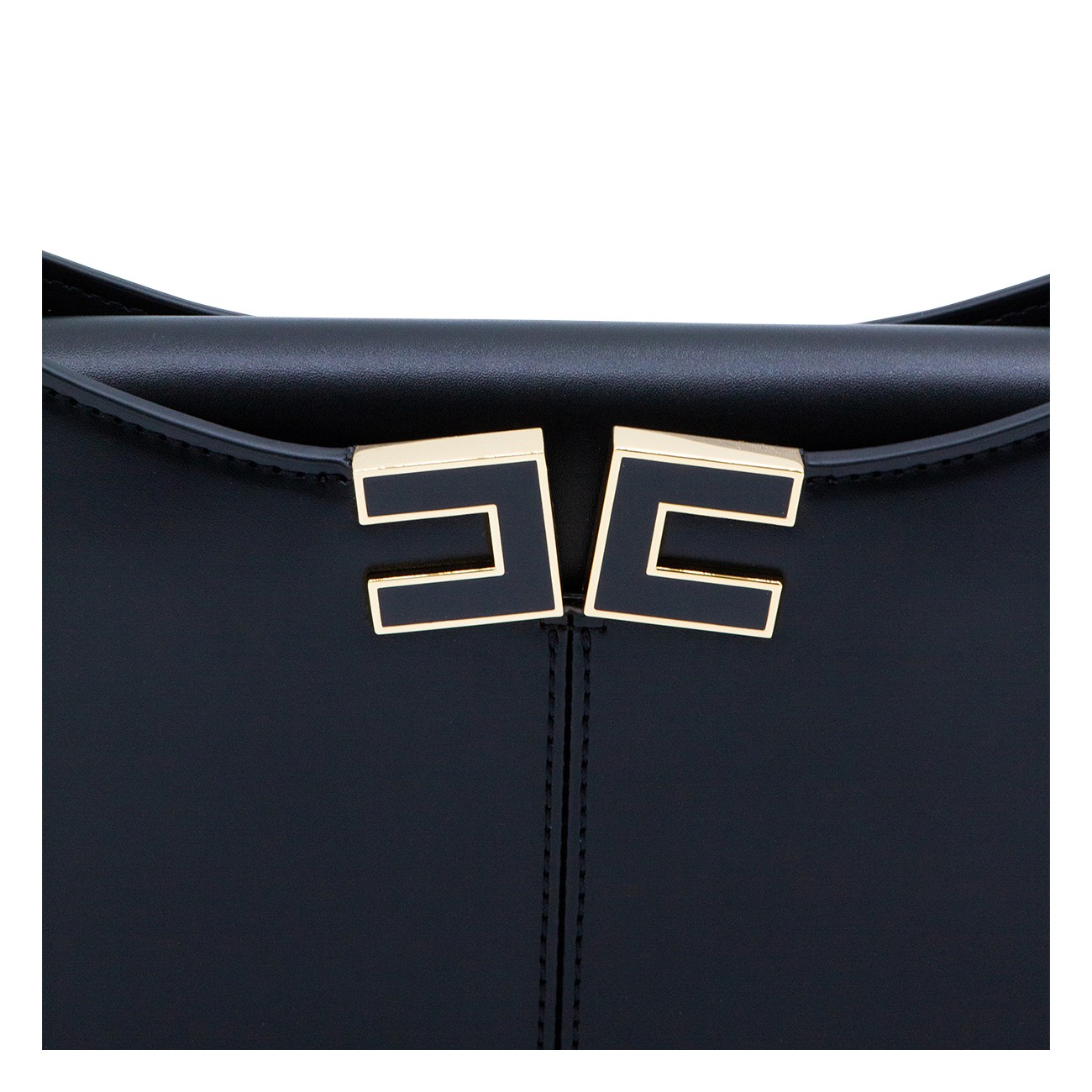 Black shoulder bag from Elisabetta Franchi featuring upper fastening, gold tone hardware, frontal logo and pocket.