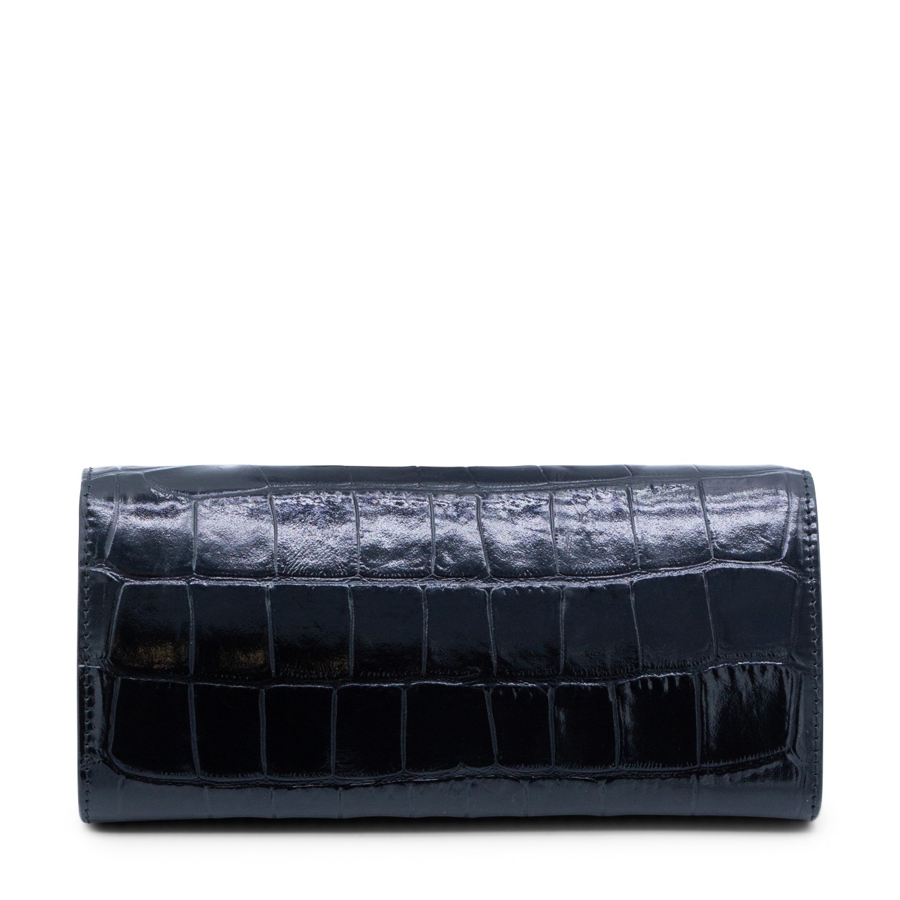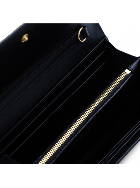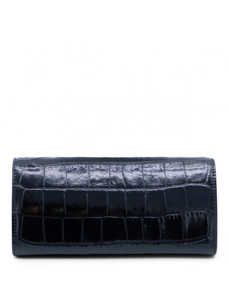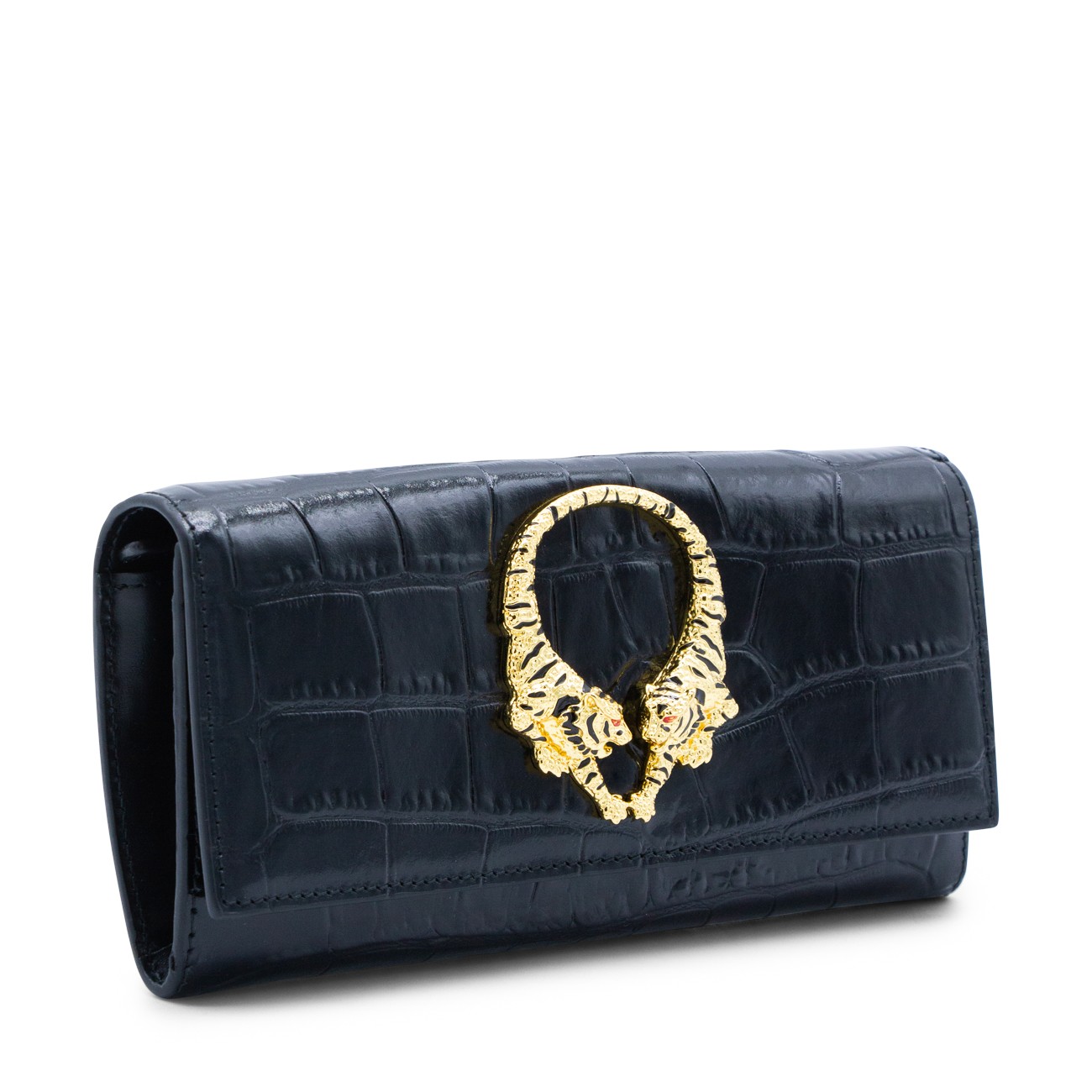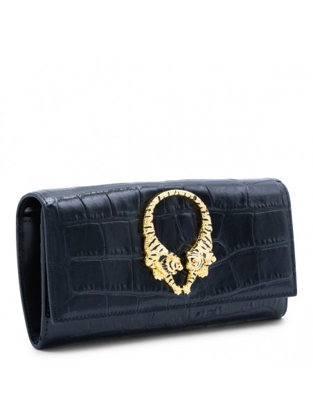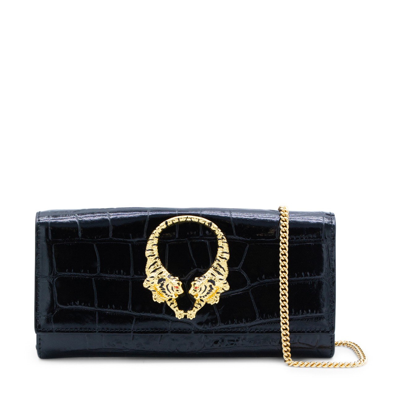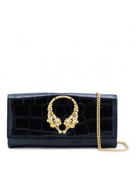 Black leather crossbody bag from Roberto Cavalli featuring crocodile-effect leather, rectangular shape, gold jeweled tigers, snap button, chain shoulder strap, interal card slots and zip pocket.