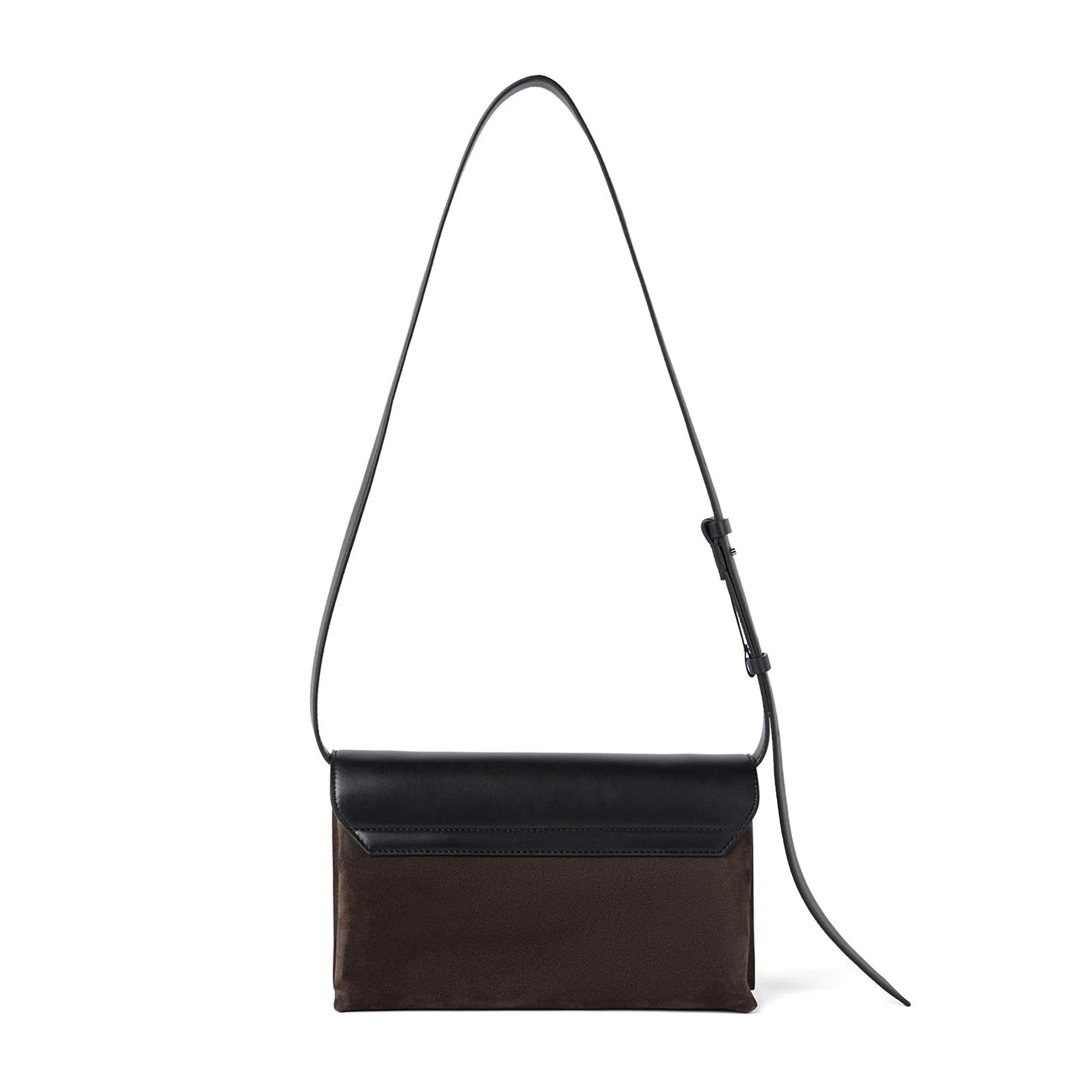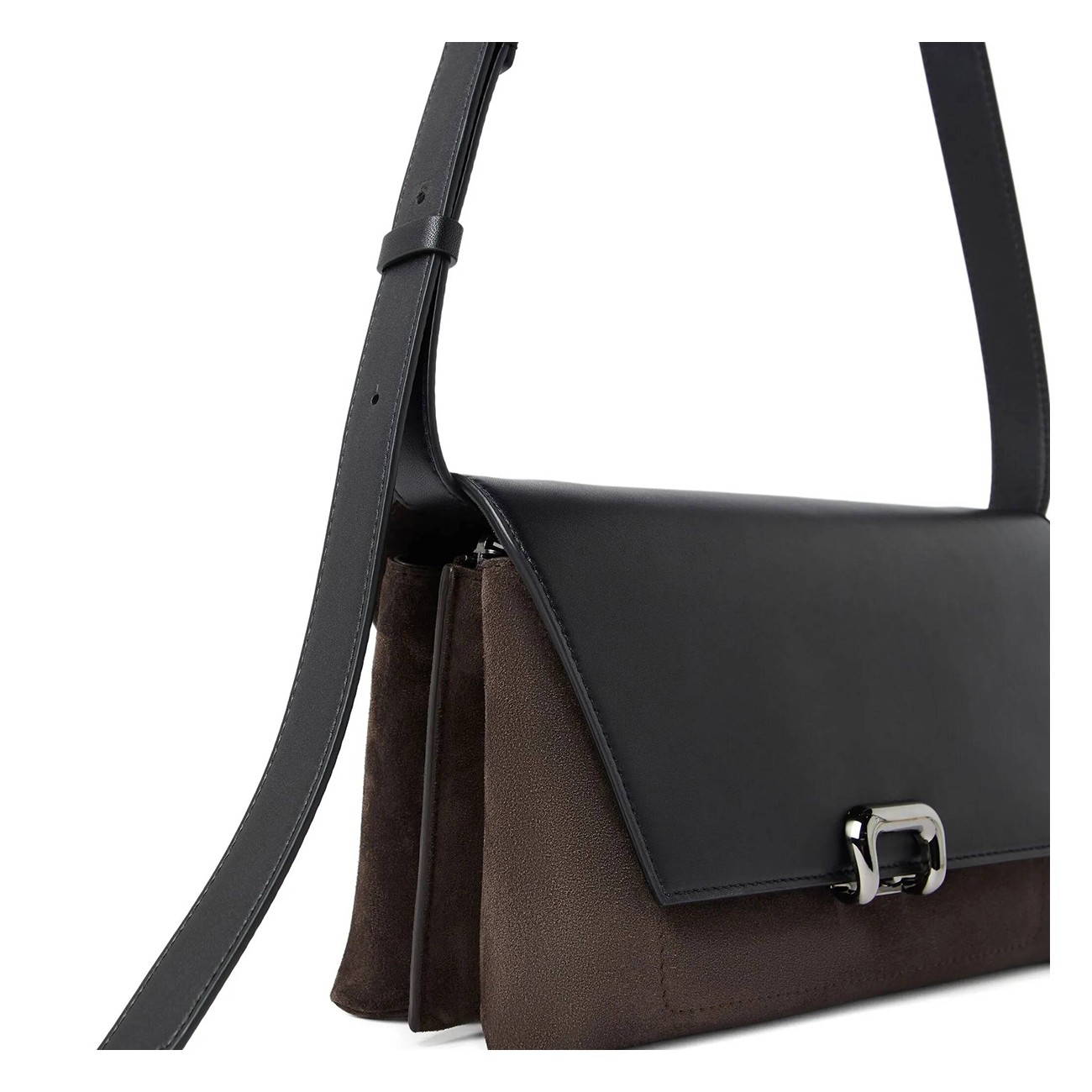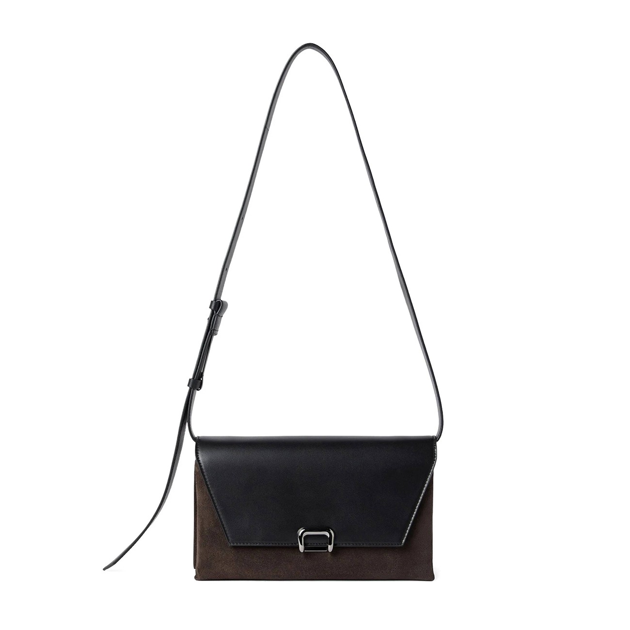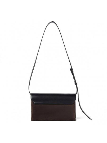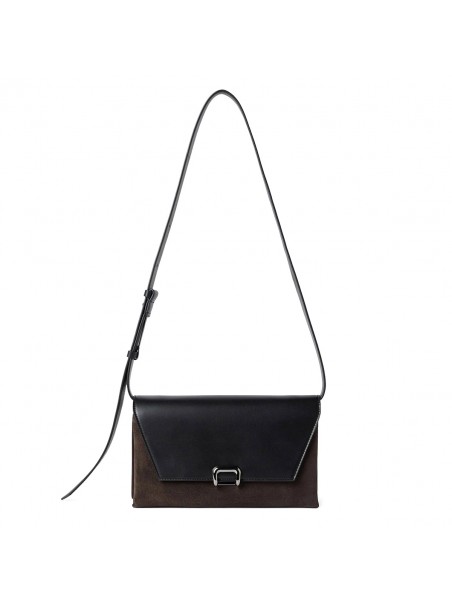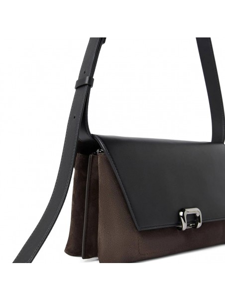 Black leather crossbody bag from Brunello Cucinelli featuring adjustable shoulder strap, frontal fastening, magnetic closure, frontal silver tone buckle and internal pockets.