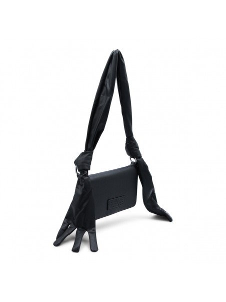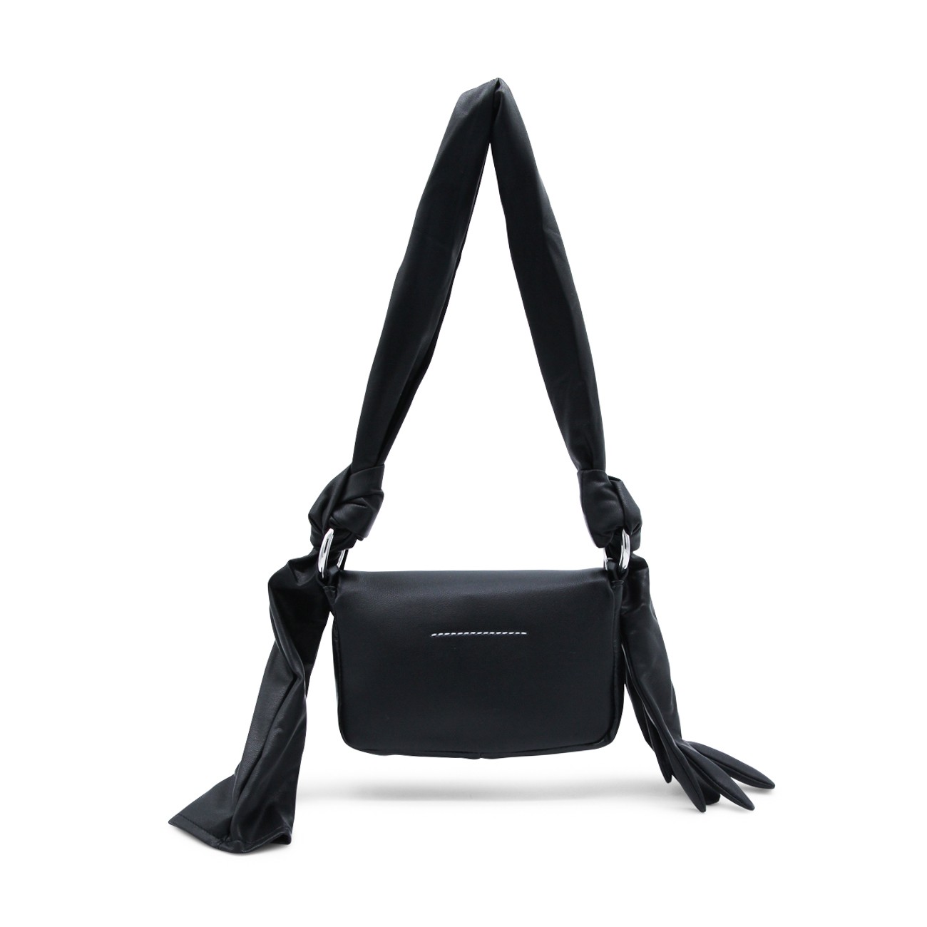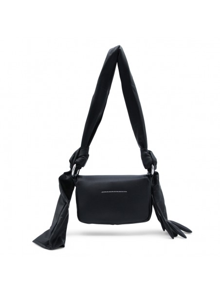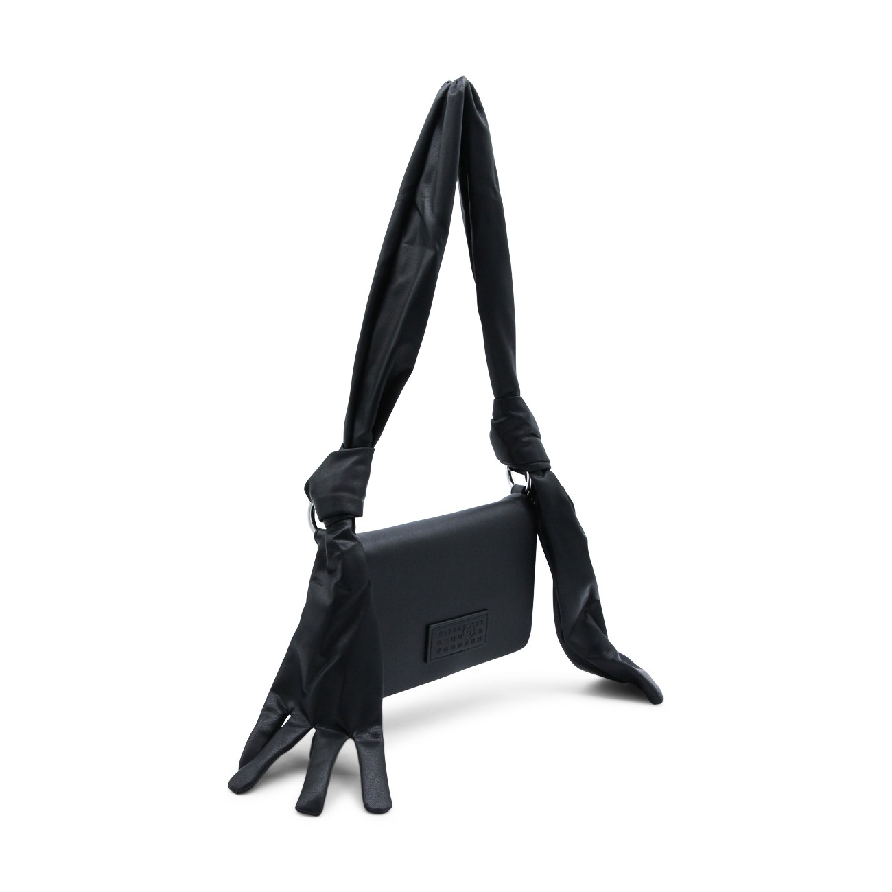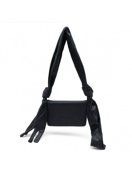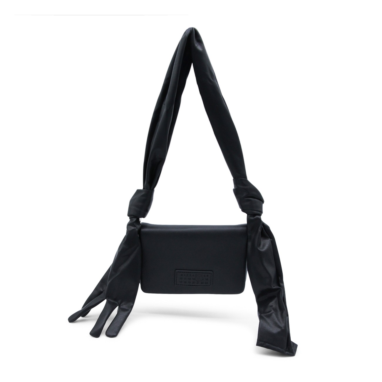 Black leather Glove shoulder bag from MM6 Maison Margiela featuring shoulde strap with knot and glove detail, magnetic closure under the flap, main compartment, frontal logo patch and white stitching on the back.