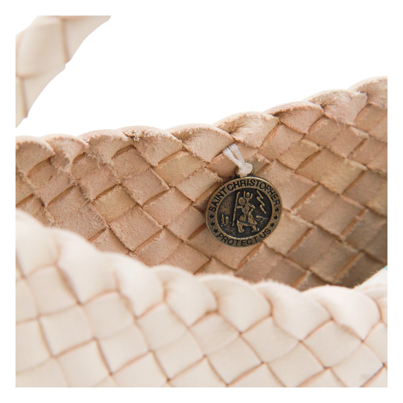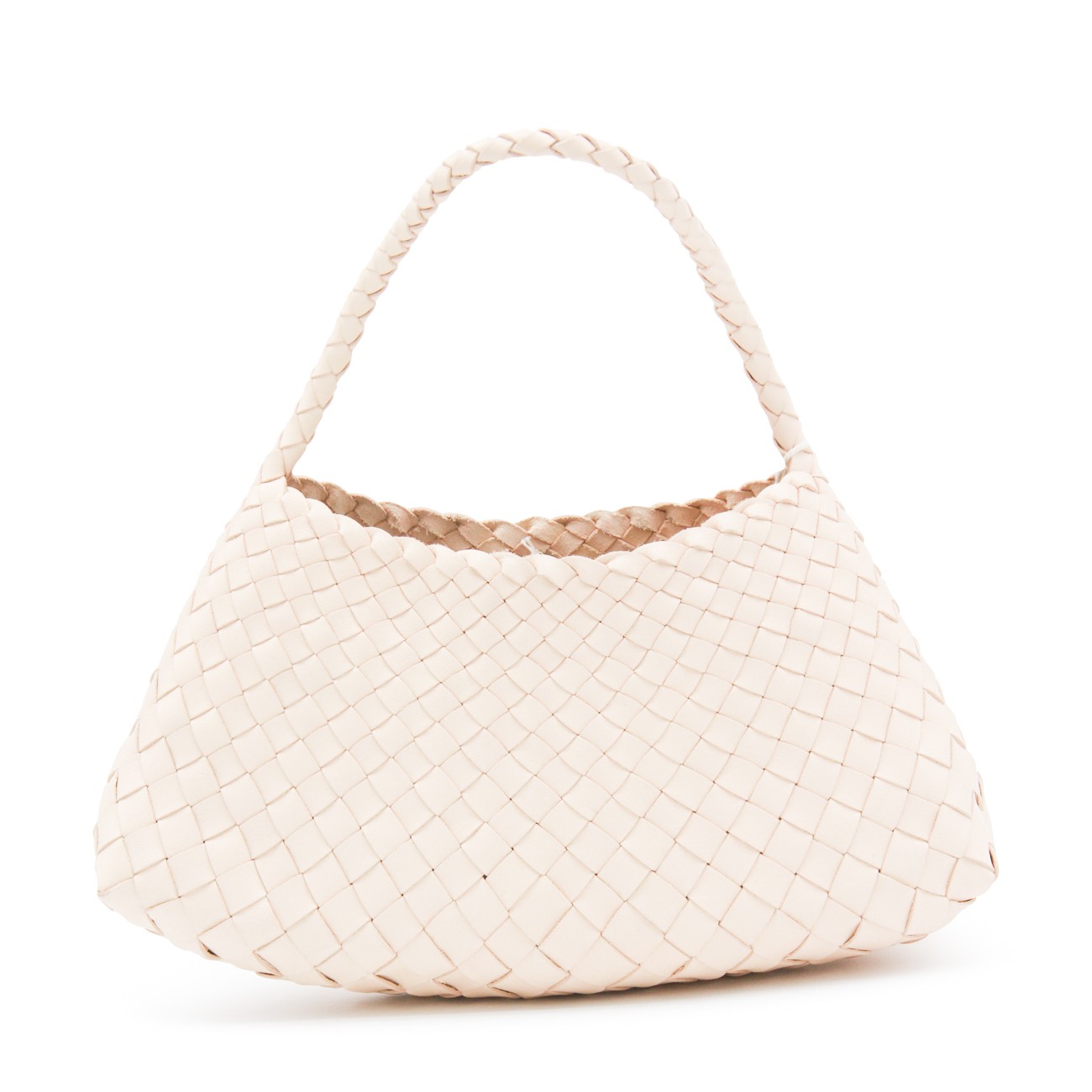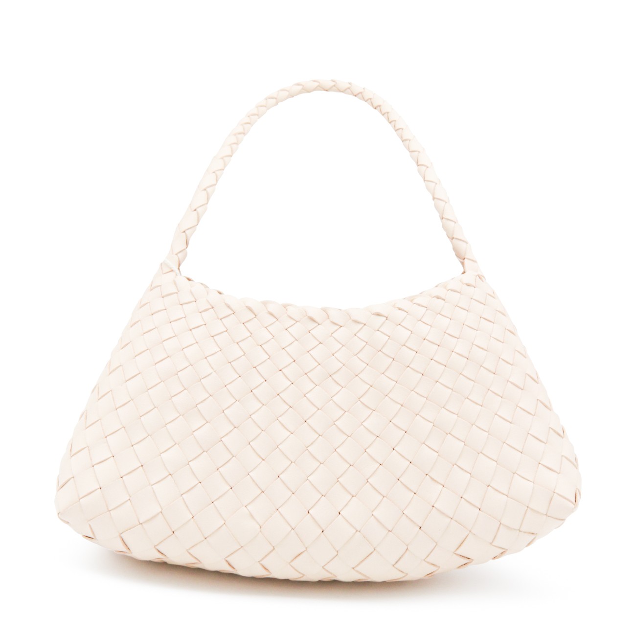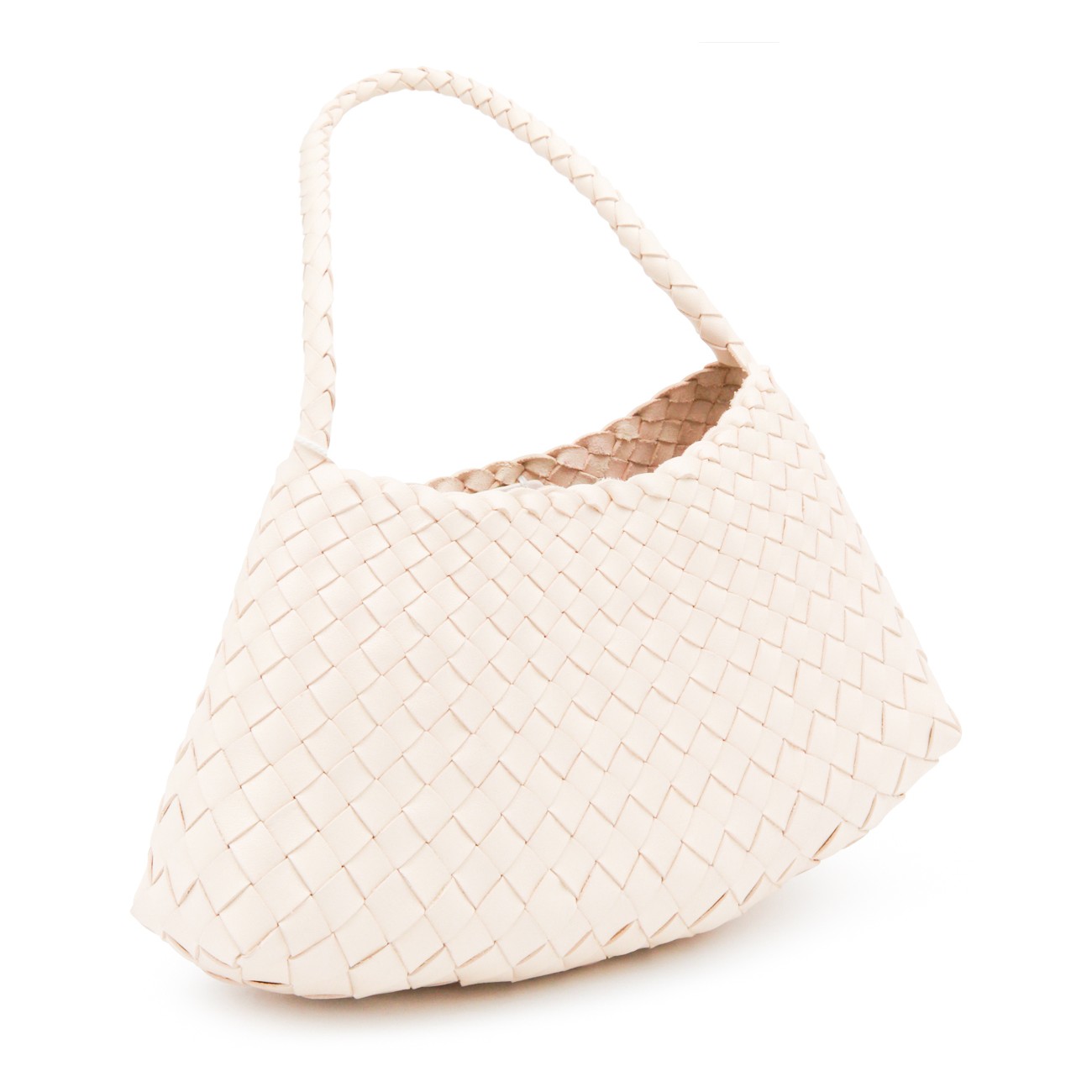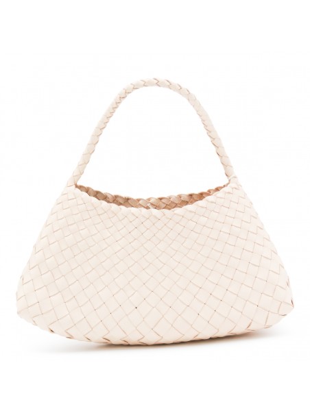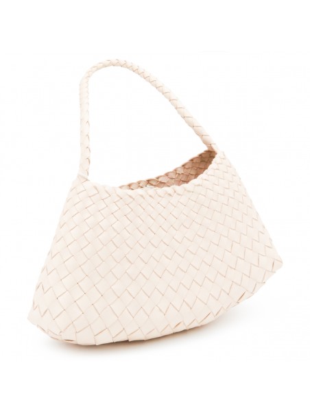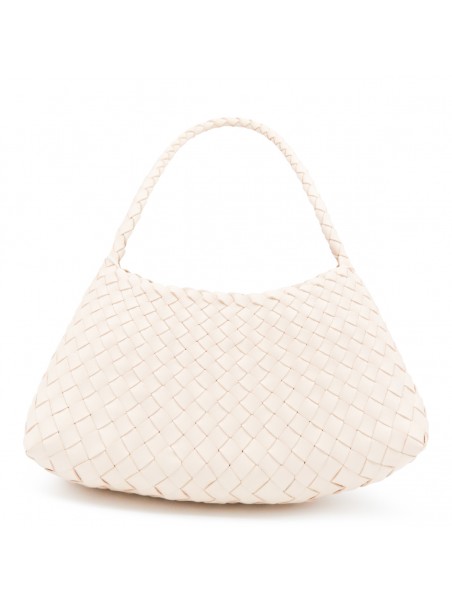White leather Rosanna shoulder bag from Dragon Diffusion featuring top handle, knitted costruction and inside pocket.