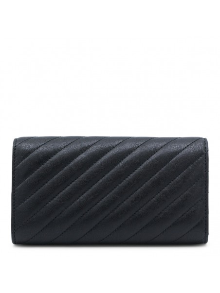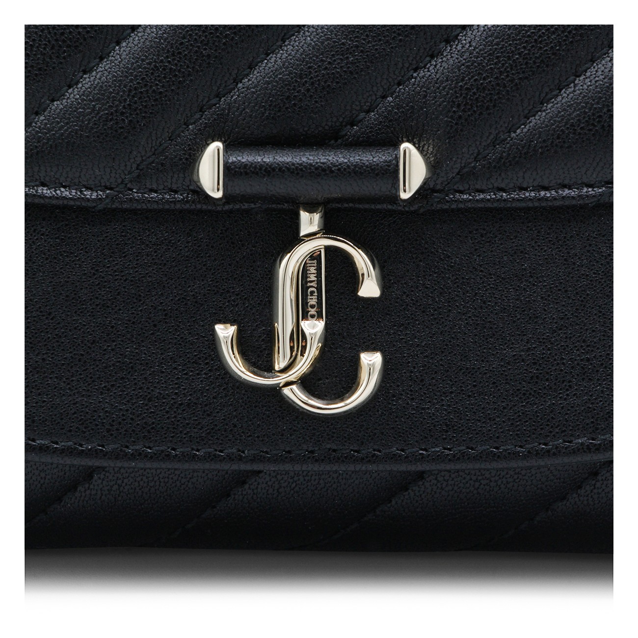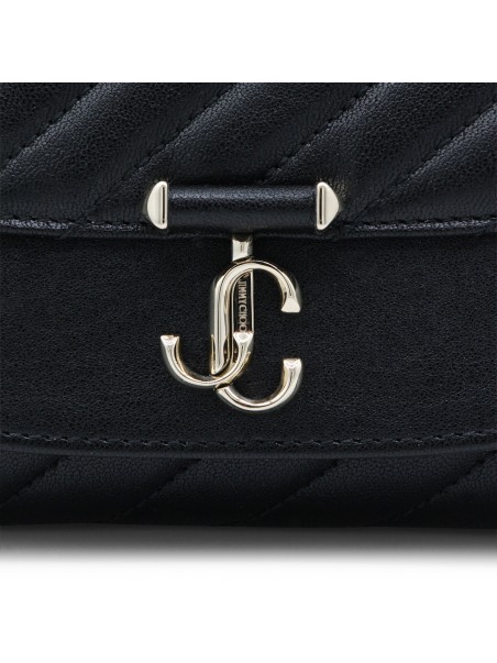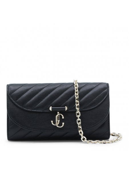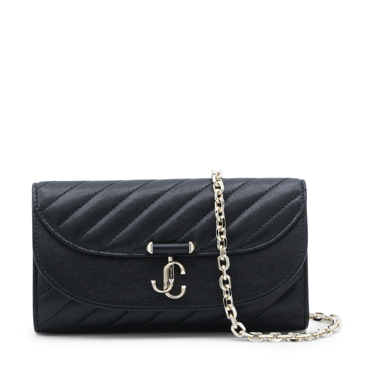 Black leather crossbody bag from Jimmy Choo featuring frontal fastening, envelope shape, chain, silver tone hardware and inside pocket.