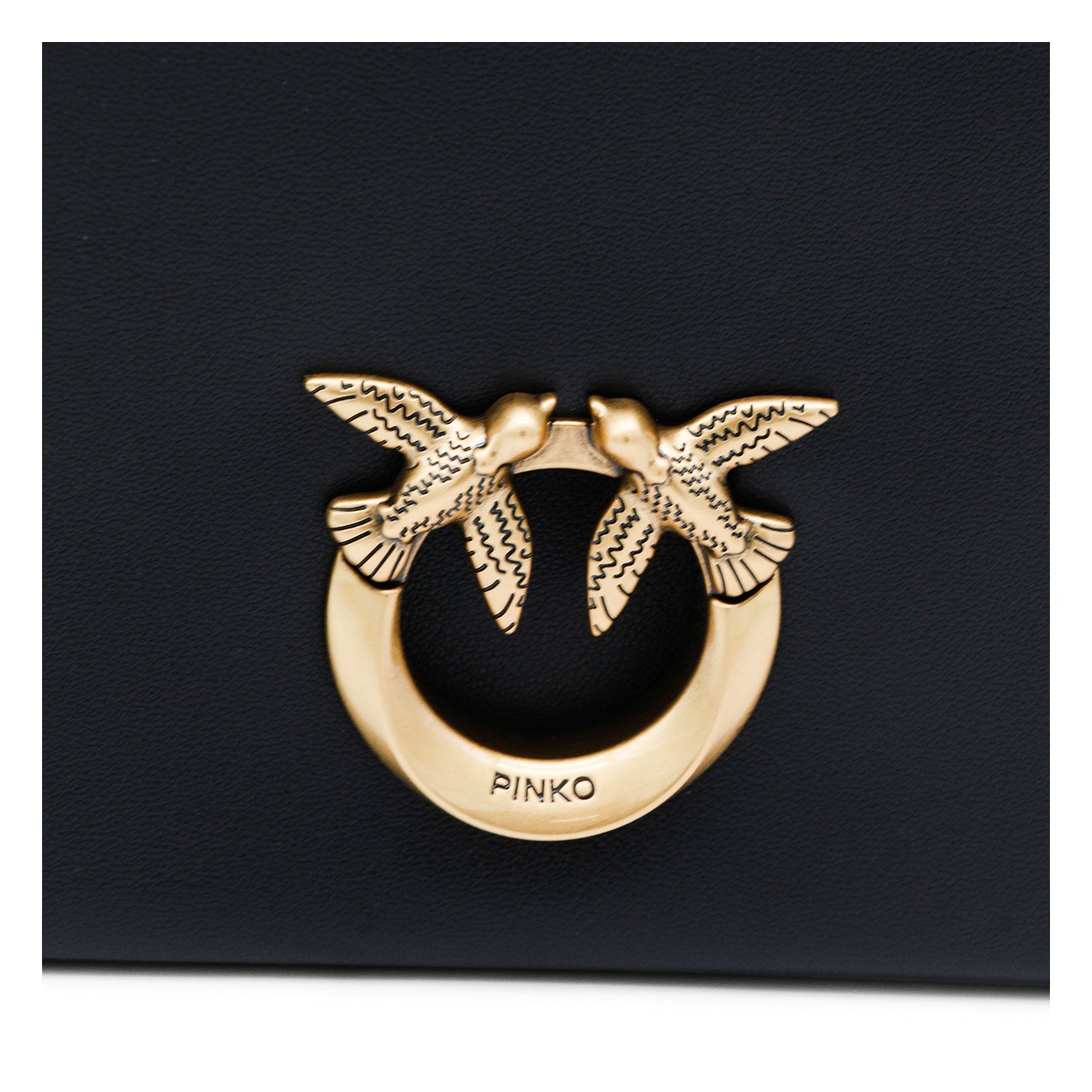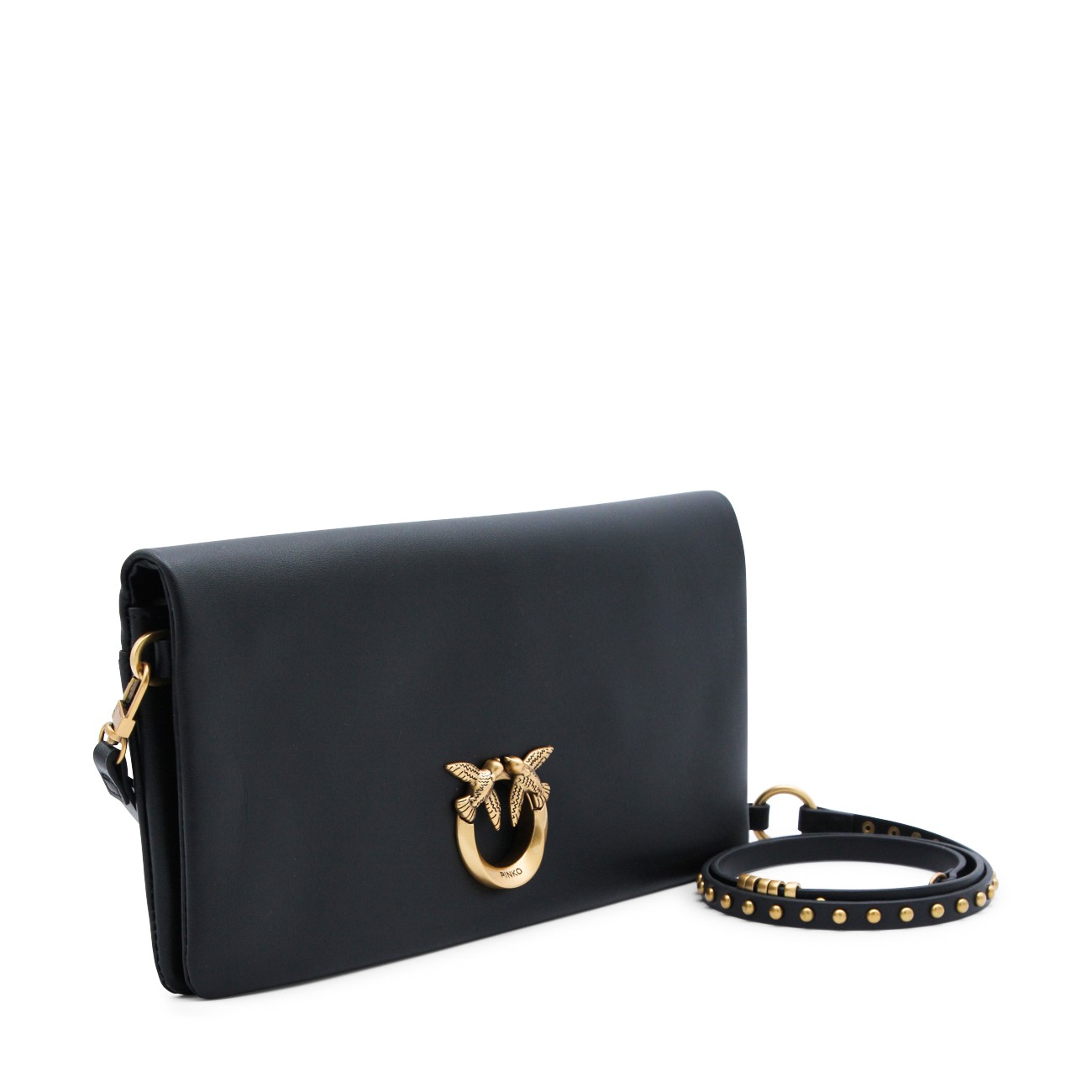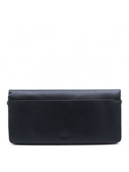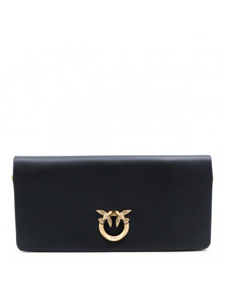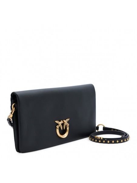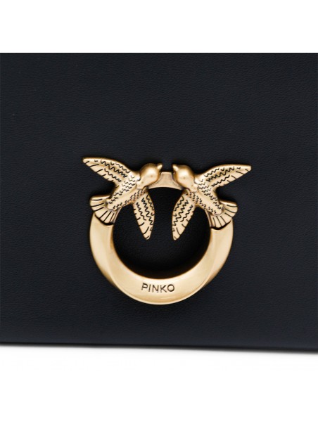 Black click soft Horizontal classic crossbody bag from Pinko featuring frontal fastening, gold tone hardware, chain, pocket and embossed logo.