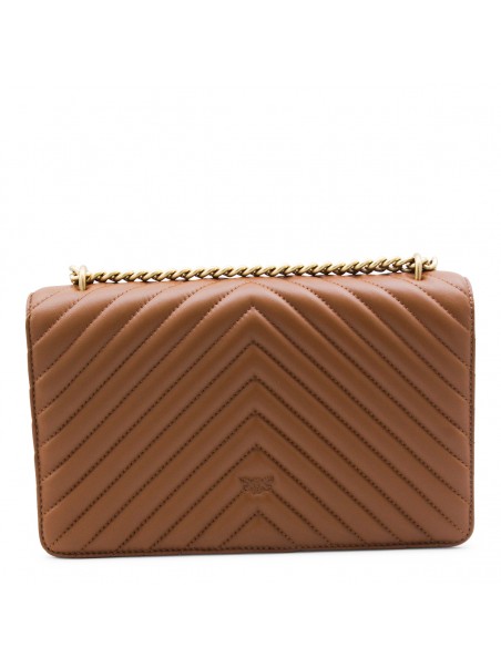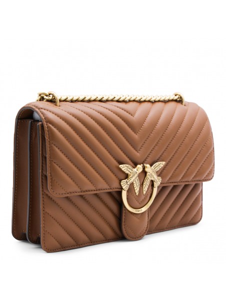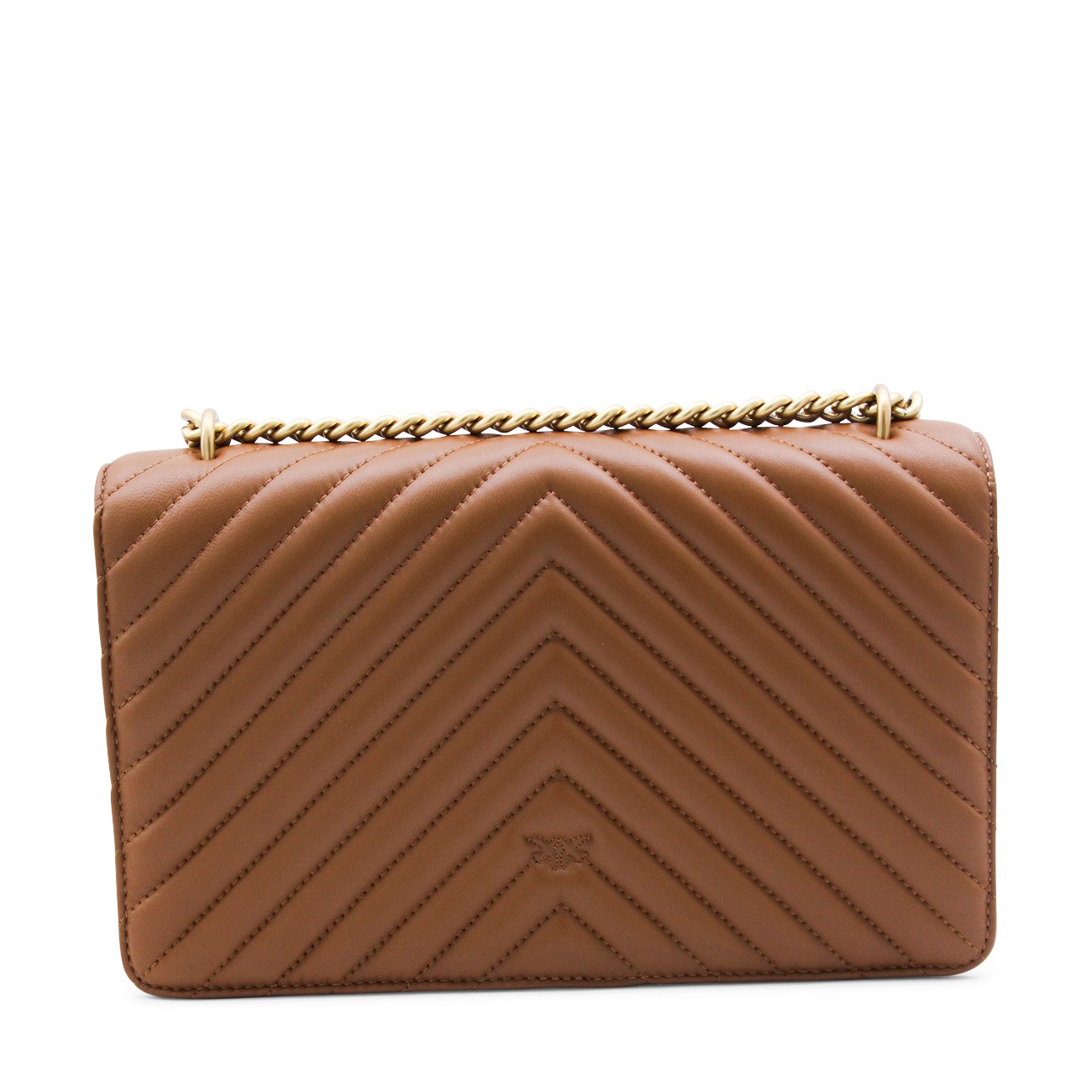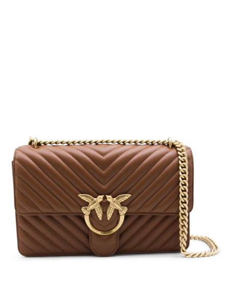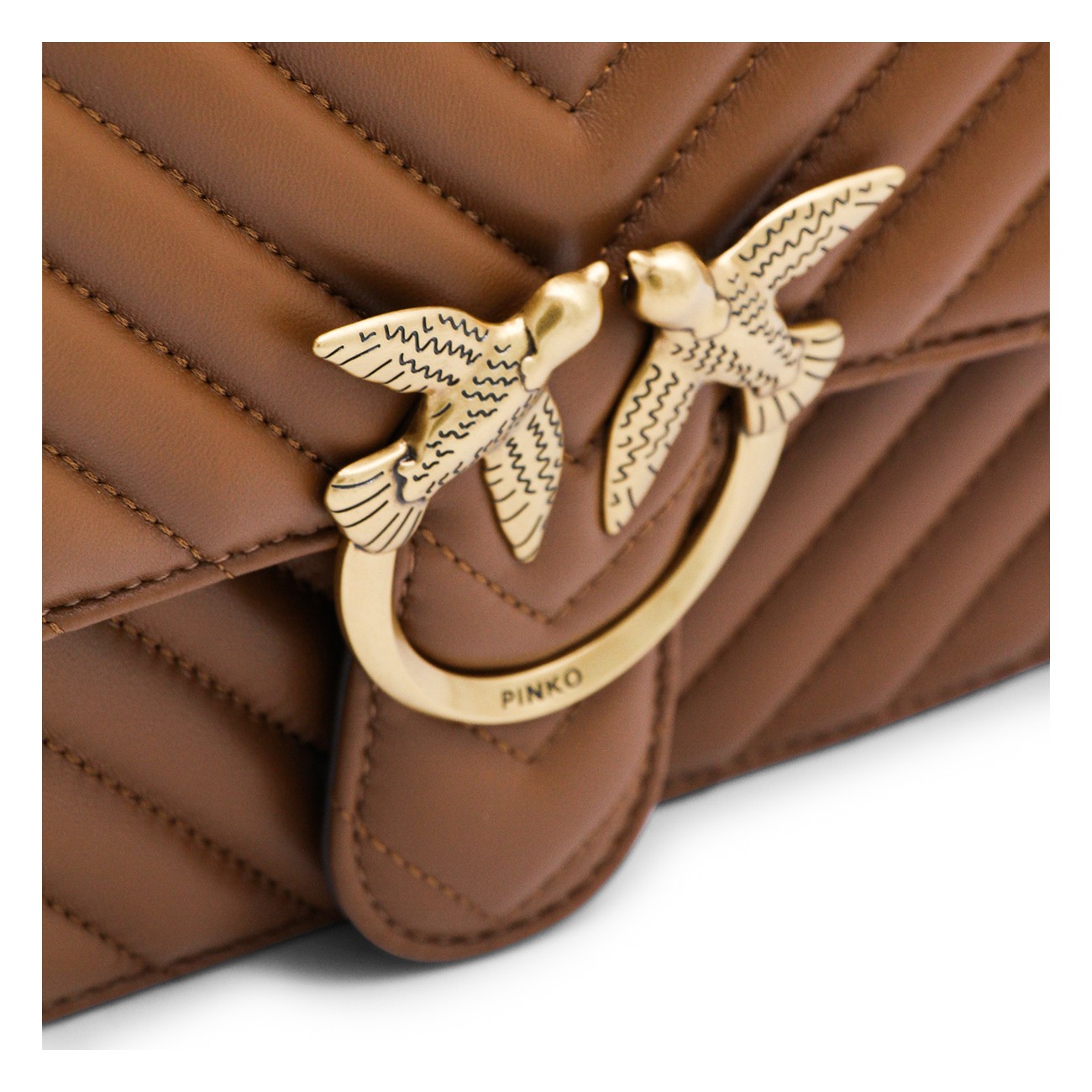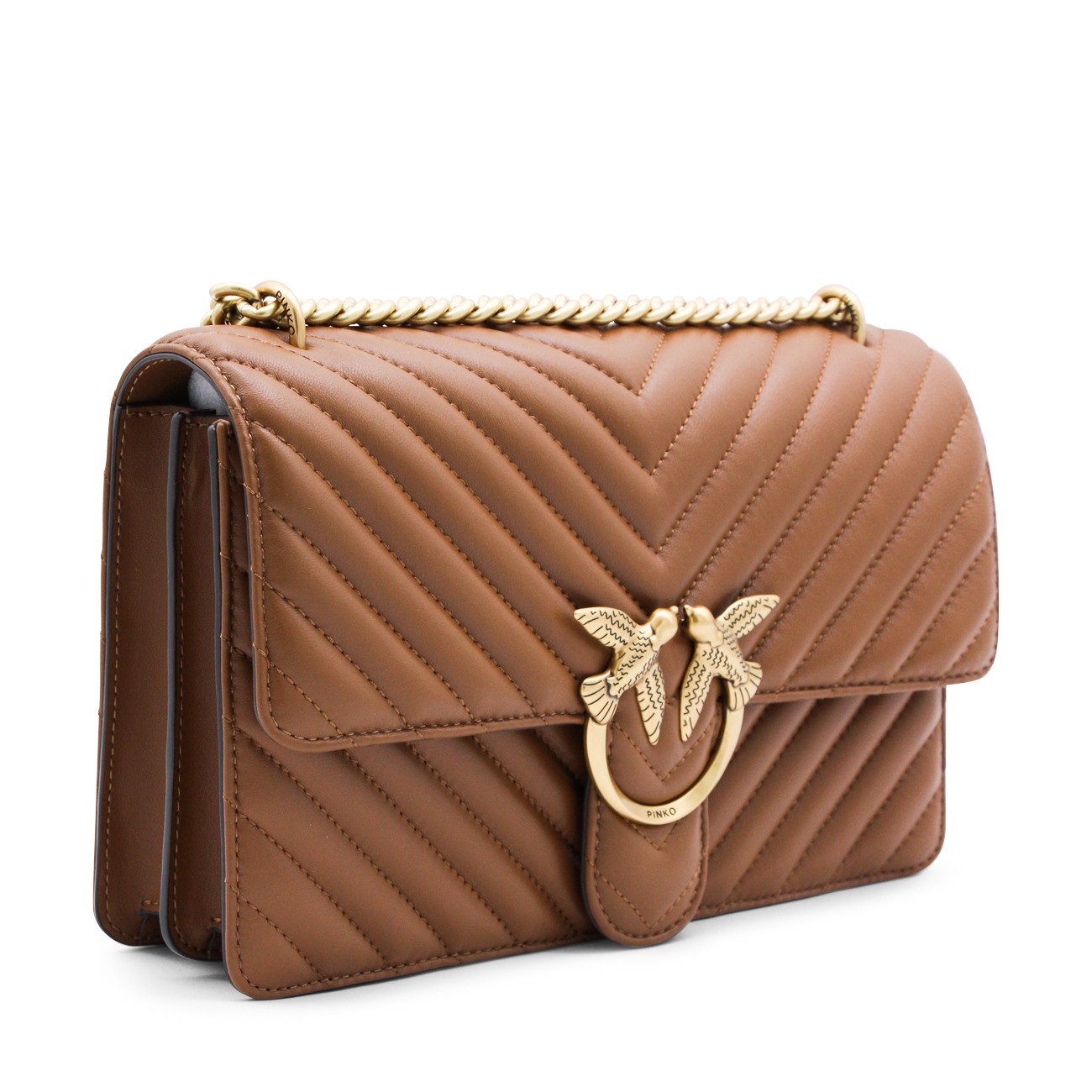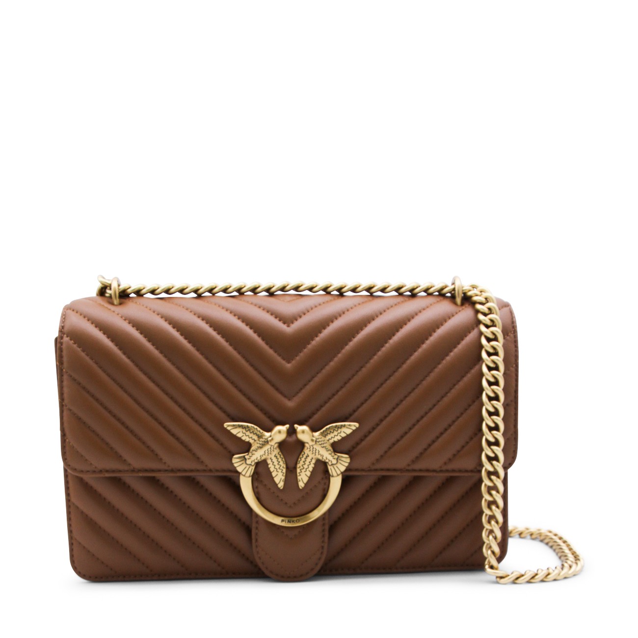 Brown leather Love One Classic DC shoulder bag from Pinko featuring internal pocket, removable chain, gold tone logo hardware and studded leather clasp closure.