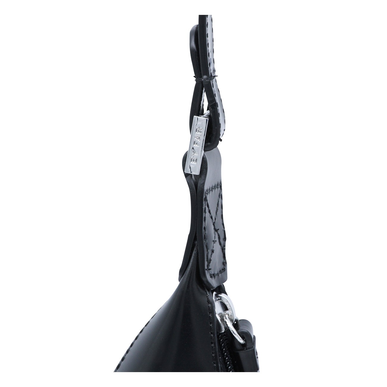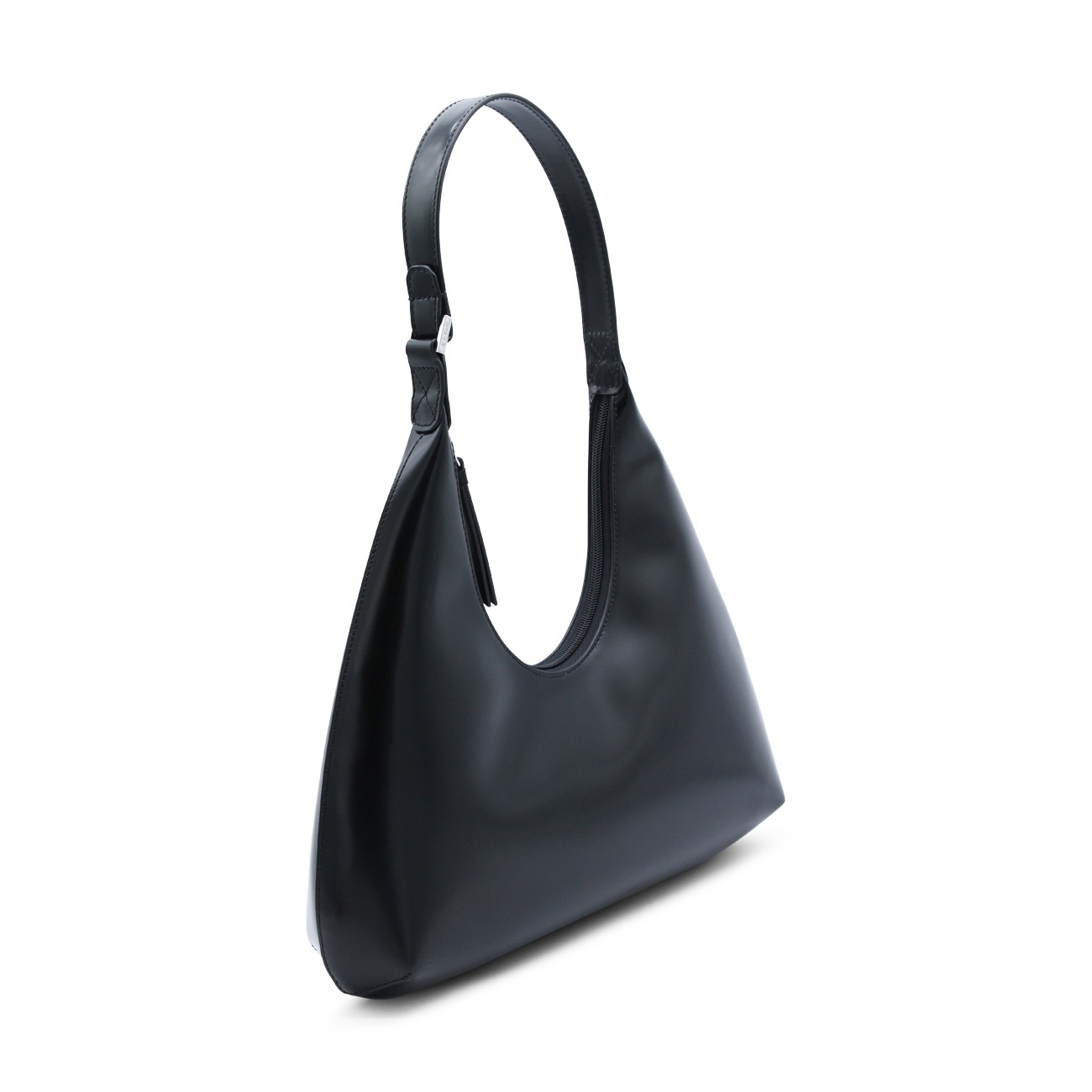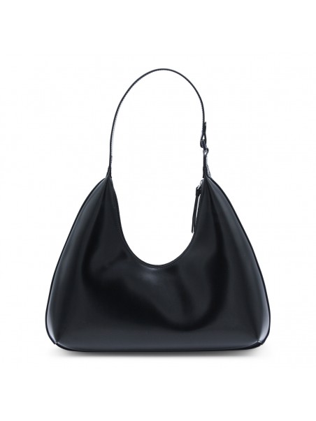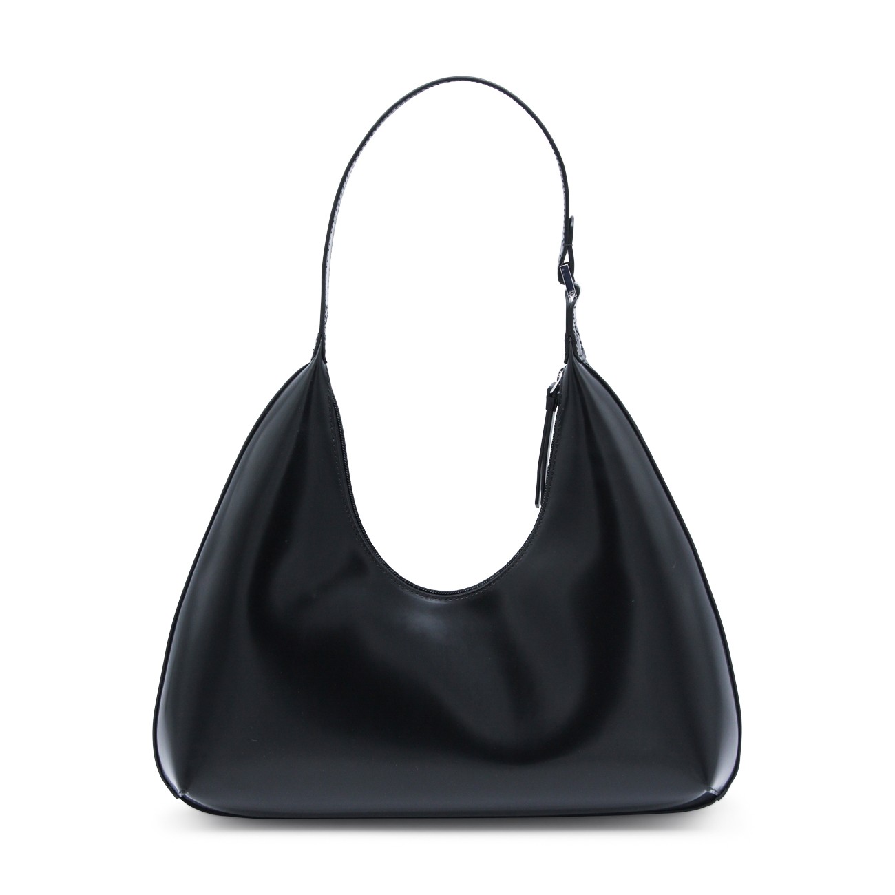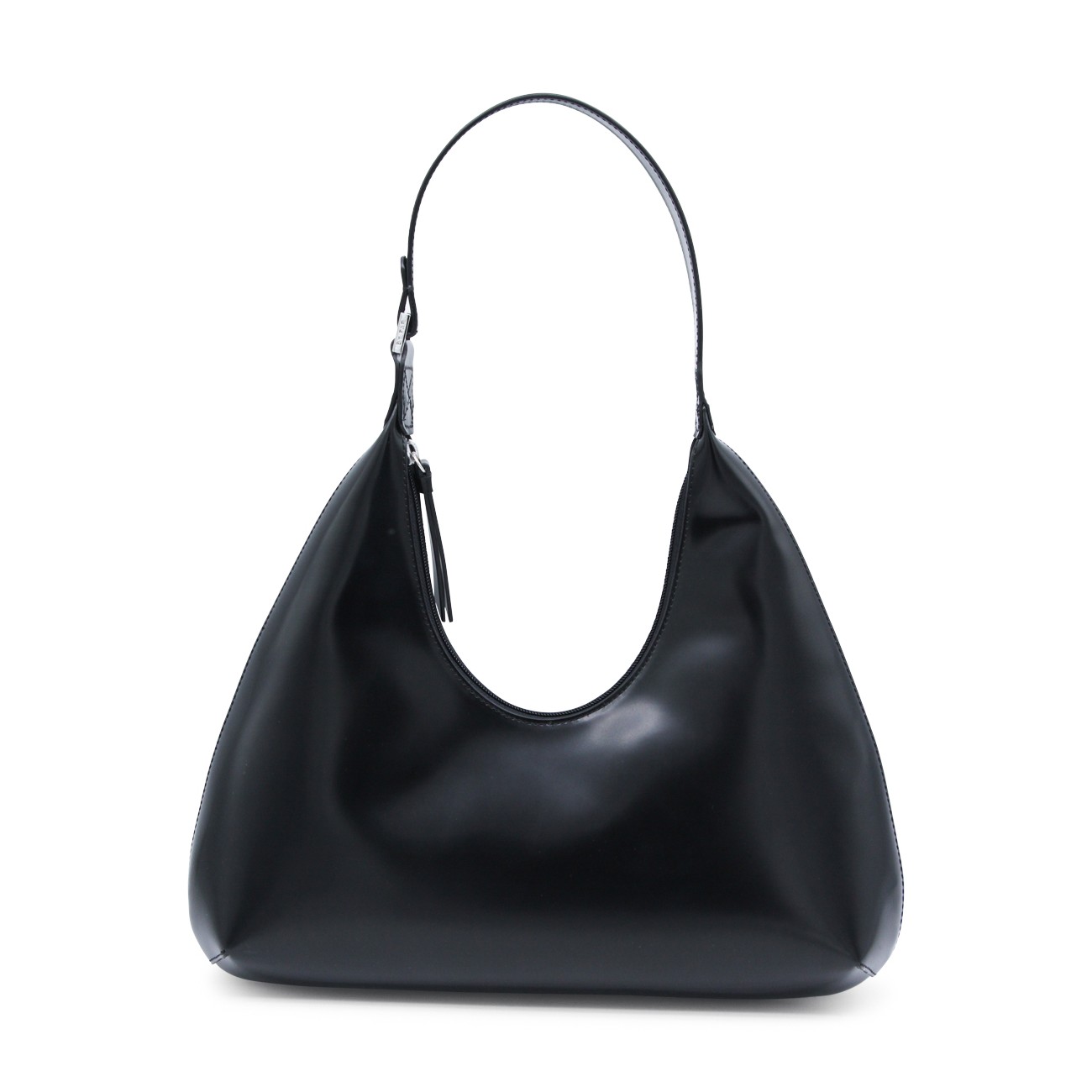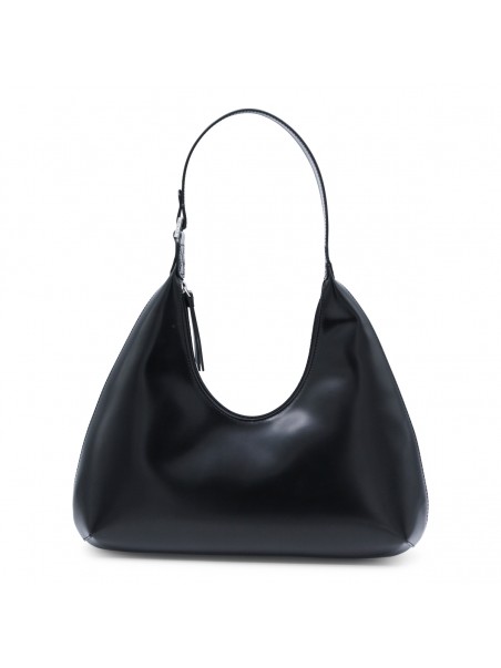 Amber semi patent leather shoulder bag from By Far featuring adjustable shoulder strap, zip fastening, internal pocket and silver tone hardware.