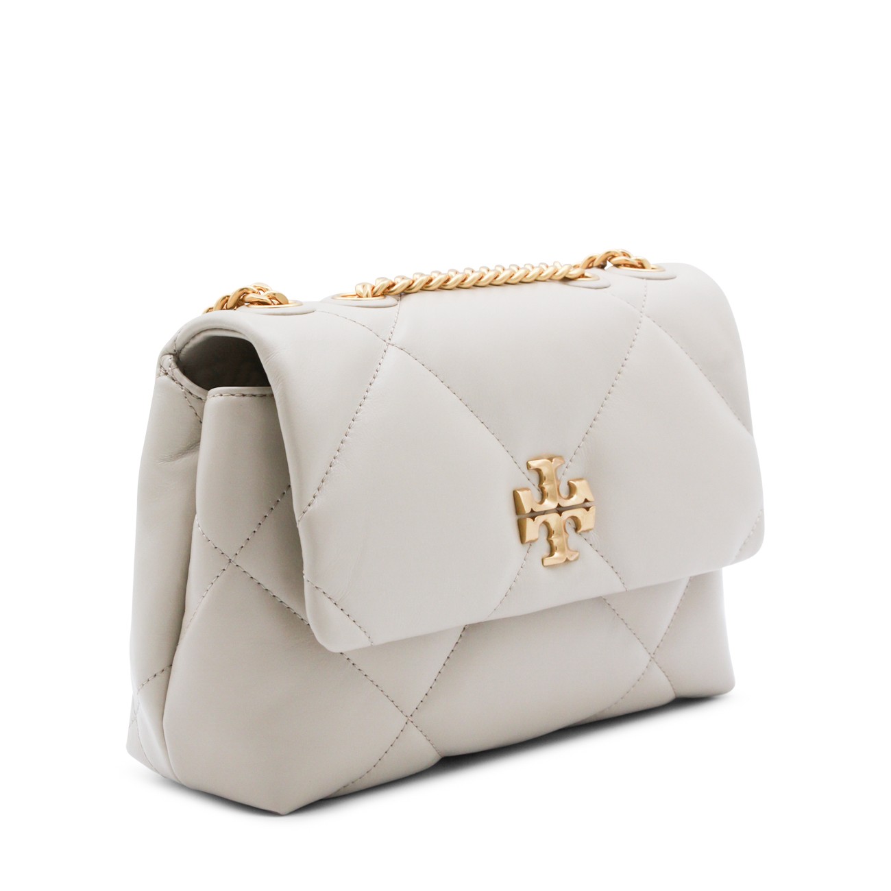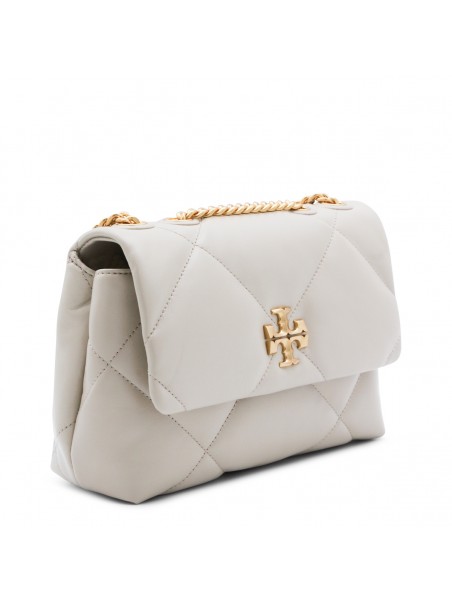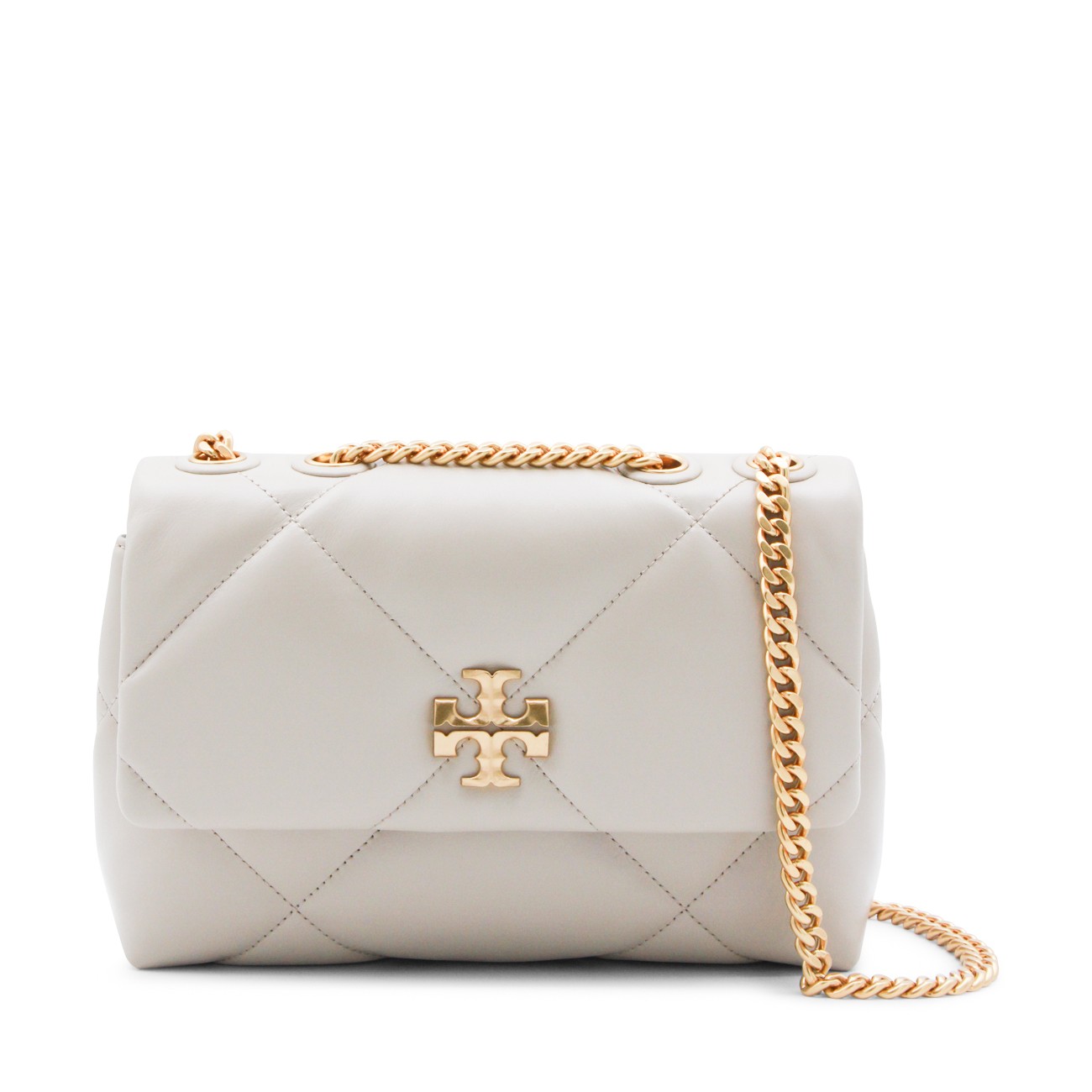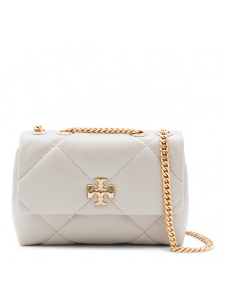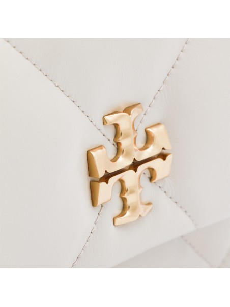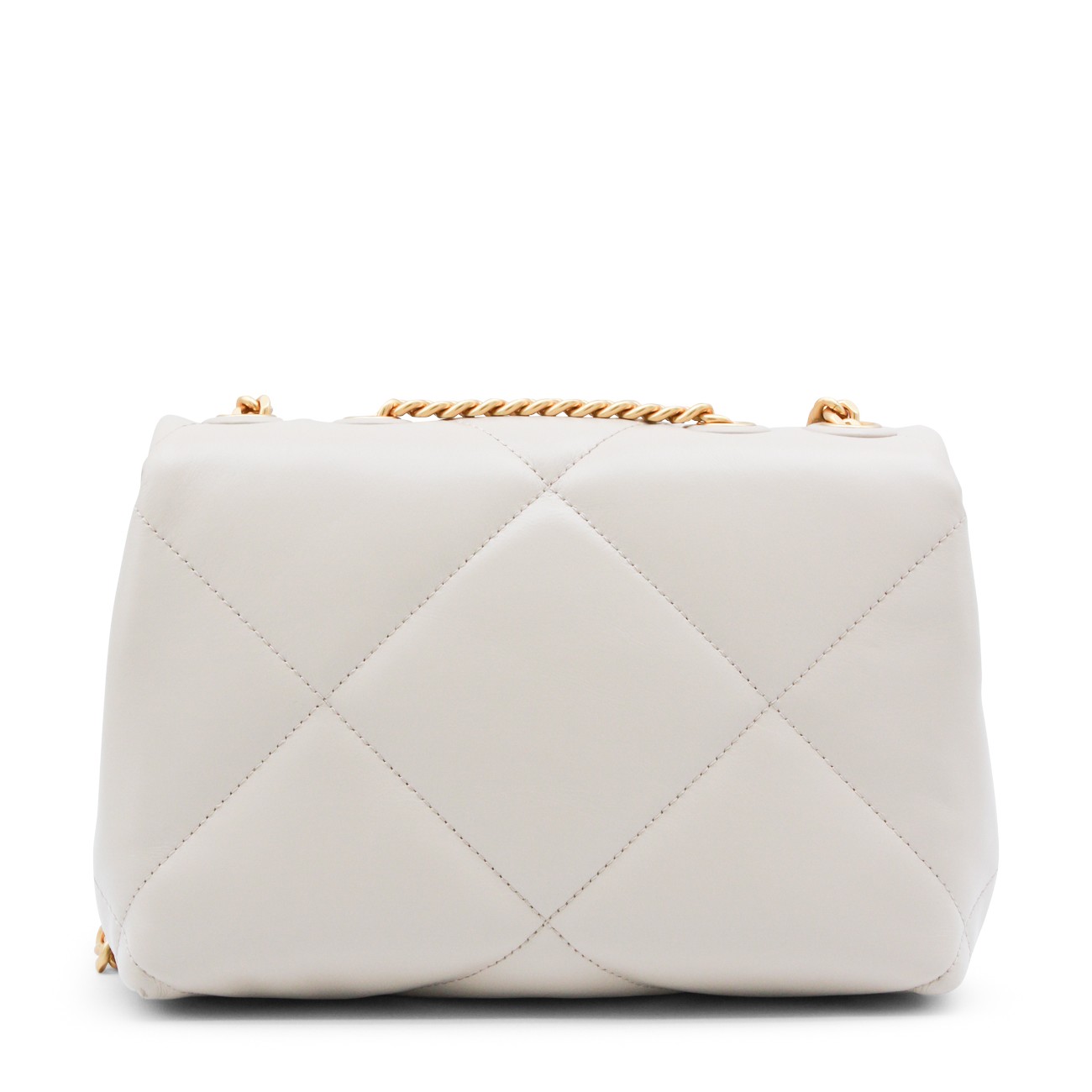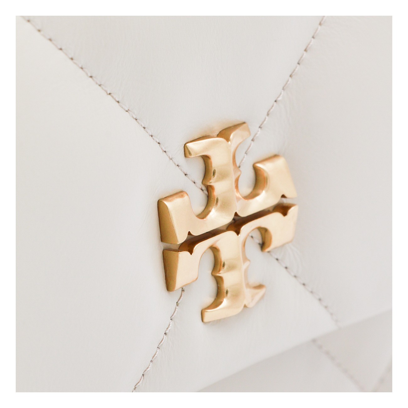 White leather shoulder bag from Tory Burch featuring frontal magneti fastening, gold tone logo and hardware, chain and inside pocket.