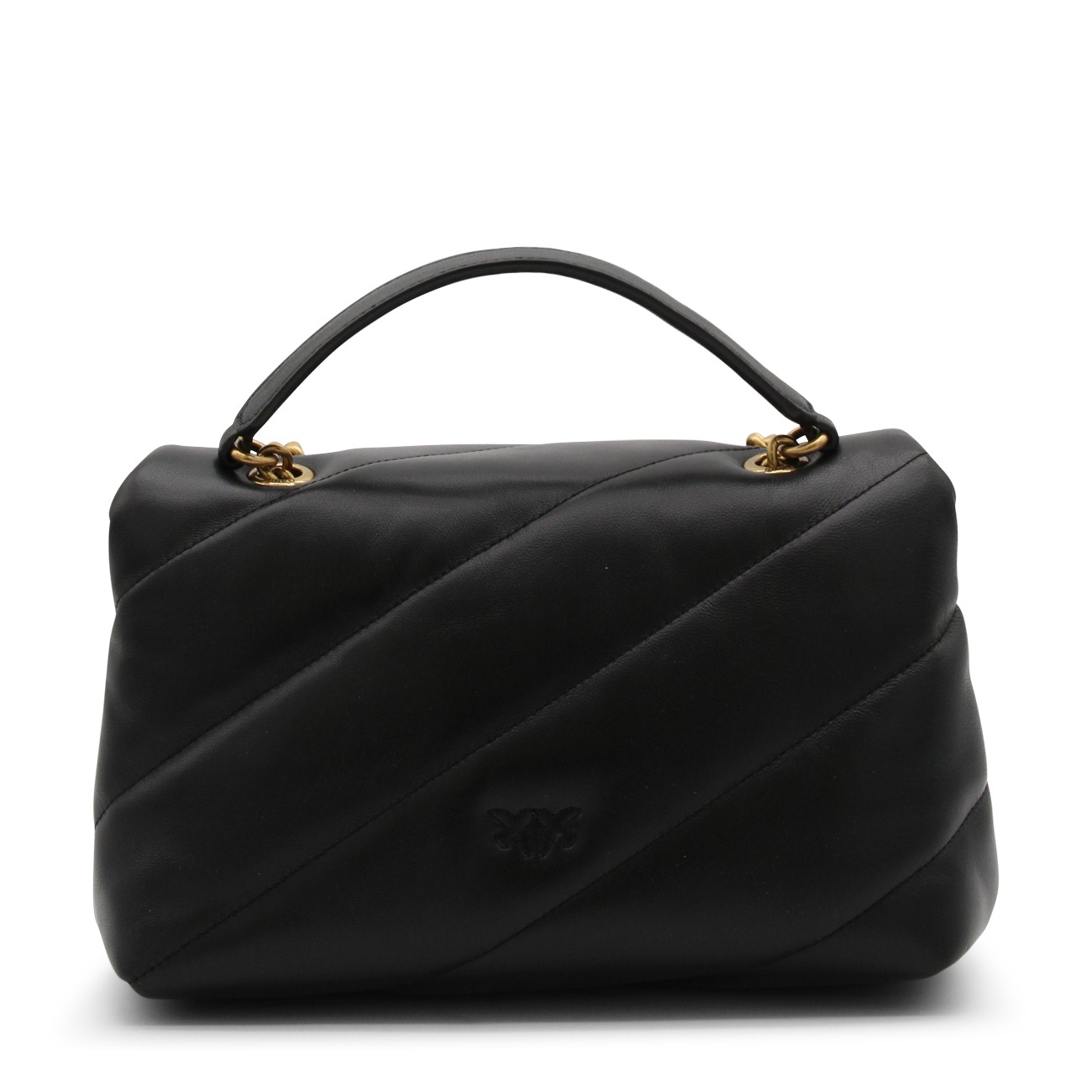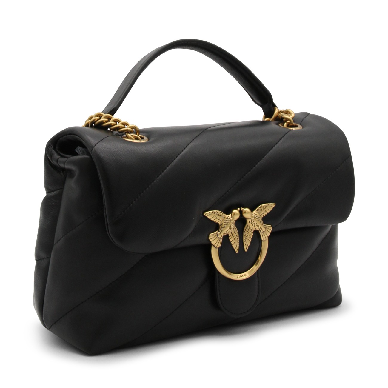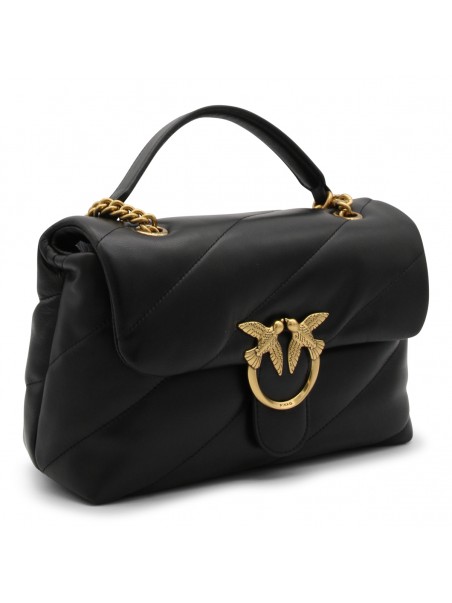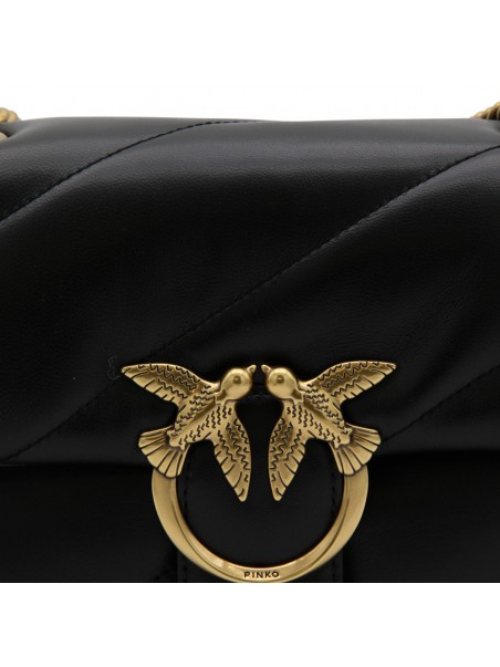 Black leather Love Classic Puff crossbody bag from Pinko featuring signature Love Birds buckle, quilted, front flap closure, internal zip-fastening pocket and chain-link shoulder strap.