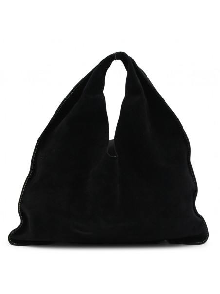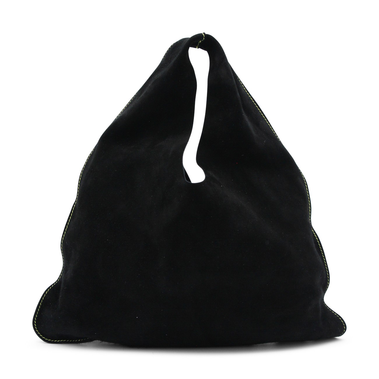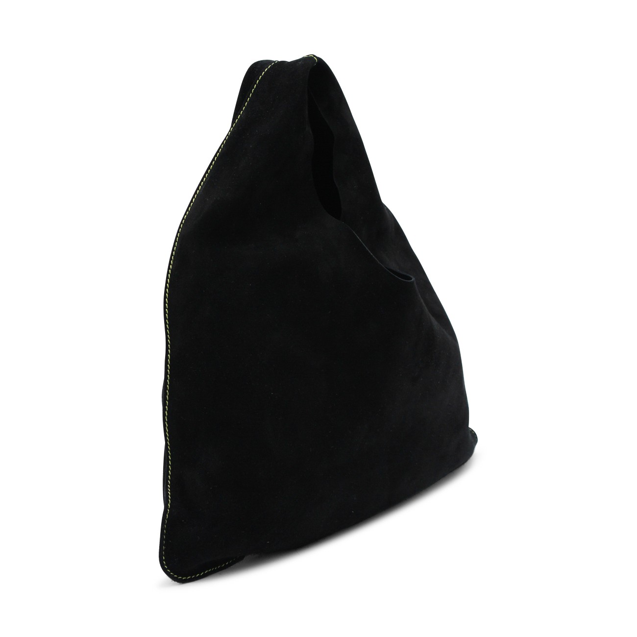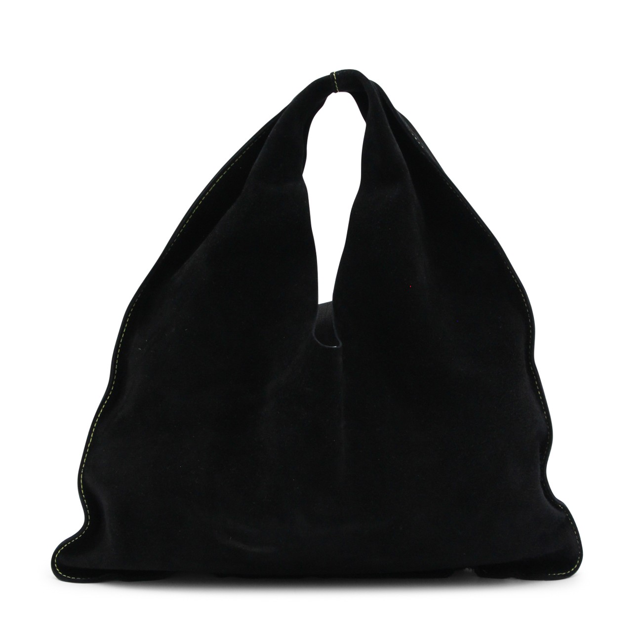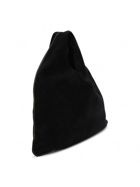 Black leather Bidle small shoulder bag from The Row featuring one top handle, open top, logo and main compartment.