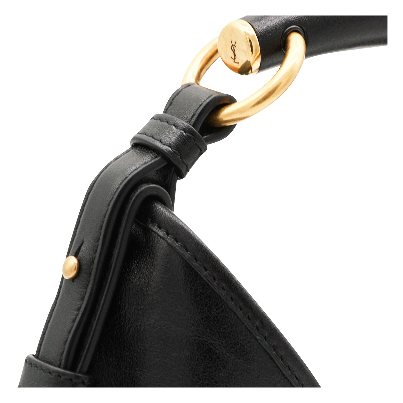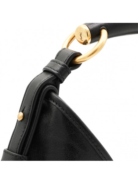 Blac leather small Mombasa shoulder bag from Saint Laurent featuring suede lining, bronze tone hardware, magnetic snap closure, handler frop, calfskin brass and inside pocket.