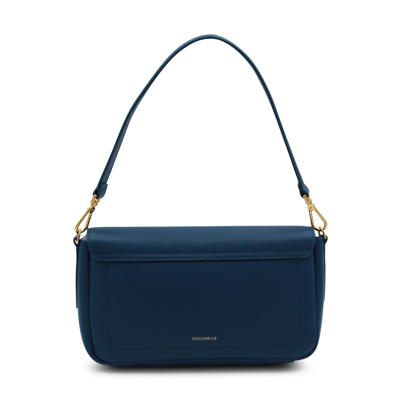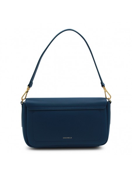 Deep blue leather C-ME Lock shoulder bag from Coccinelle featuring removable top handle, removable and adjustable shoulder strap, gold tone hardware, button closure, internal pocket with zip fastening and gold tone logo hardware.