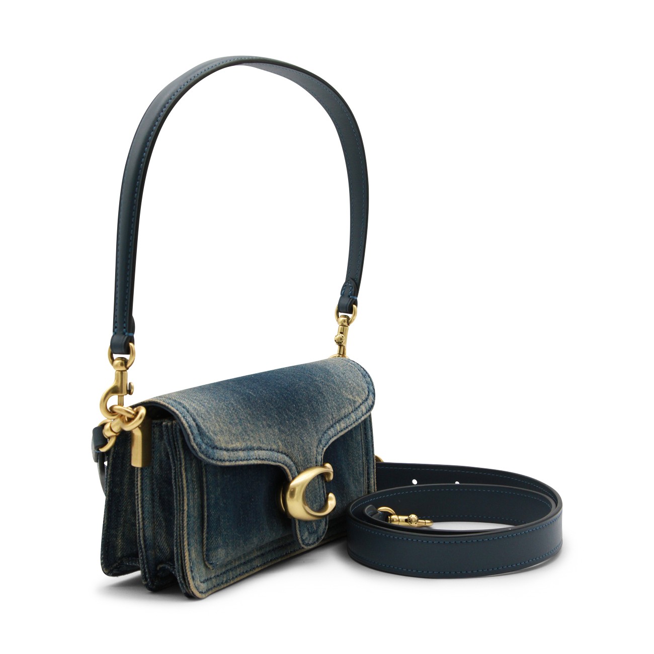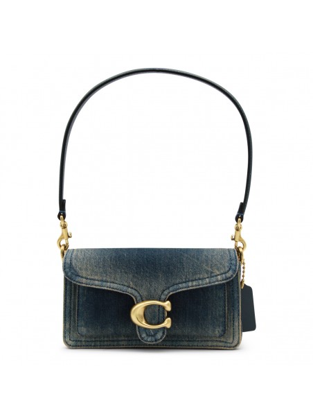 Blue leather 20 Tabby Denim shoulder bag from Coach featuring top handle, gold tone hardware, removable shoulder bag, snap closure, main compartment and pockets.