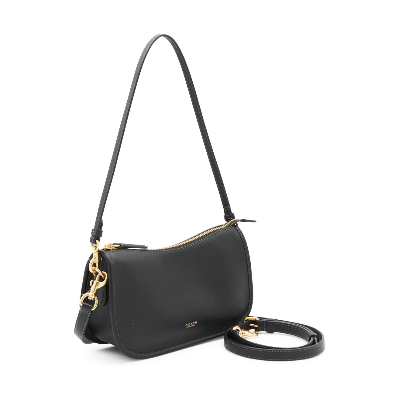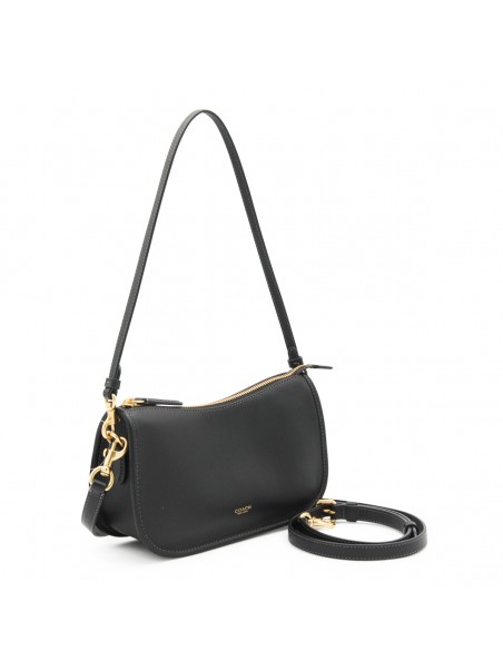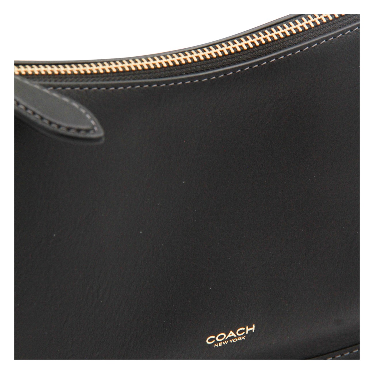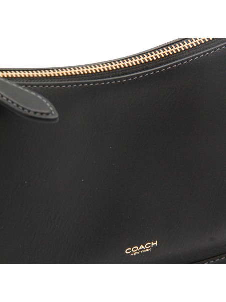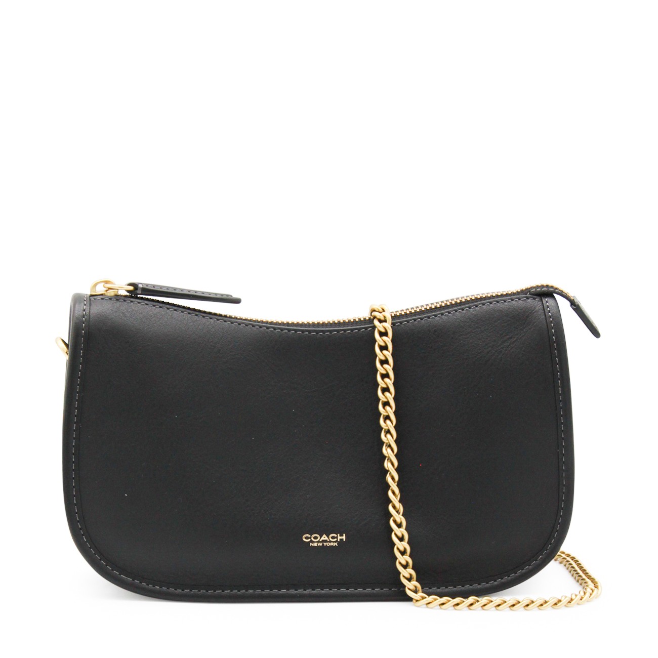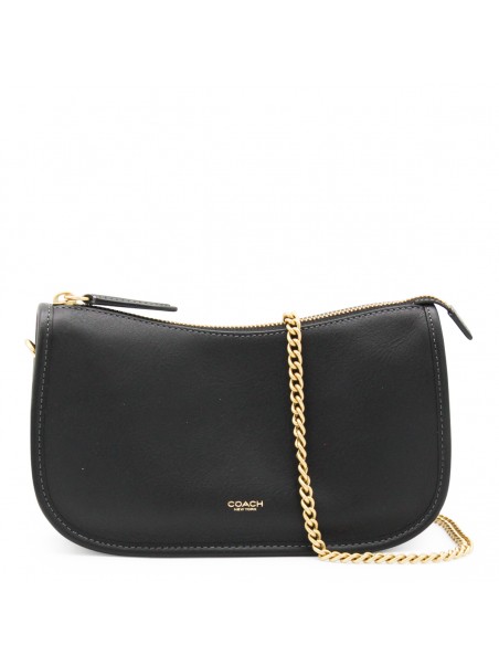 Black leather Waverly shoulder bag from Coach featuring gold tone metal hardware, zip closure, logo plaque at front, main compartment, zipped pocket and detachable shoulder metal chain.
