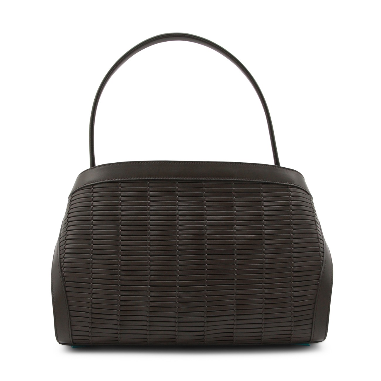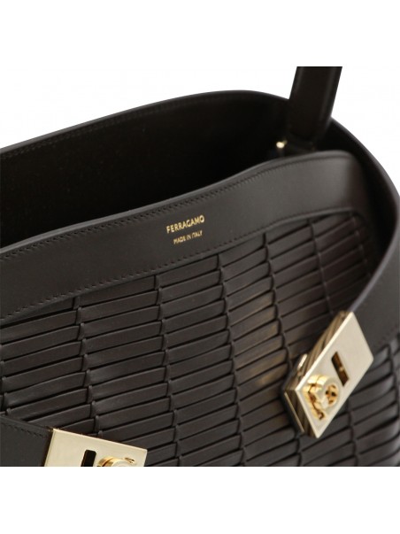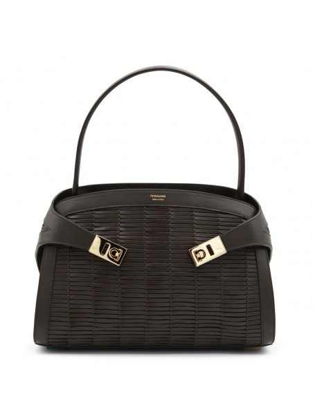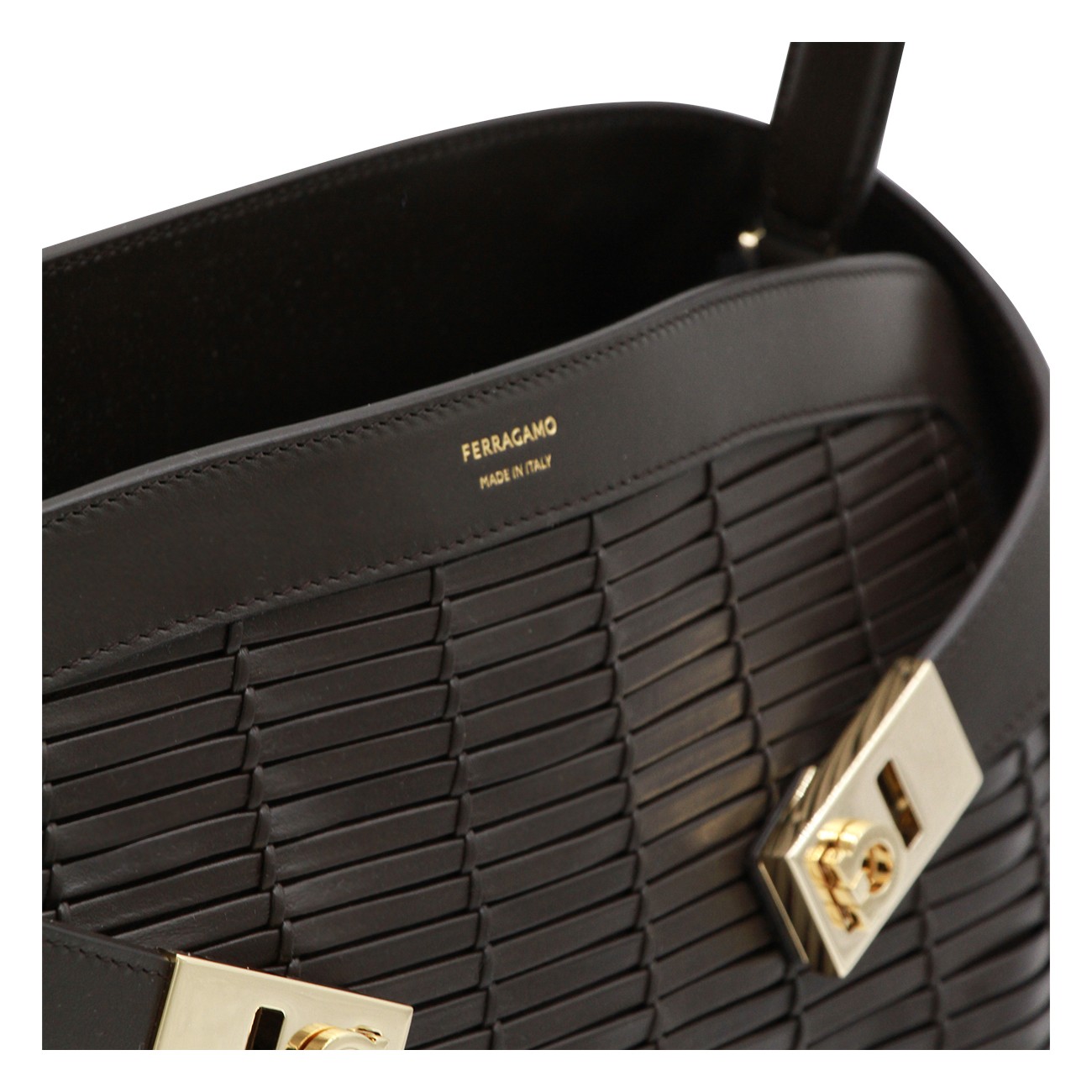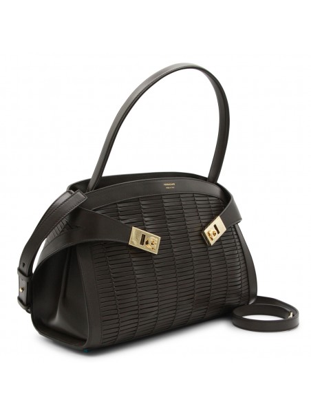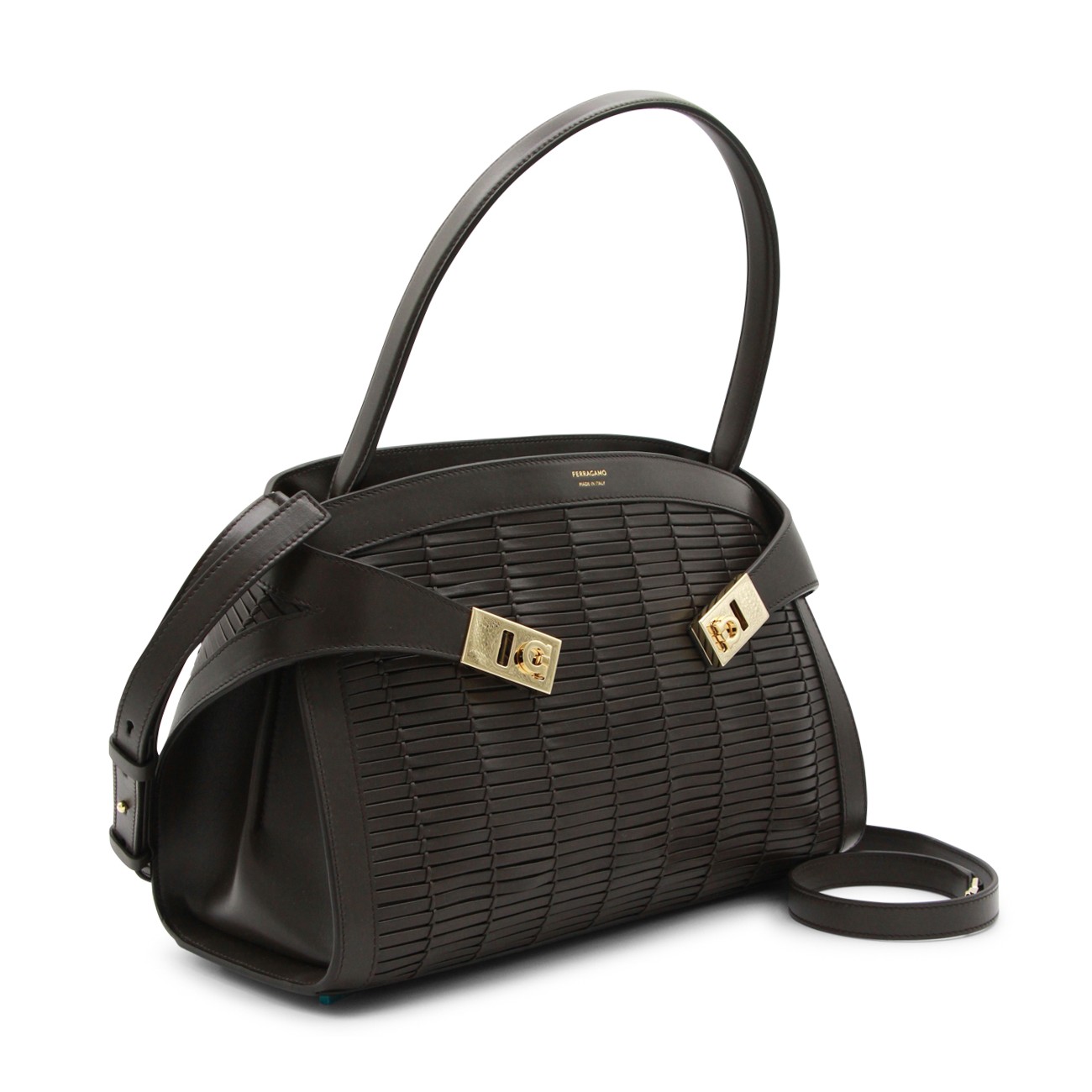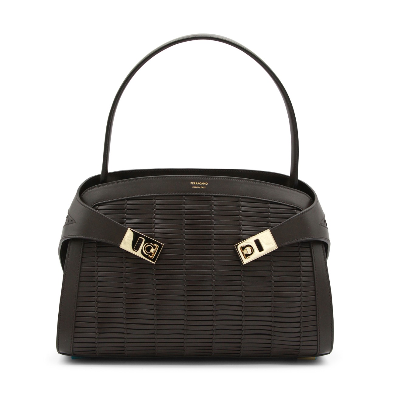 Brown leather Hug shoulder bag from Ferragamo featuring single handle, embossed logo at front, main compartment and gold tone metal hardware.