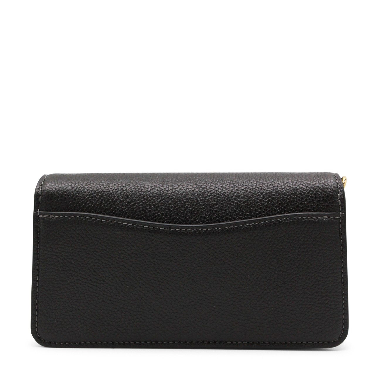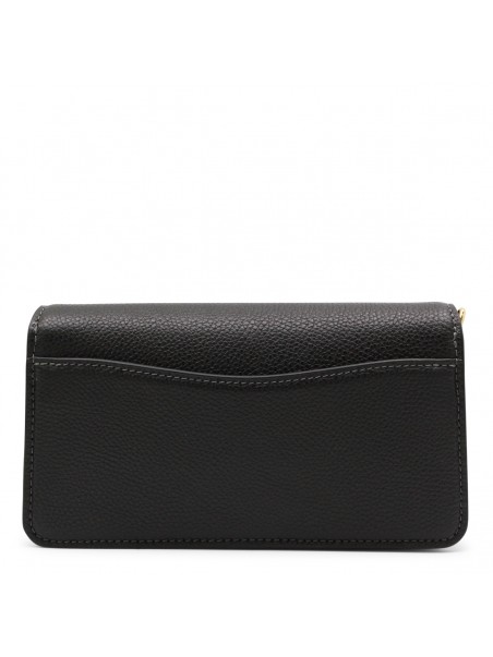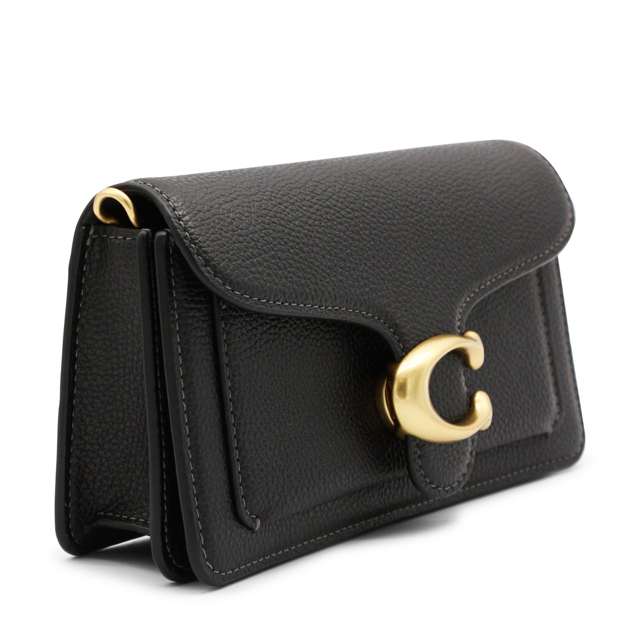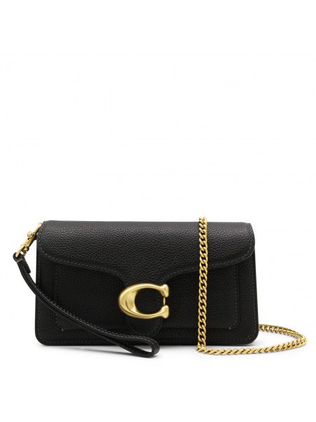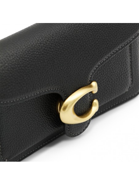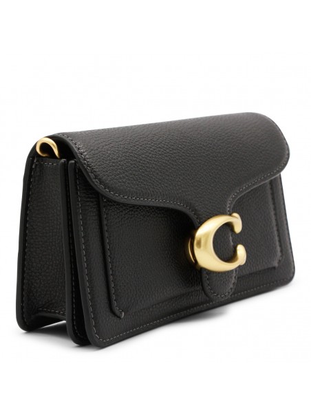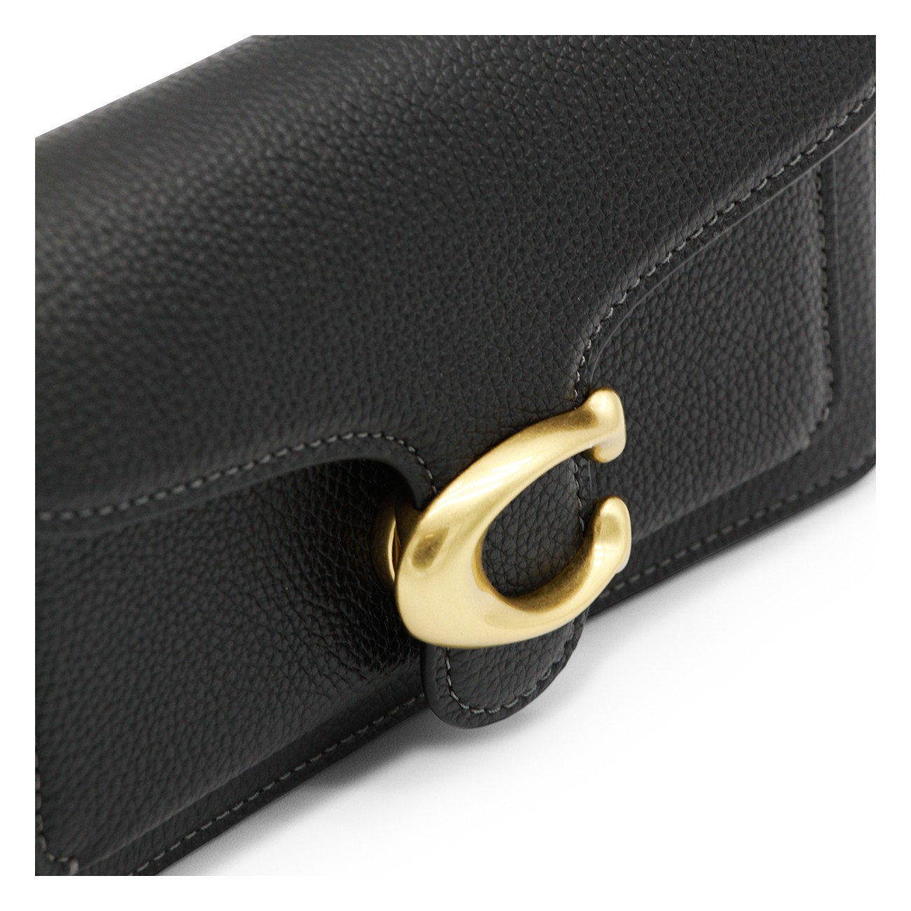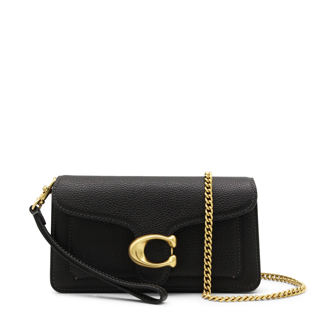 Black leather Tabby crossbody bag from Coach featuring chain shoulder strap, gold tone metal hardware, flat with magnetic closure and main compartment.
