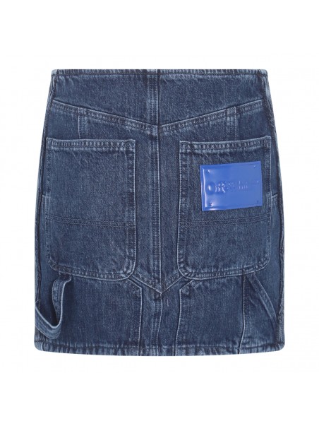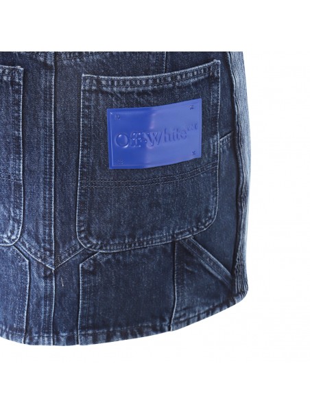 Dark blue cotton blend denim skirt from Off-White featuring high-rise, cut-out at front, decorative seaming, two patch pockets, rear leather logo patch and straight hem.