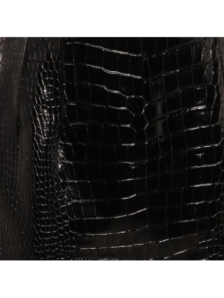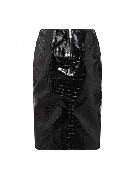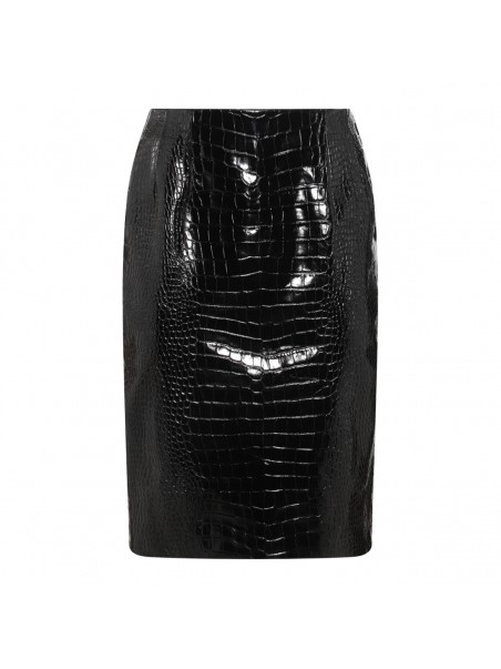 Black leather midi skirt from Versace featuring cocco effect, midi length and back zip fastening.