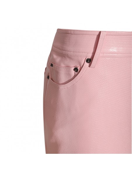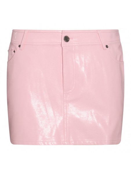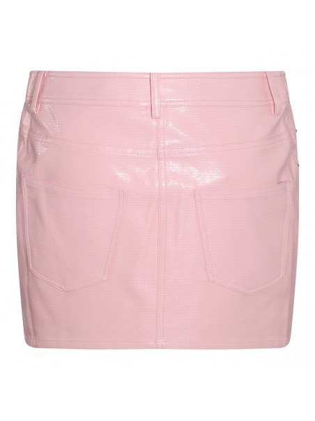 Pink vynil mini skirt from Rotate featuring mini length, belt loops, classic five pockets, zip closure fastening and button closure and all over vynil texture.
