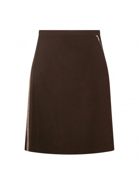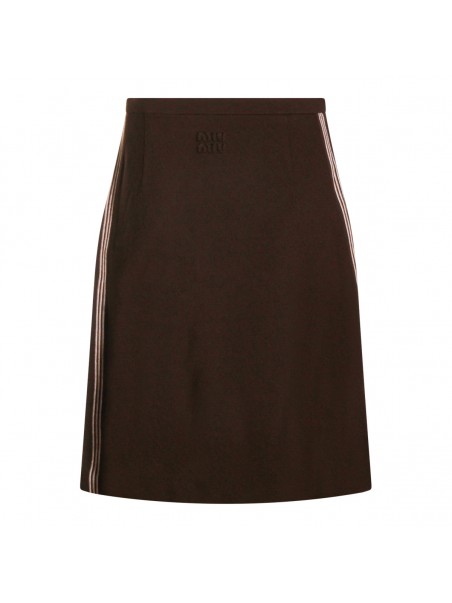 Brown skirt from Miu Miu featuring high waist, back zip closure, lateral bands, lettering logo and midi lenght.
